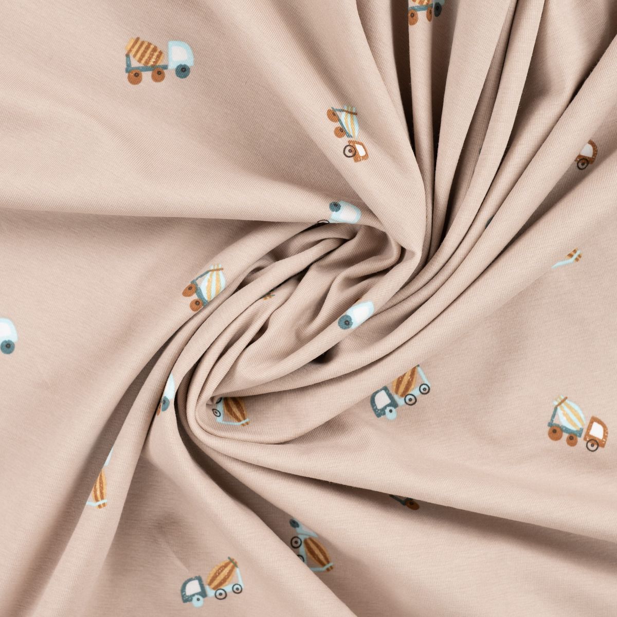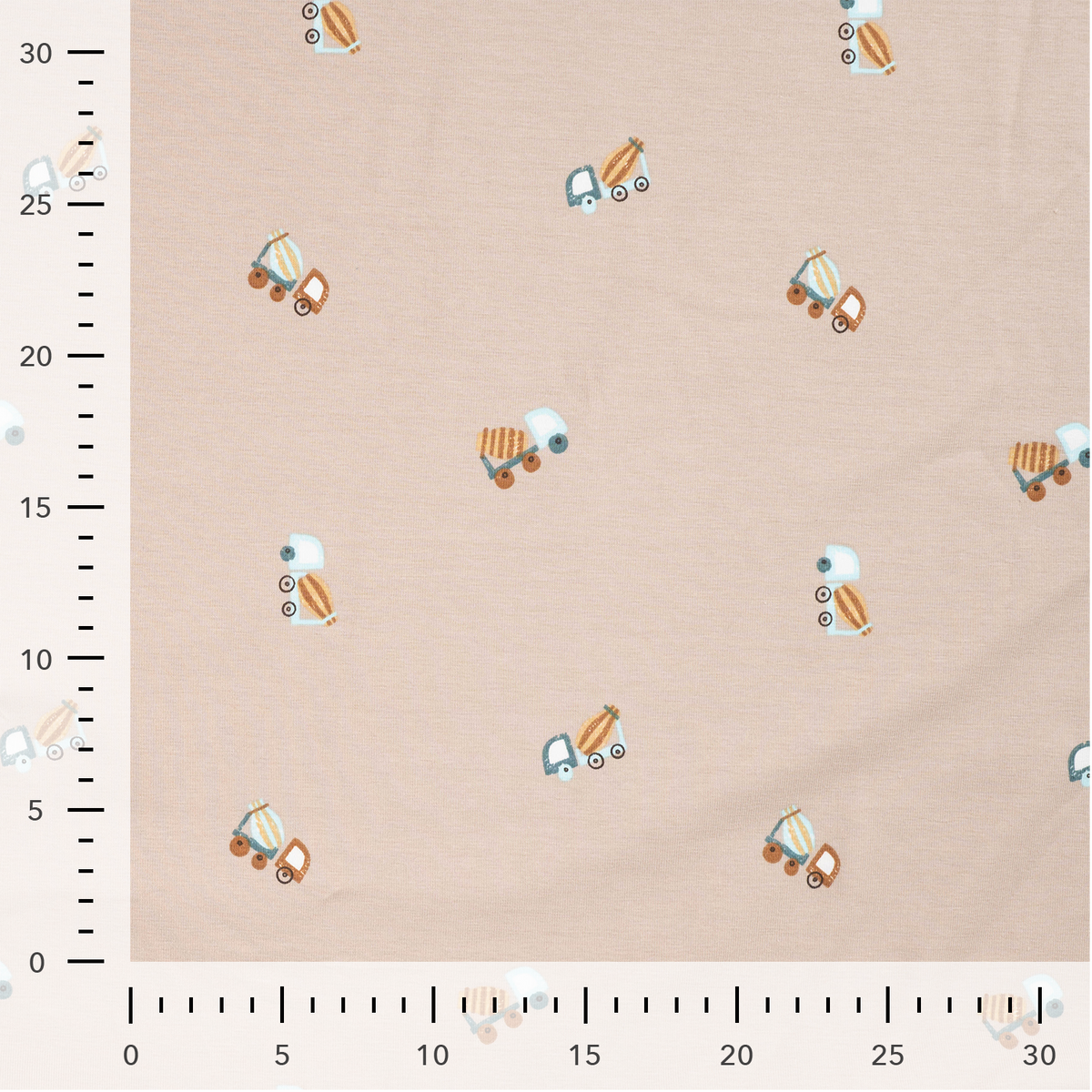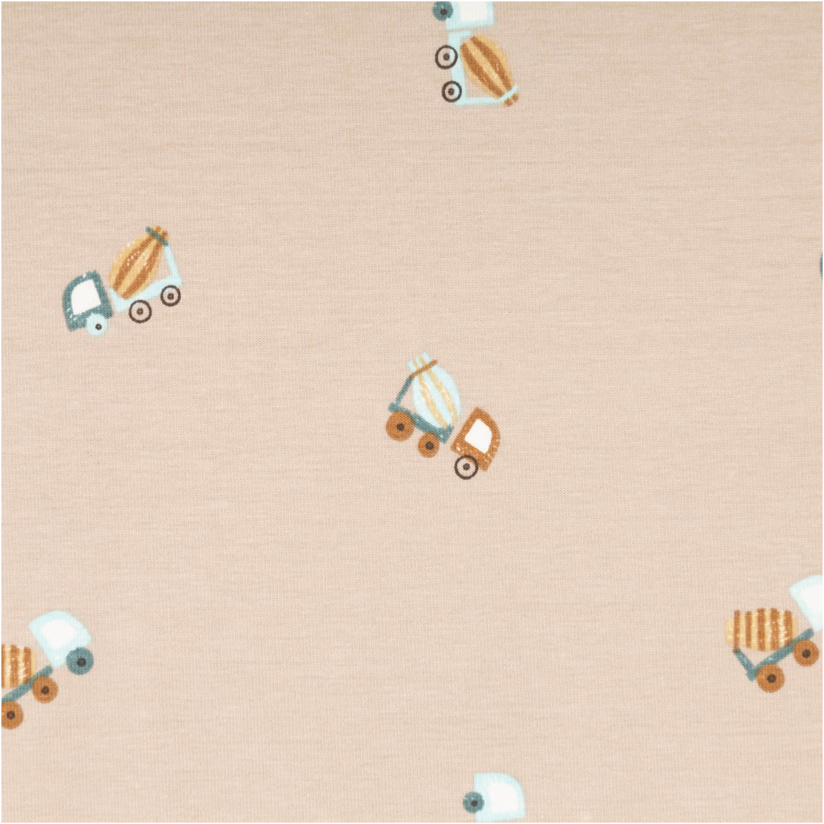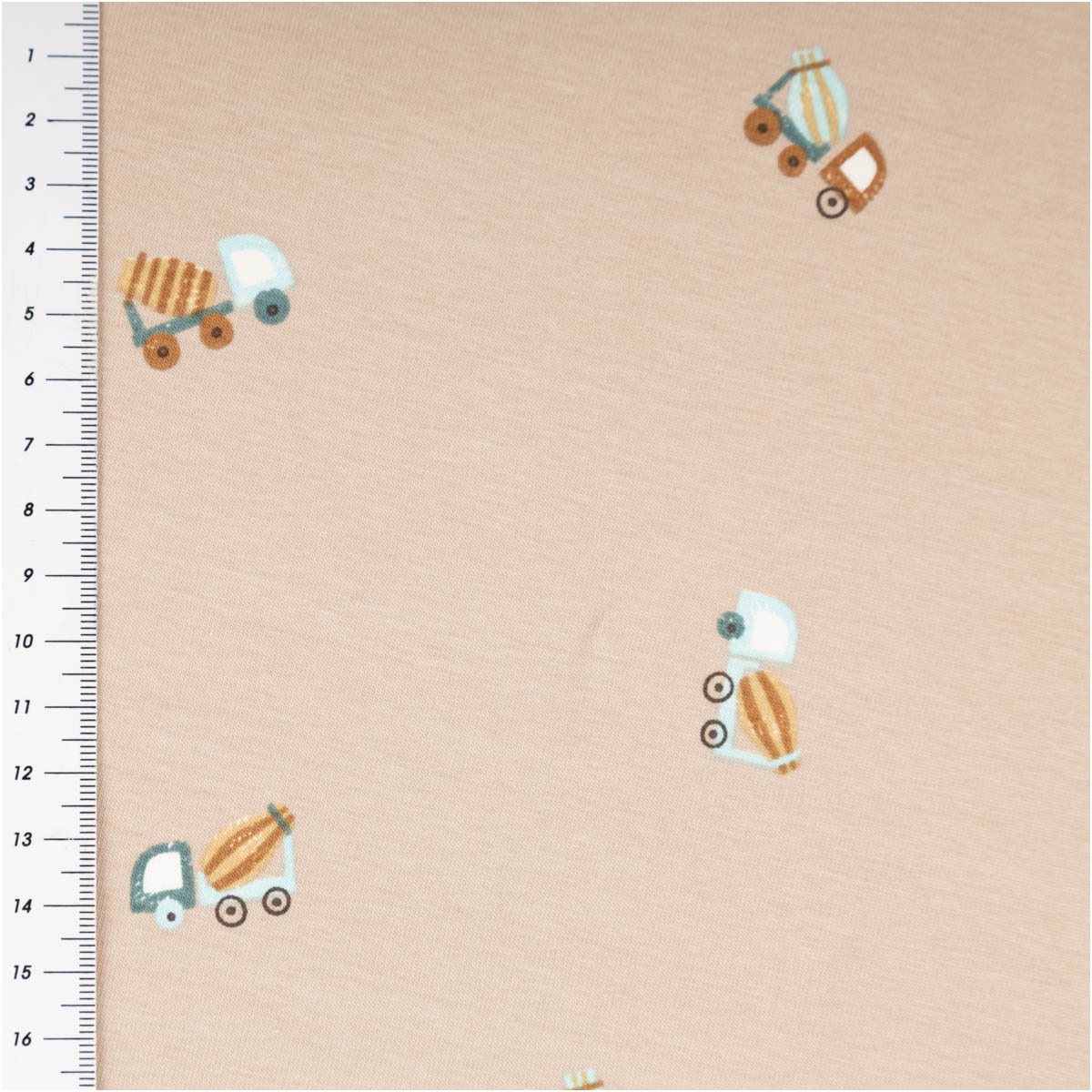 Du liebst Fahrzeugmotive, willst aber einen Stoff, der trotzdem ruhig wirkt und sich leicht kombinieren lässt? Dieser Baumwolljersey mit Betonmischern bringt kleine Baustellenfahrzeuge in sanften Farben auf einen sandfarbenen Hintergrund. Das Ergebnis: ein moderner Kinderlook, der nicht überdreht wirkt, aber sofort begeistert.
