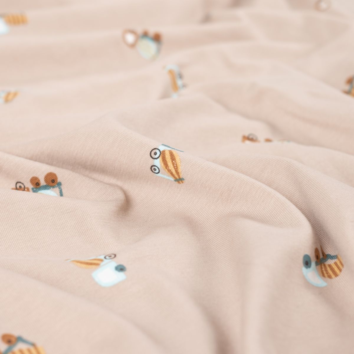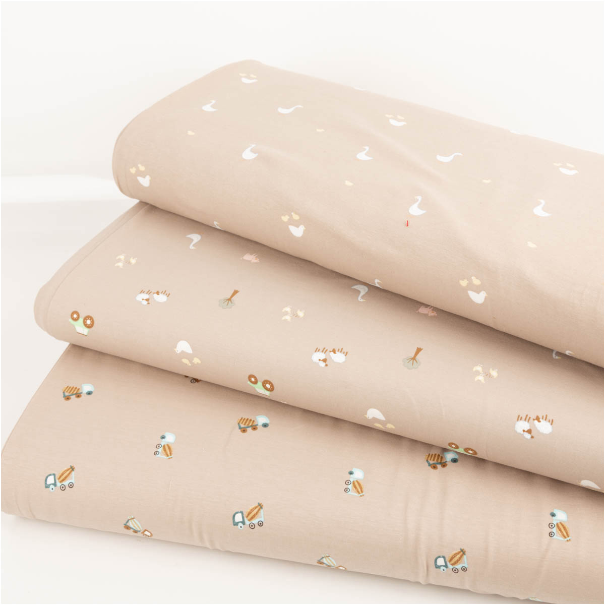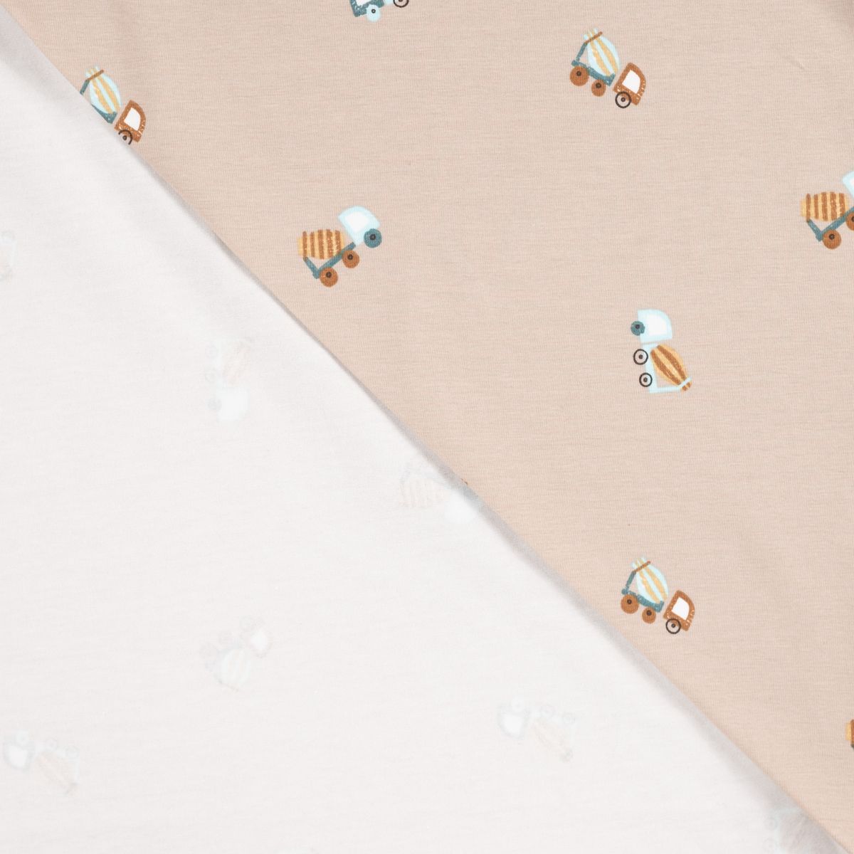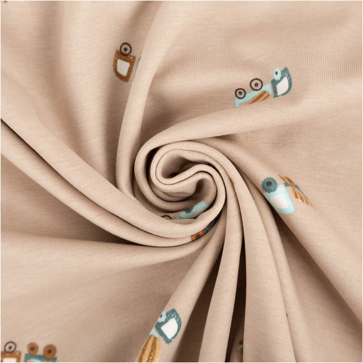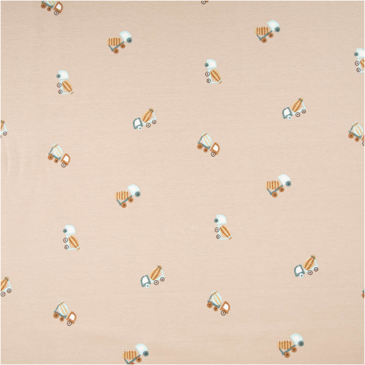 Du liebst Fahrzeugmotive, willst aber einen Stoff, der trotzdem ruhig wirkt und sich leicht kombinieren lässt? Dieser Baumwolljersey mit Betonmischern bringt kleine Baustellenfahrzeuge in sanften Farben auf einen sandfarbenen Hintergrund. Das Ergebnis: ein moderner Kinderlook, der nicht überdreht wirkt, aber sofort begeistert.