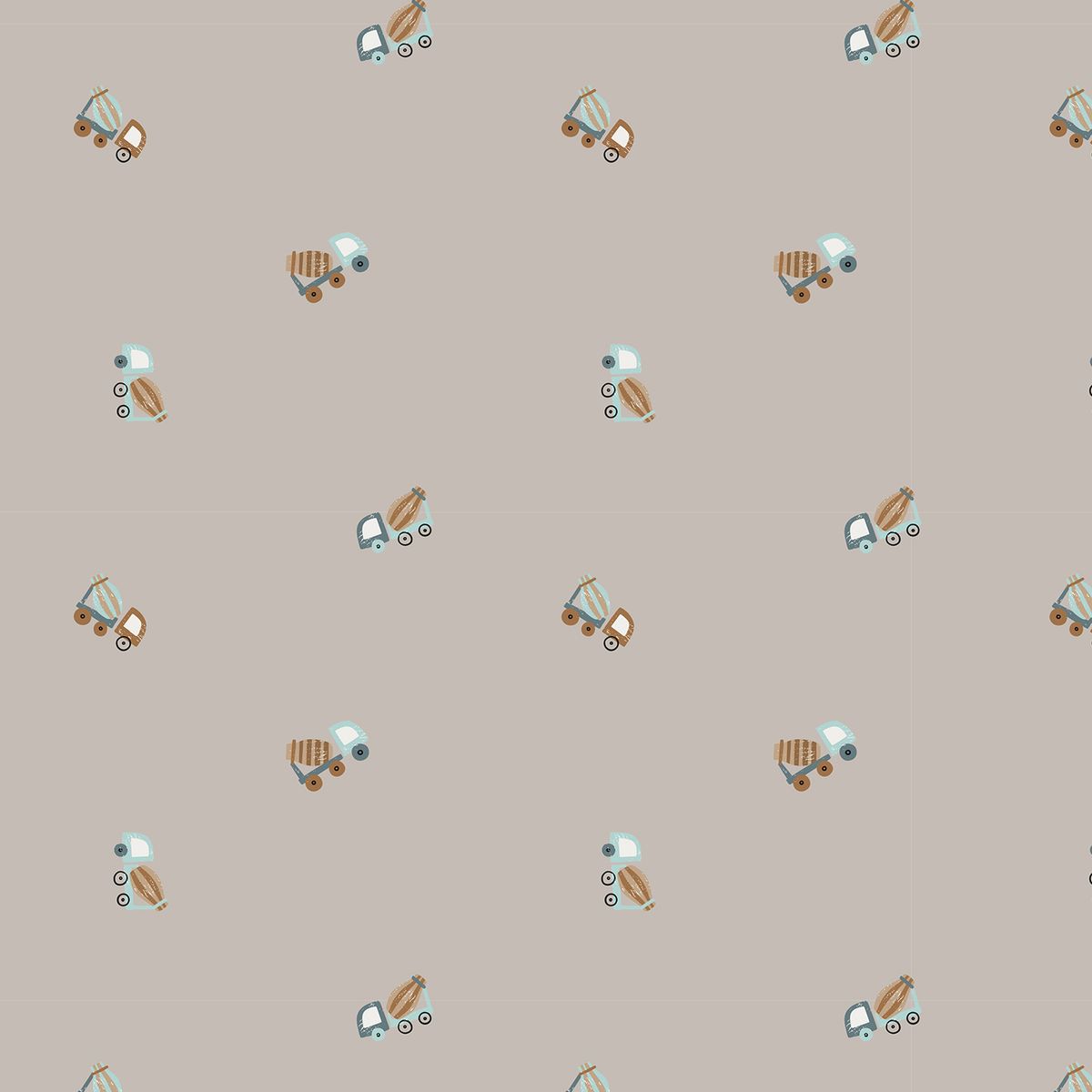 Betonmischer-Motiv: kleine Baustellenfahrzeuge in sanften Farben auf sandfarbenem Grund, modern und kinderfreundlich