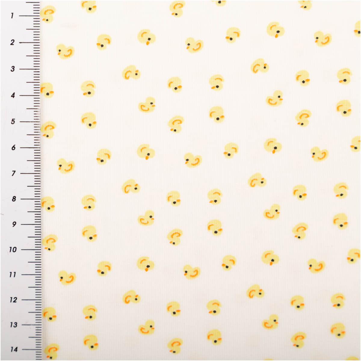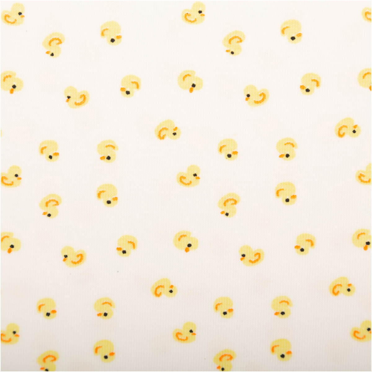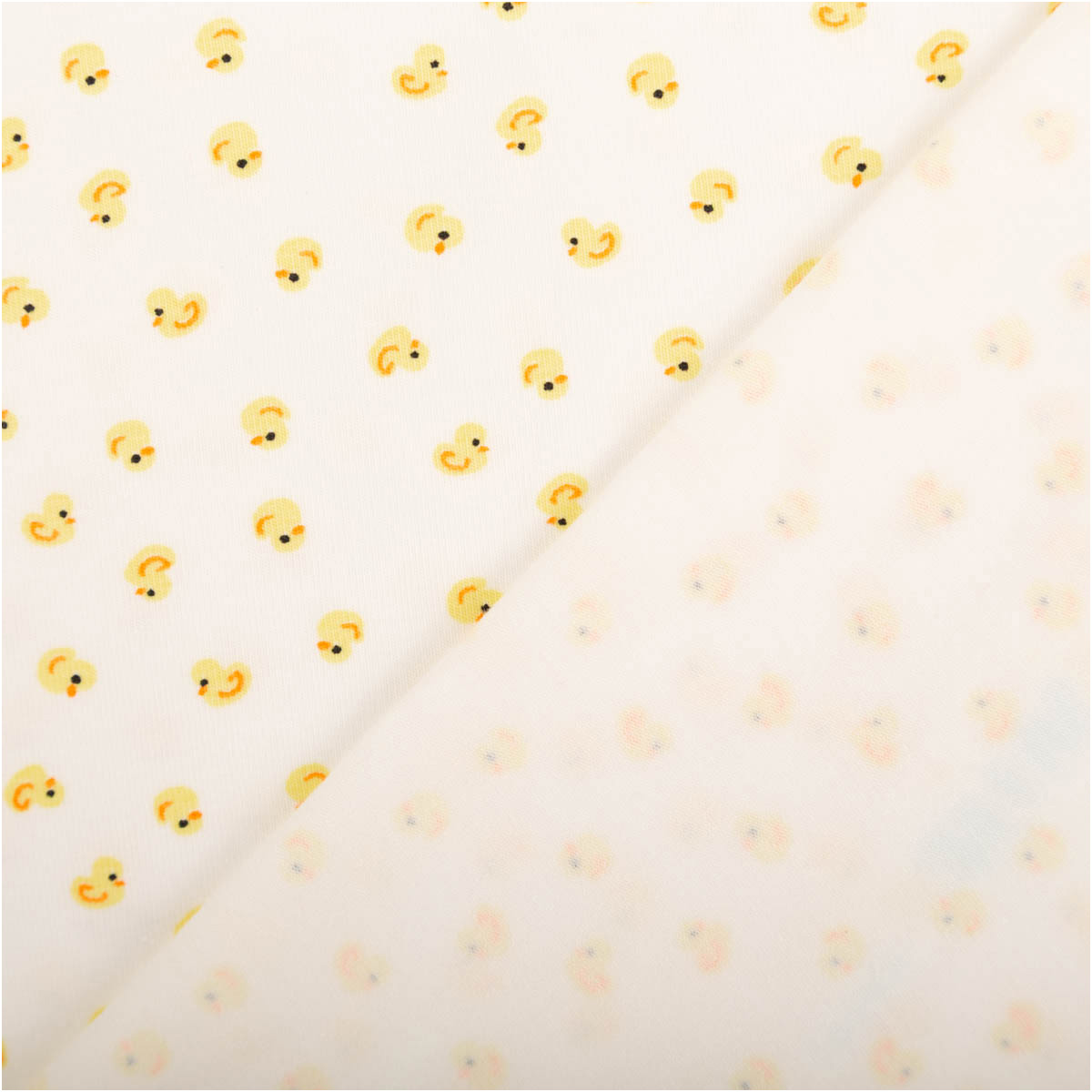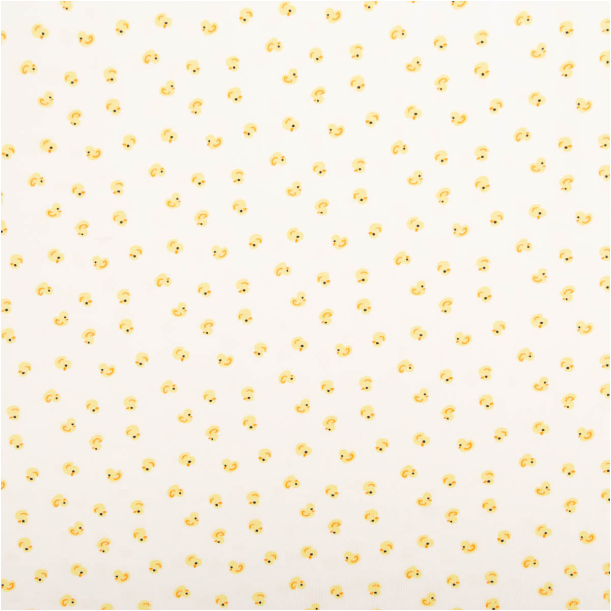 Fröhliches Entchenmuster: kleine gelbe Entchen auf weißem Grund – dezent, hell und perfekt für Baby- und Kinderlooks.