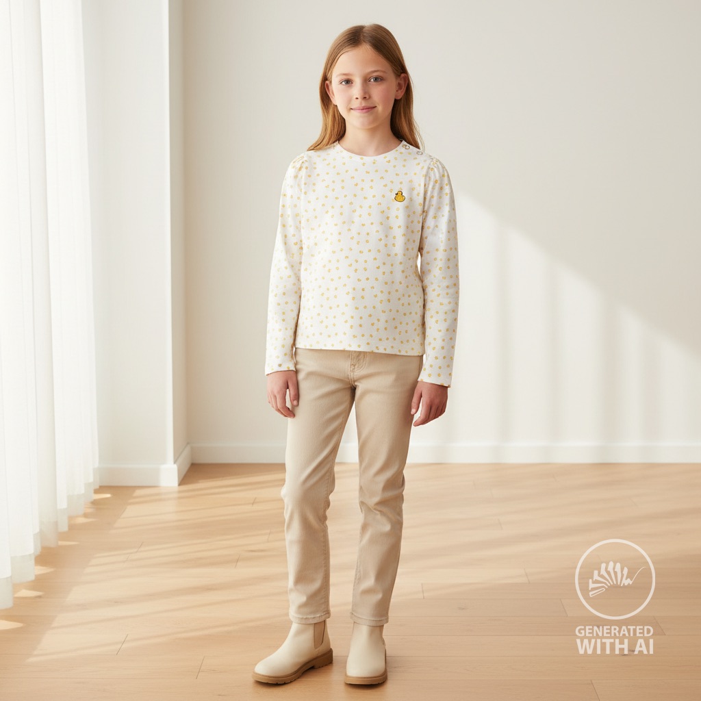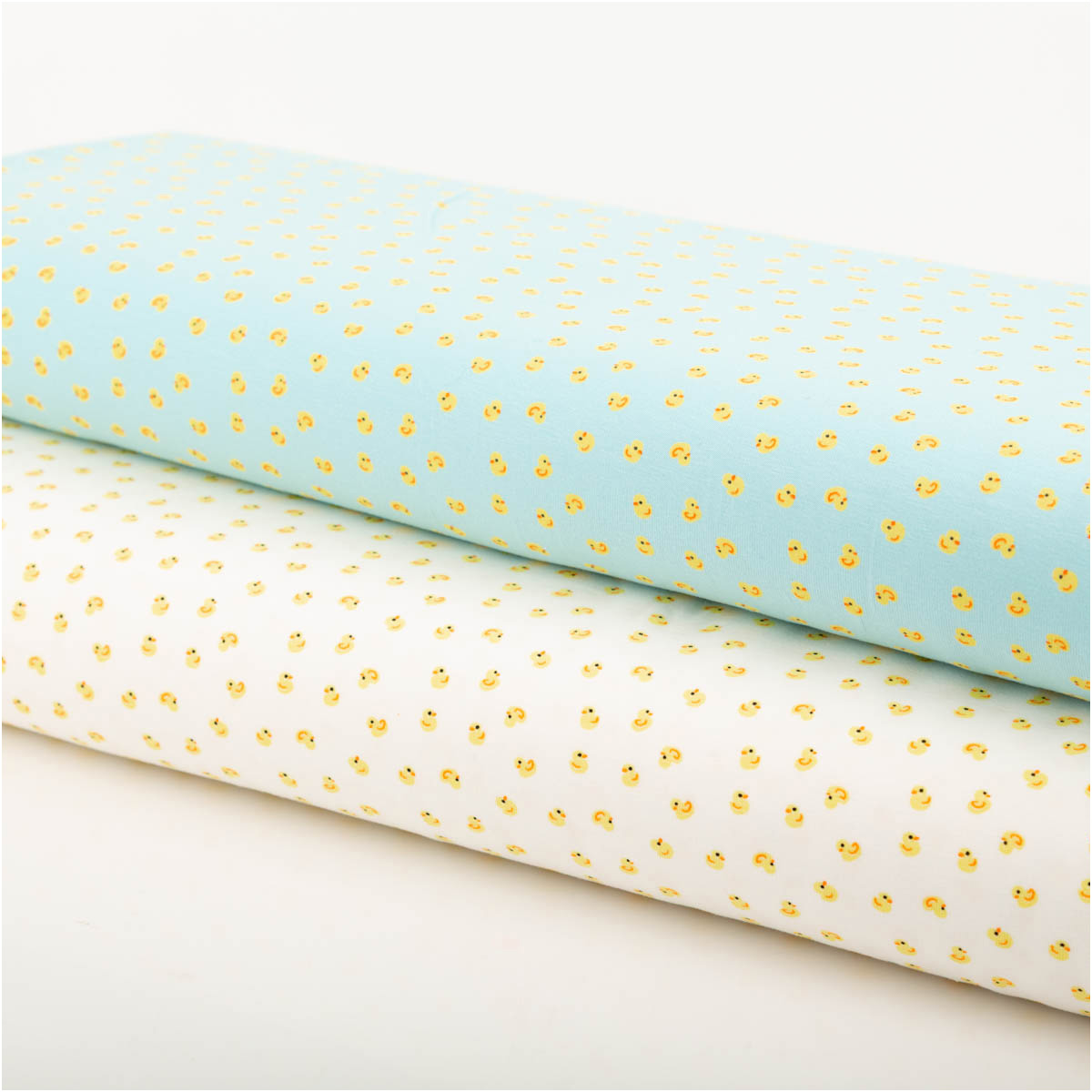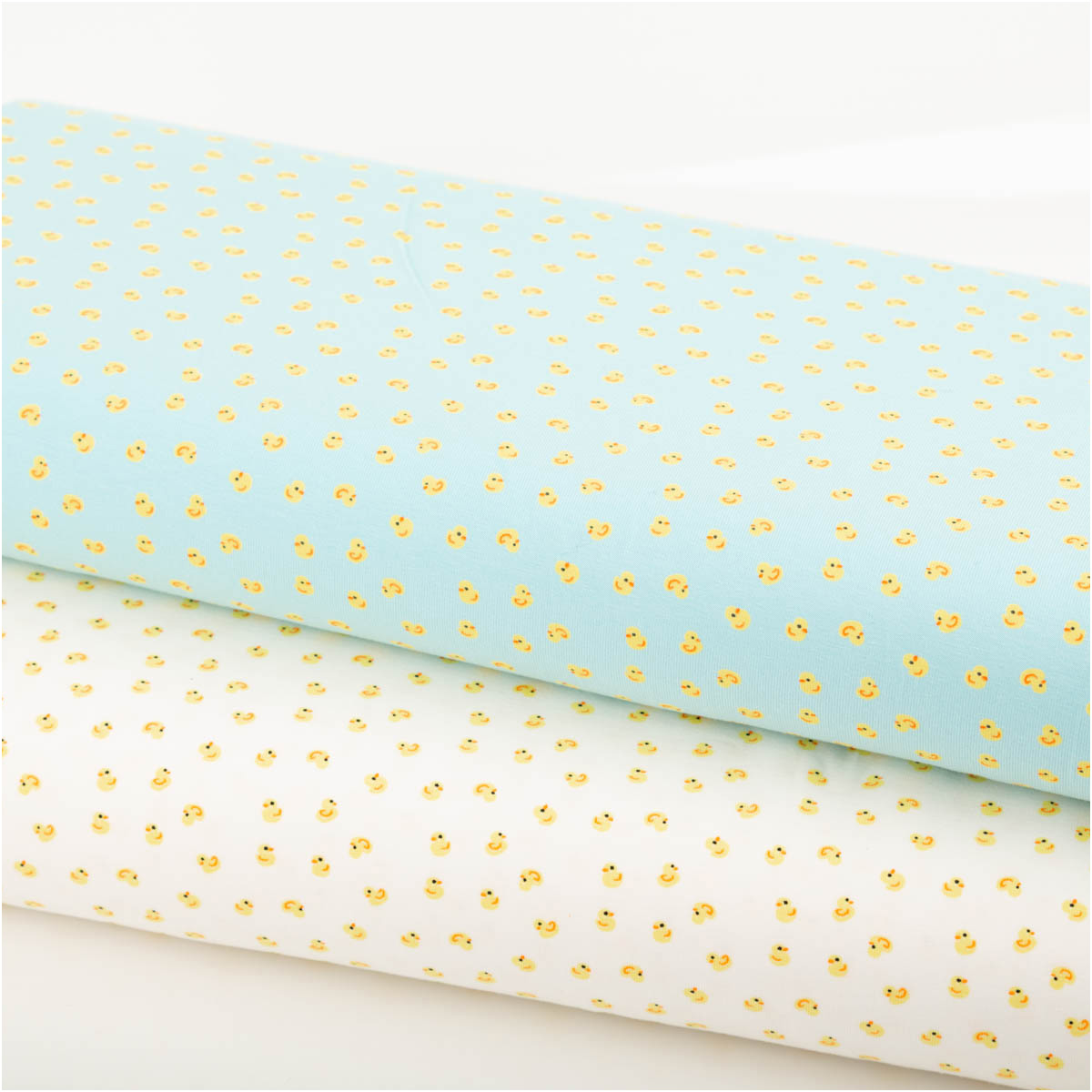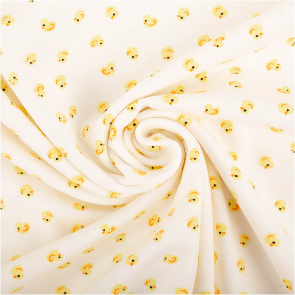 Fröhliches Entchenmuster: kleine gelbe Entchen auf weißem Grund – dezent, hell und perfekt für Baby- und Kinderlooks.