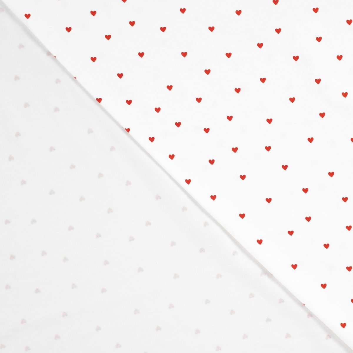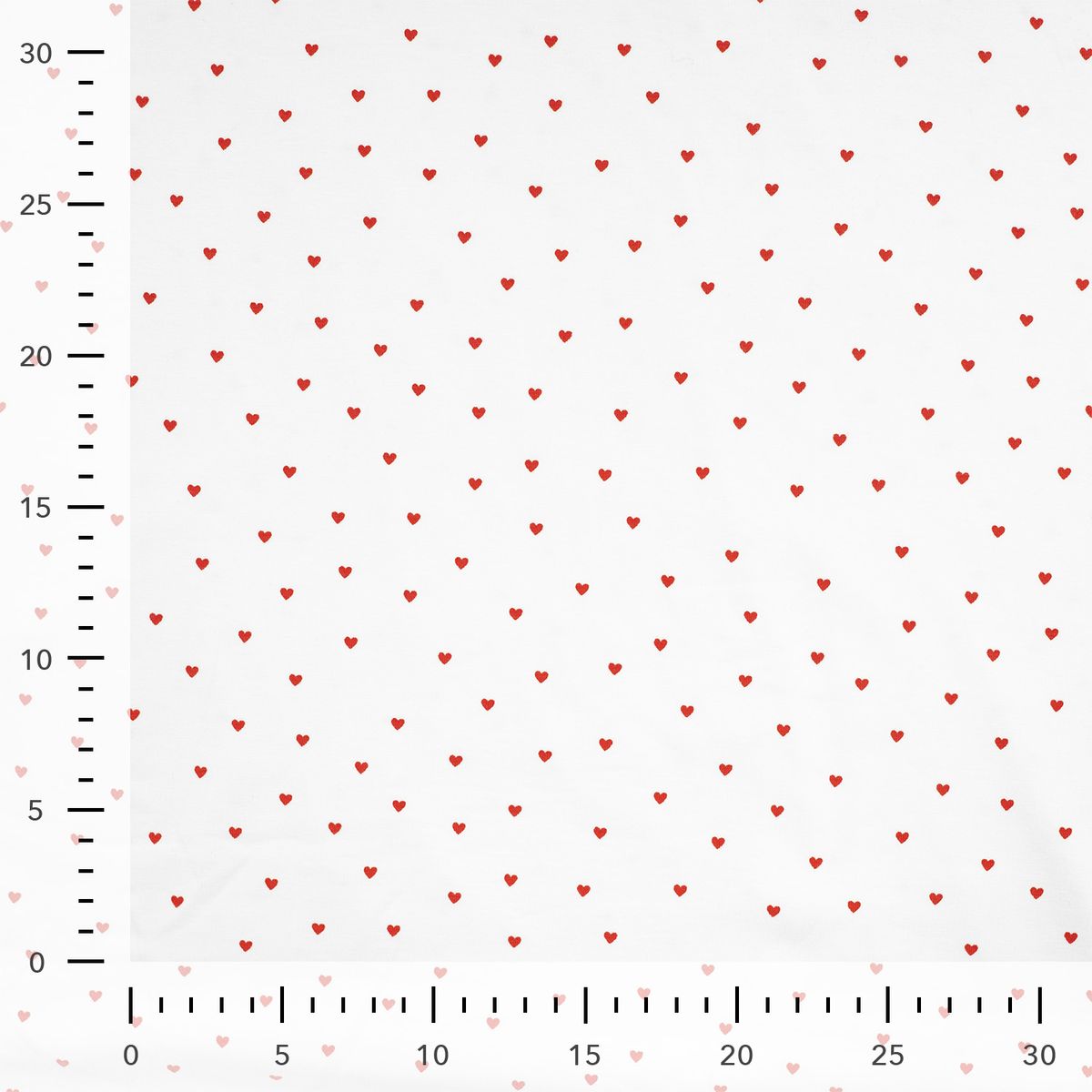 Dieser Jersey Stoff aus Baumwolljersey verbindet angenehmen Tragekomfort mit einem zeitlosen, niedlichen Design. Auf dem weißen Grund verteilen sich kleine rote Herzchen, die dem Stoff eine freundliche, zarte und liebevolle Ausstrahlung verleihen. So ist dieser Stoff eine schöne Wahl für bequeme Kleidung, süße Babyoutfits und viele kreative Nähideen.