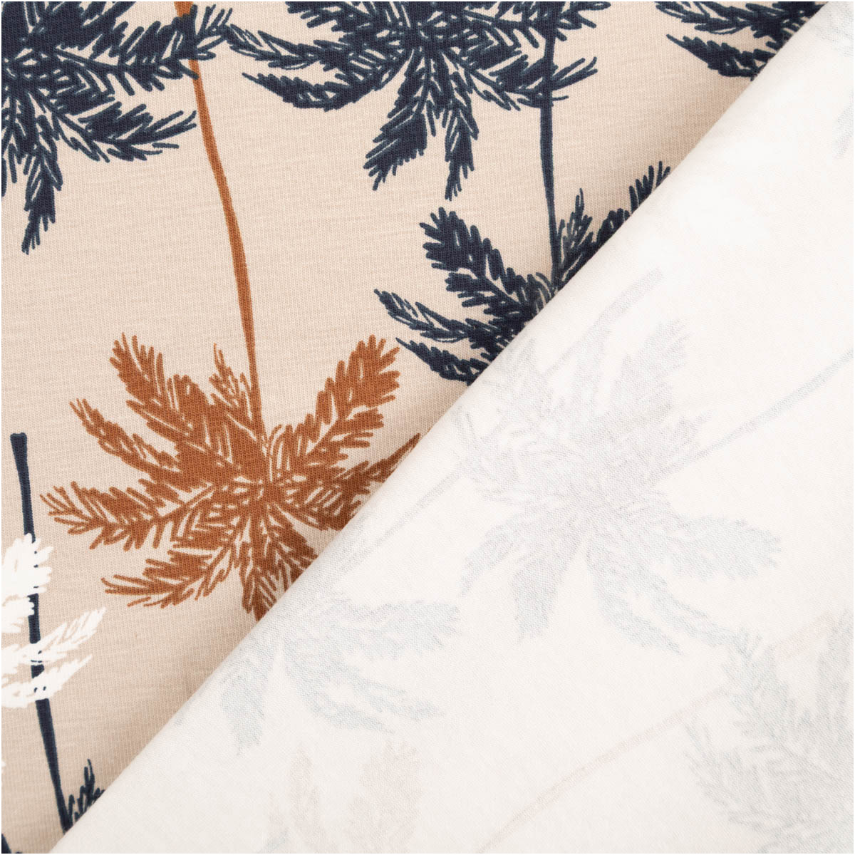 Du möchtest einen Jersey, der weich fällt, bequem sitzt und optisch ruhig wirkt? Dieser Baumwolljersey mit Palmenmotiv in Sand bringt eine natürliche, warme Note in deine Nähprojekte. Das dezente Palmen-Design ist ideal, wenn du ein modernes Muster suchst, das sich leicht kombinieren lässt. Durch die typische Jersey-Elastizität eignet sich der Stoff perfekt für Kleidung, die du gern und oft trägst.