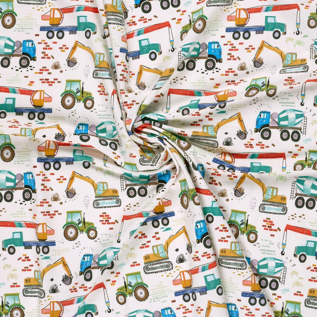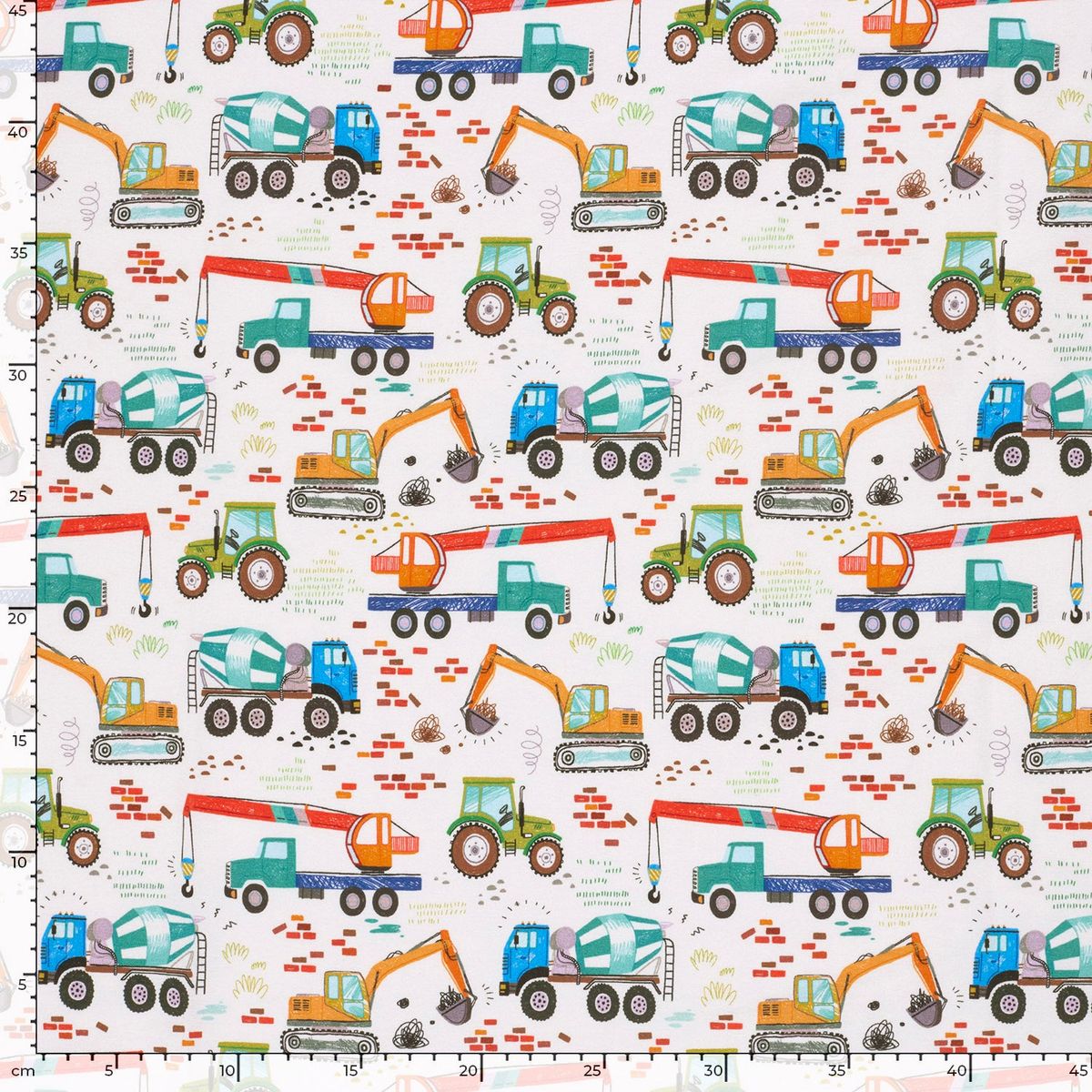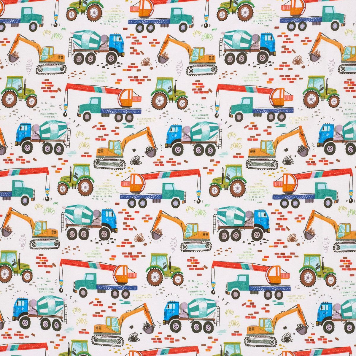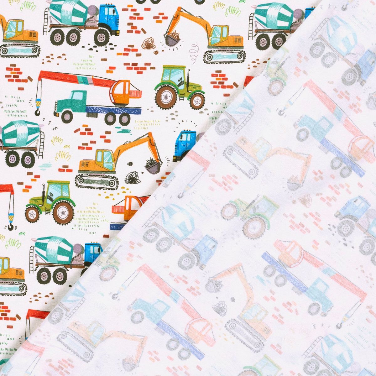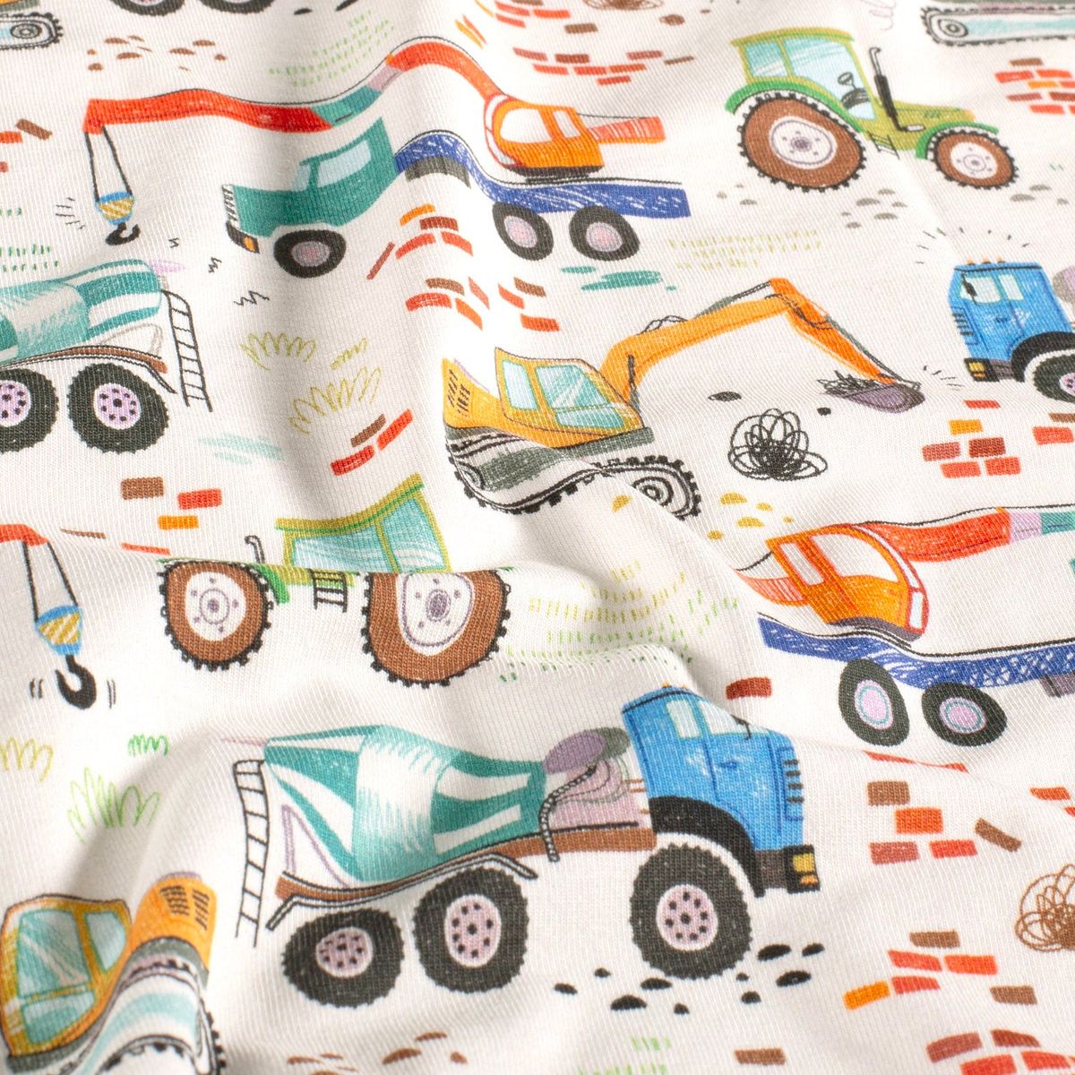 Das fröhliche Baufahrzeuge-Motiv macht ihn besonders attraktiv für Kinderkleidung, lässt sich aber auch vielseitig kombinieren.