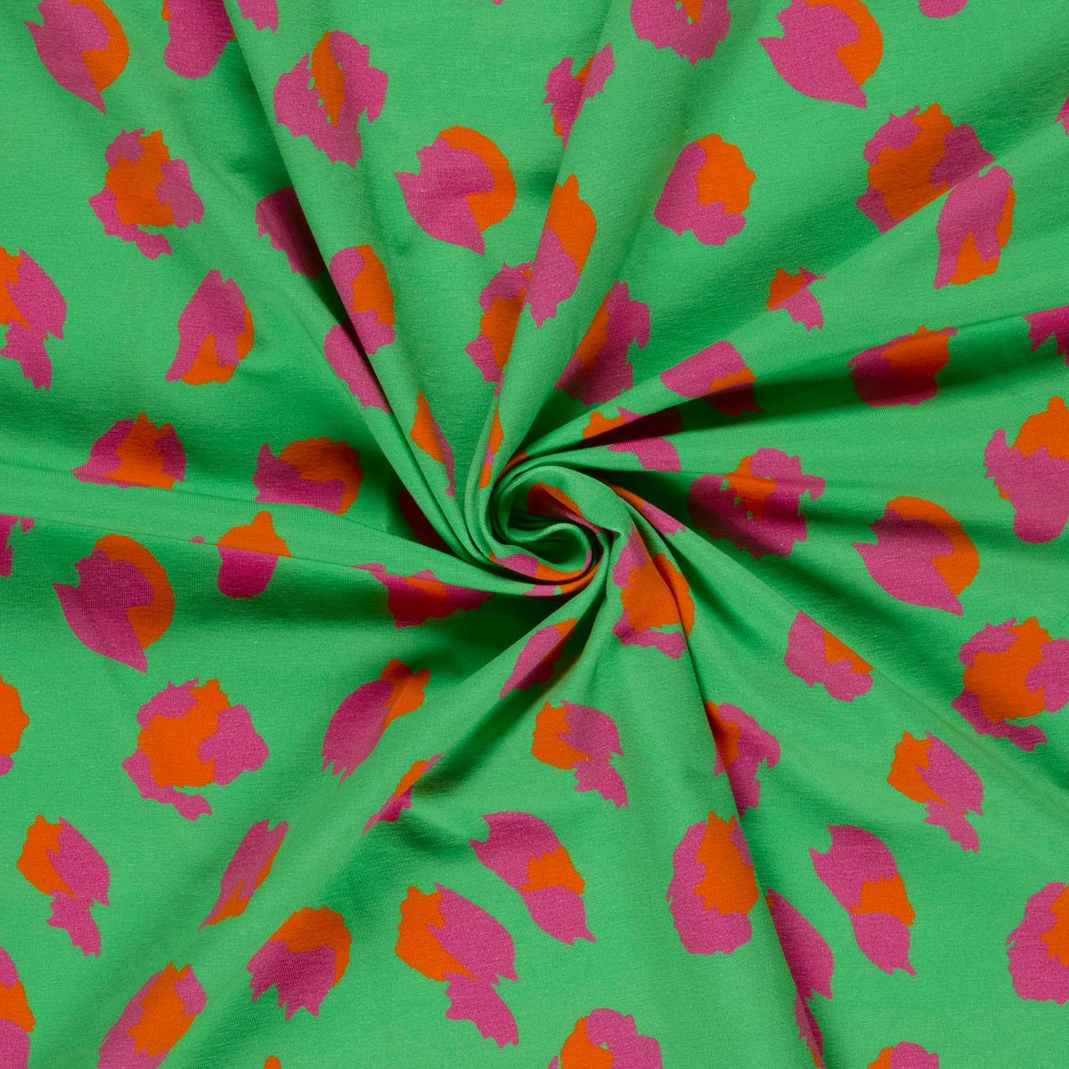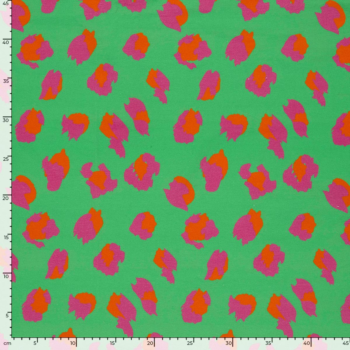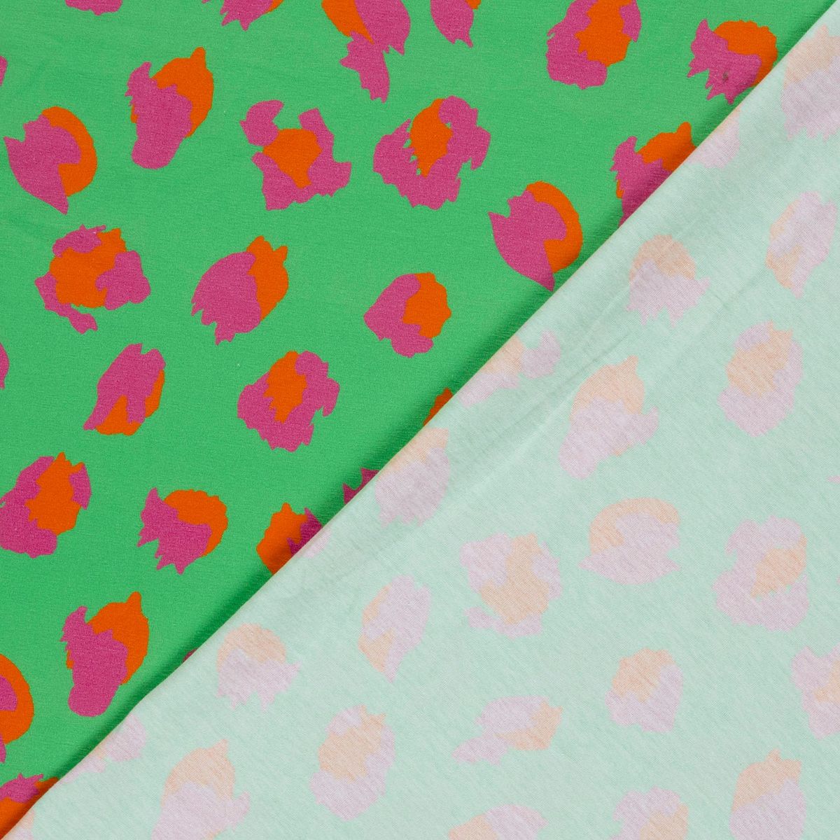 Weicher Baumwolljersey mit modernem Leo-Digitaldruck in Pink und Rot auf grünem Hintergrund für auffällige und kreative Nähprojekte