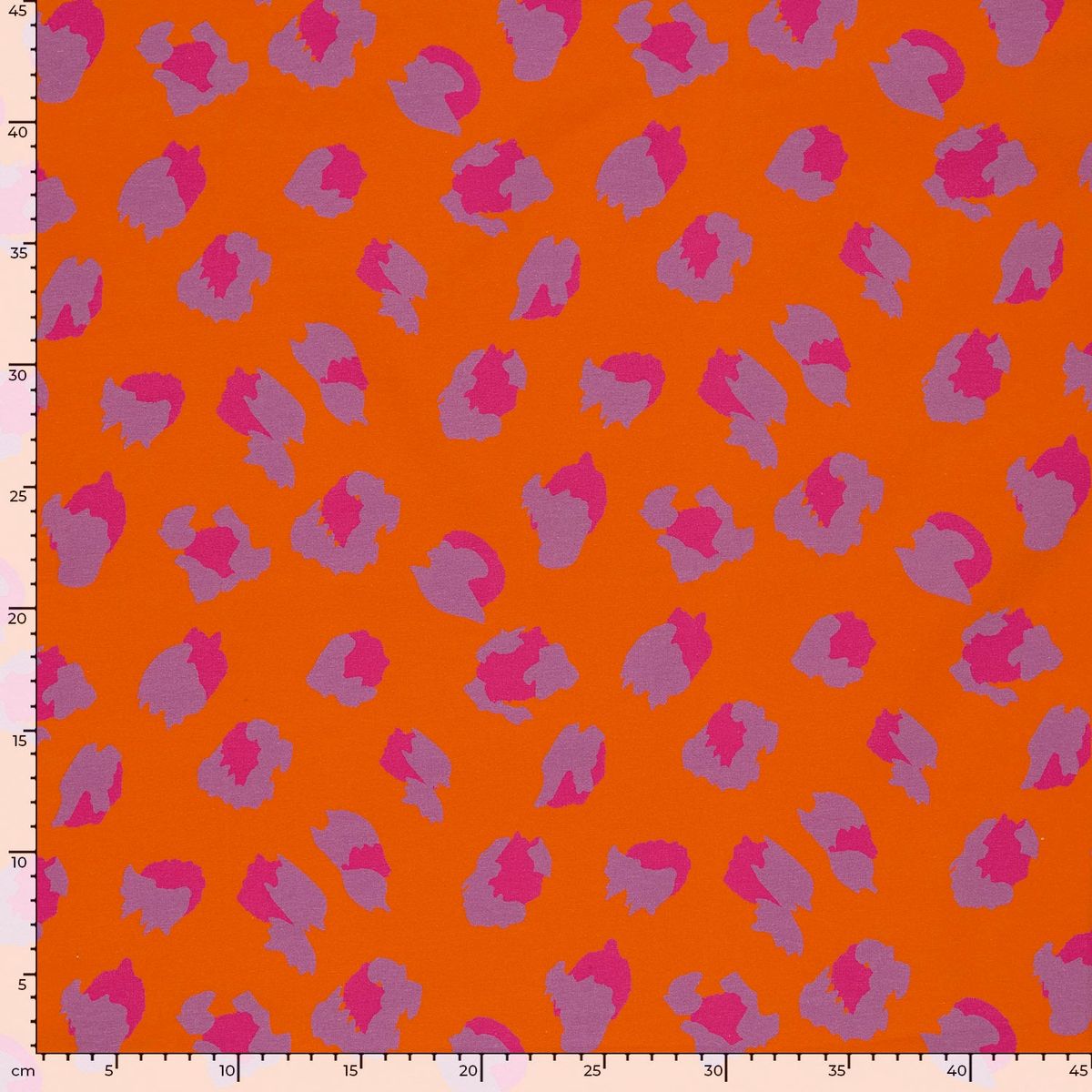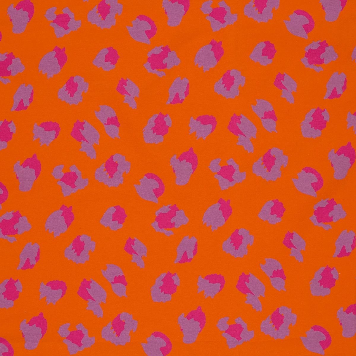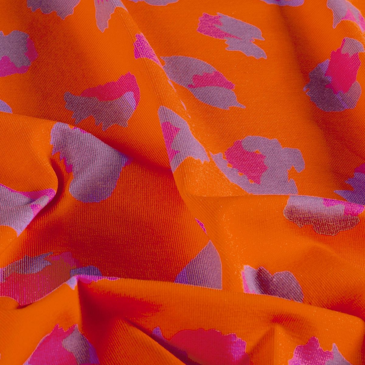 Weicher Baumwolljersey mit modernem Leo-Digitaldruck in Pink und Lila auf orangem Hintergrund für auffällige und kreative Nähprojekte