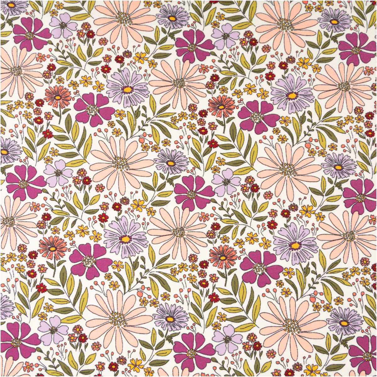 Das Blümchenmuster kombiniert verschiedene Farben zu einem harmonischen Gesamtbild. Ecru als Grundfarbe sorgt für eine ruhige Basis, während Grün, Lila und Rosa frische Akzente setzen. Dadurch entsteht ein Stoff, der sowohl verspielt als auch stilvoll wirkt und sich vielseitig kombinieren lässt.