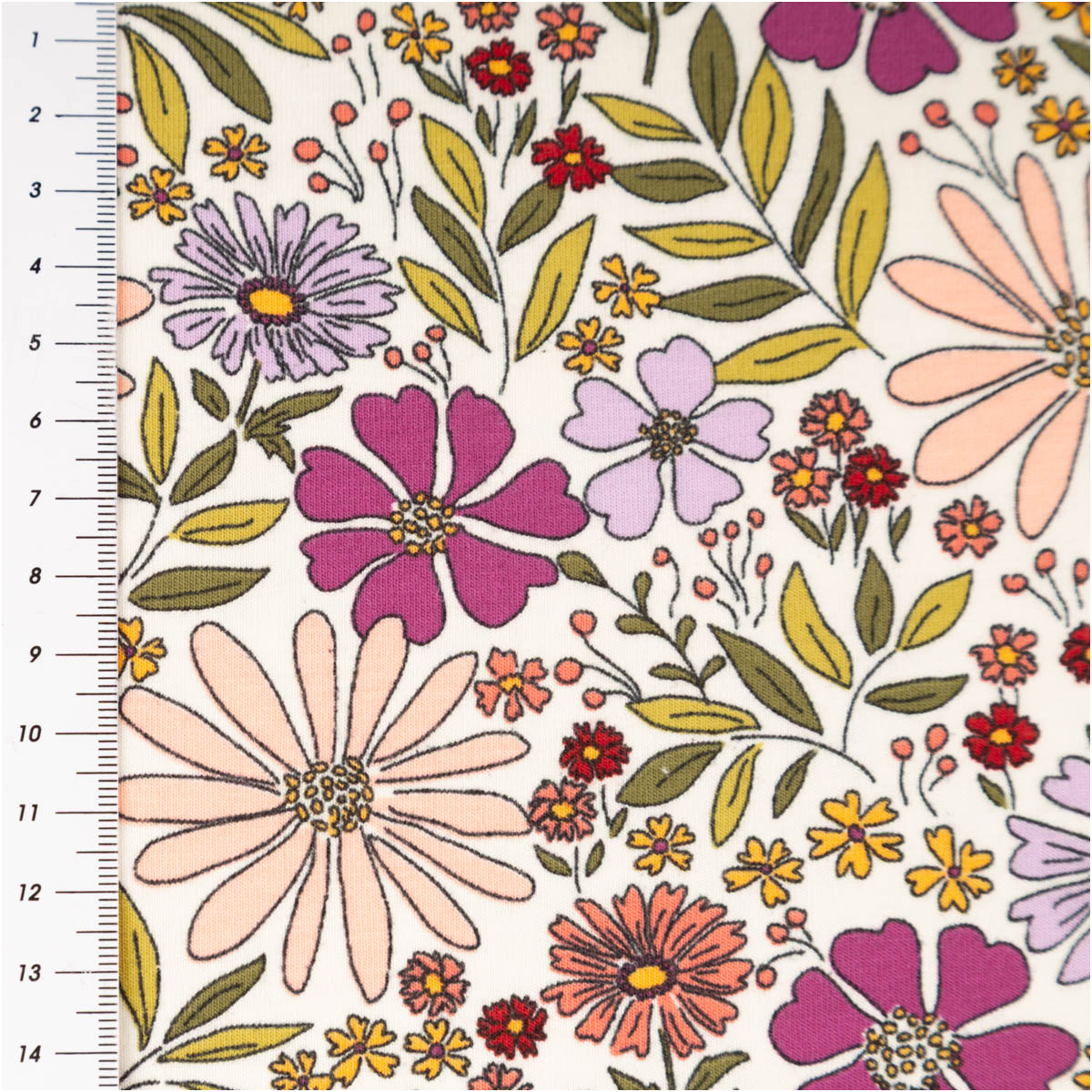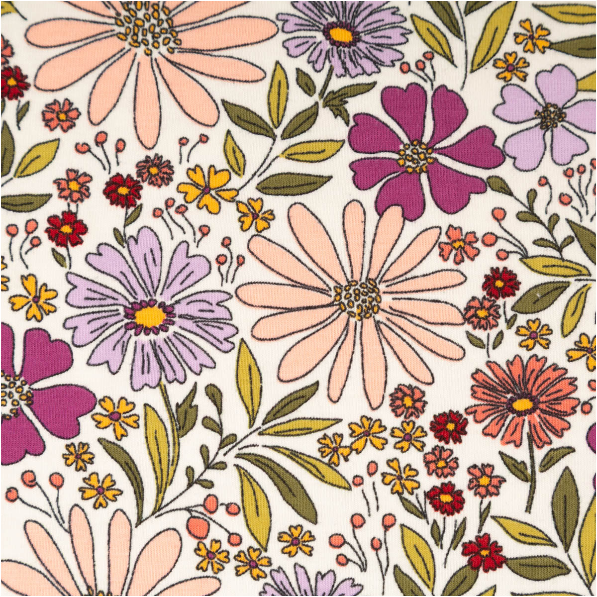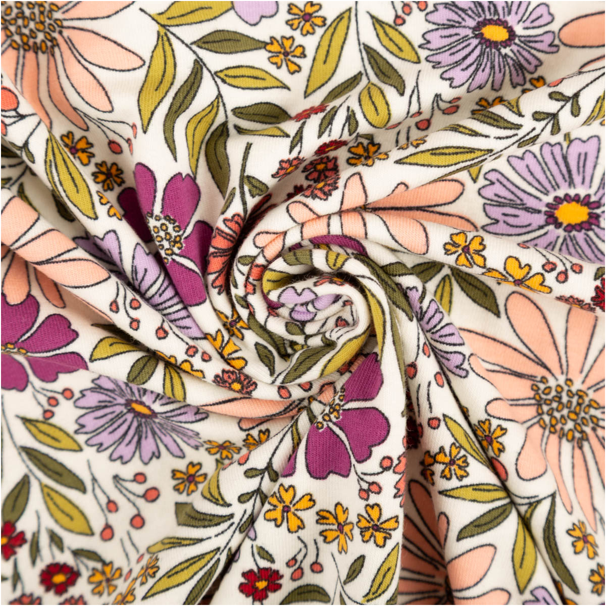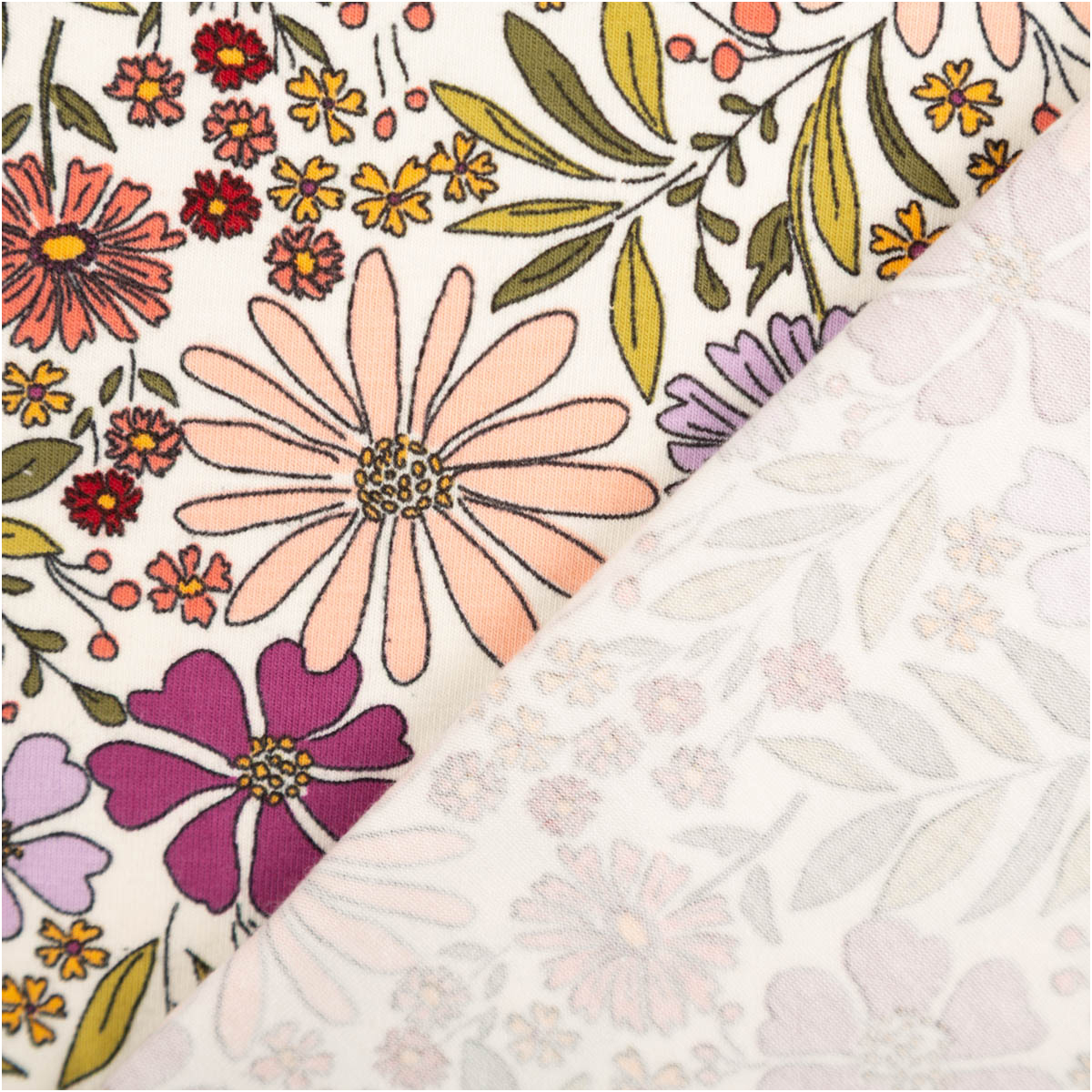 Jersey Stoff Blumen als Meterware in Ecru, Grün, Lila und Rosa