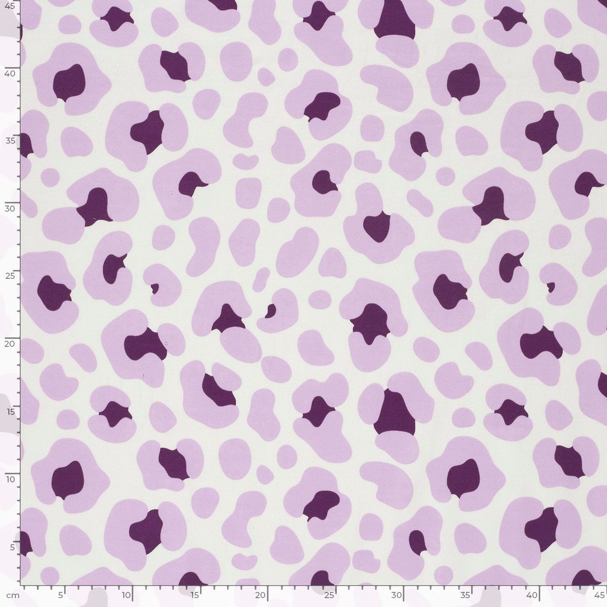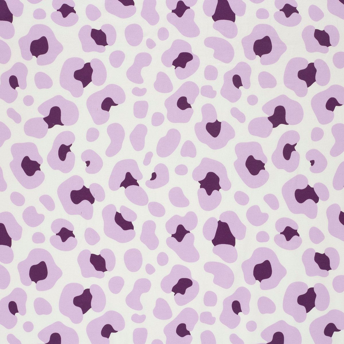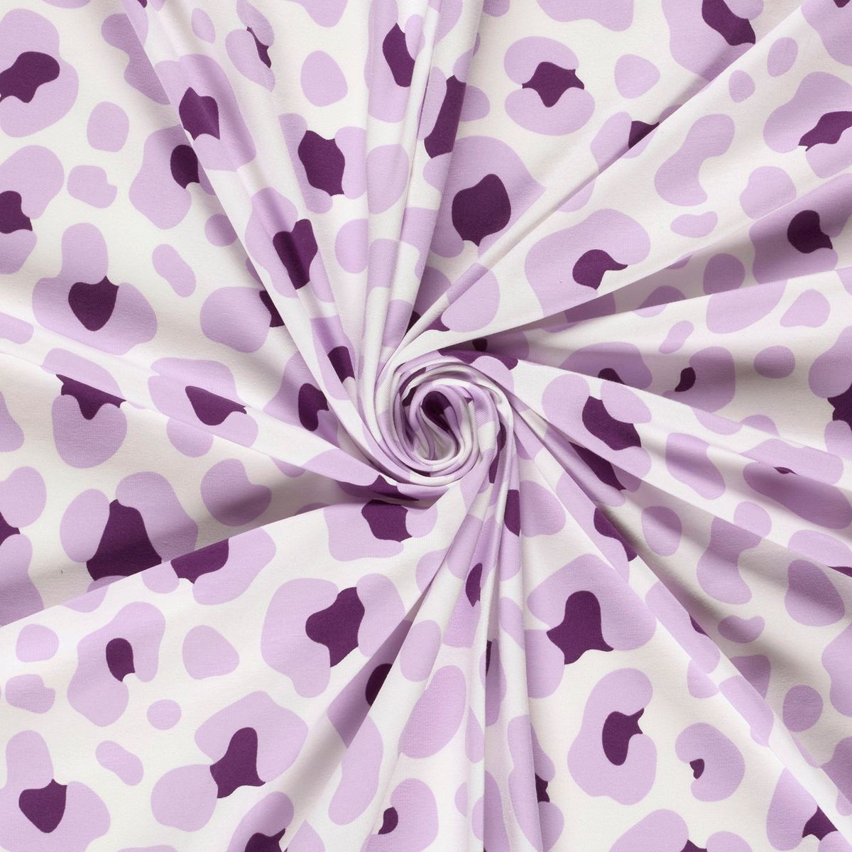 Das Design kombiniert einen hellen weißen Hintergrund mit größeren und kleineren Leo-Flecken in zarten Lila-Tönen und dunklerem Violett. Dadurch entsteht ein frischer, modischer Look, der sich vielseitig kombinieren lässt. Der Stoff wirkt verspielt und modern und ist damit ideal für trendige Nähideen.