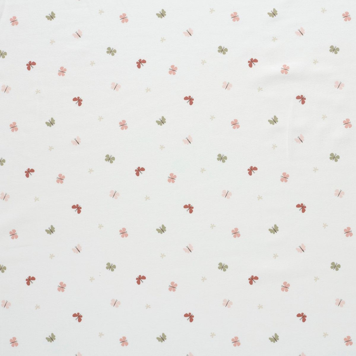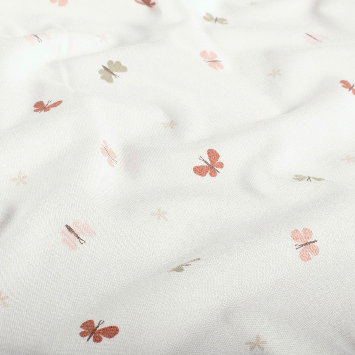 FILIGRANES DESIGN: Der Baumwolljersey besticht durch ein zauberhaftes Schmetterlings-Muster in Rosa, Rot und Beige auf wollweißem Grund für eine leichte, fröhliche Optik.
