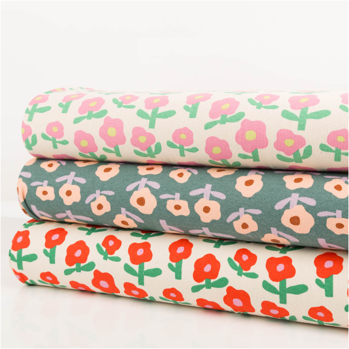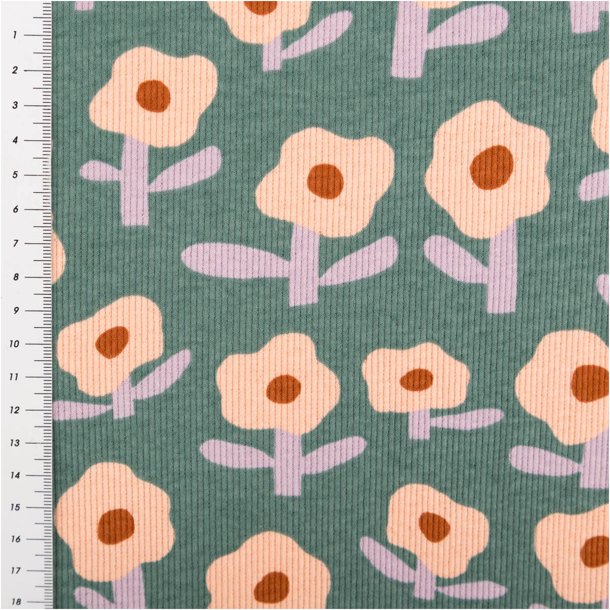 Das florale Muster wirkt modern, freundlich und verspielt. Die stilisierten rosa Blumen auf grünem Grund verleihen dem Stoff eine frische und besondere Ausstrahlung. Dadurch eignet sich dieser Bio Rippjersey mit Blumenmuster wunderbar für Kinderkleidung, Accessoires und bequeme Basics mit Charakter.