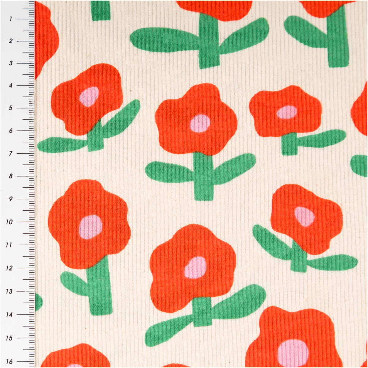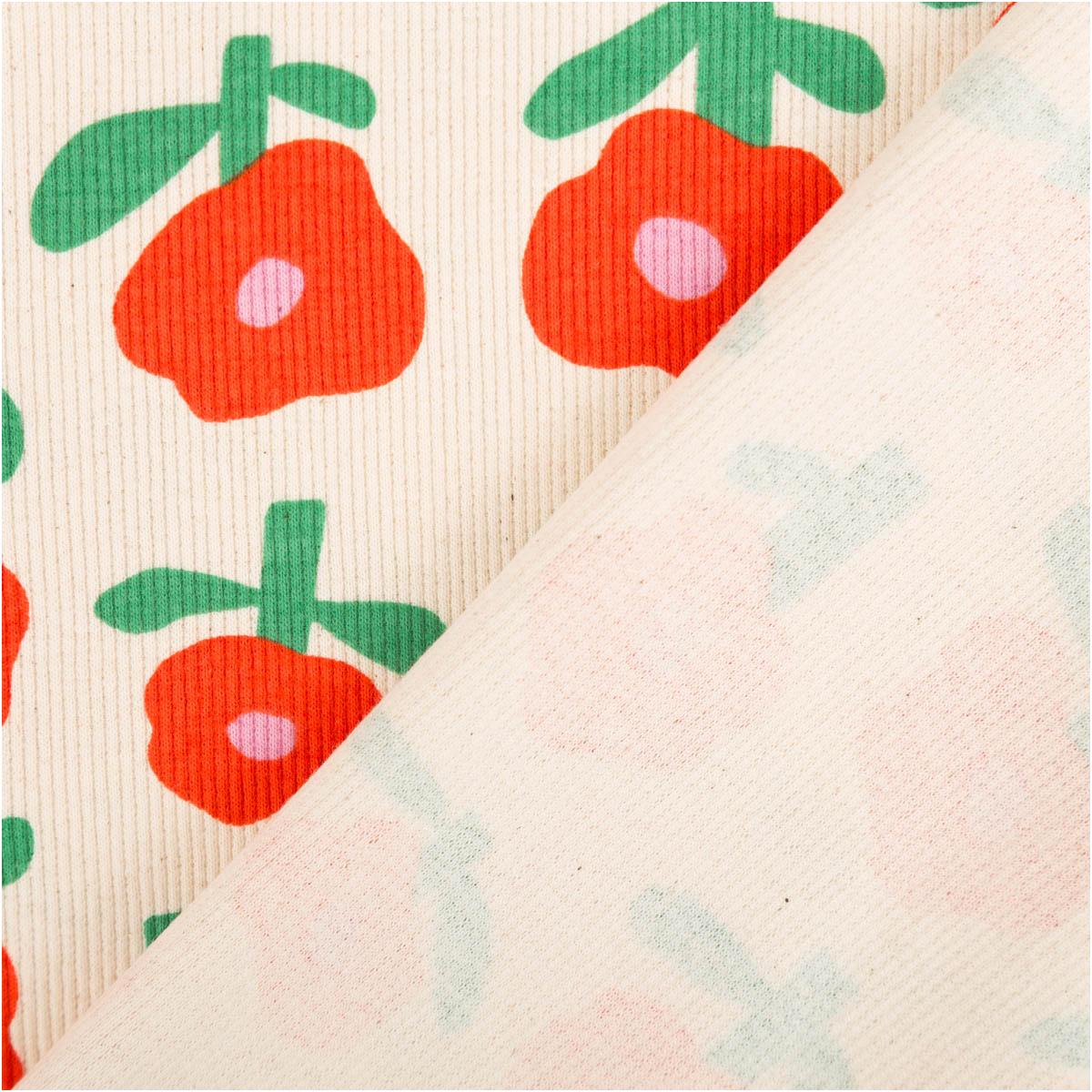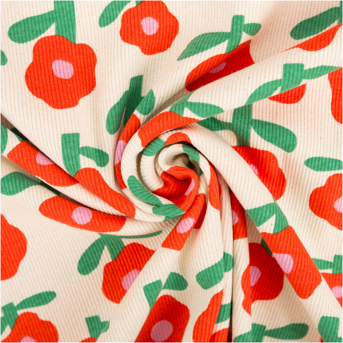 Das florale Muster wirkt modern, freundlich und verspielt. Die stilisierten roten Blumen auf naturfarbenem Grund verleihen dem Stoff eine frische und besondere Ausstrahlung. Dadurch eignet sich dieser Bio Rippjersey mit Blumenmuster wunderbar für Kinderkleidung, Accessoires und bequeme Basics mit Charakter.