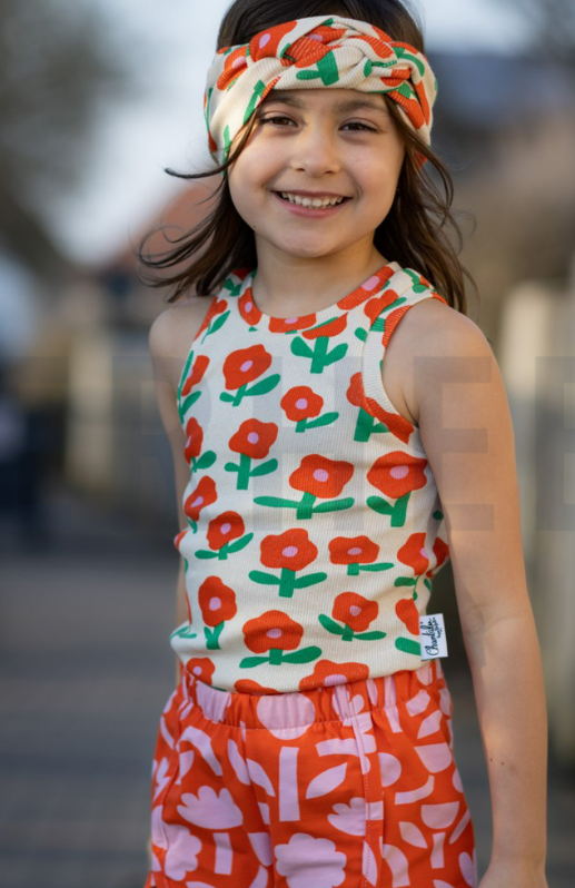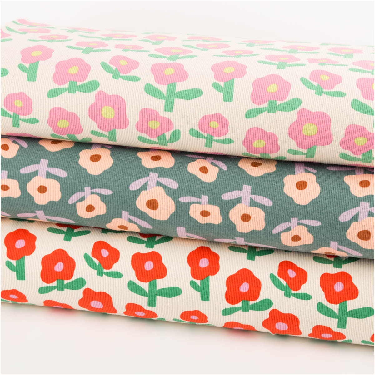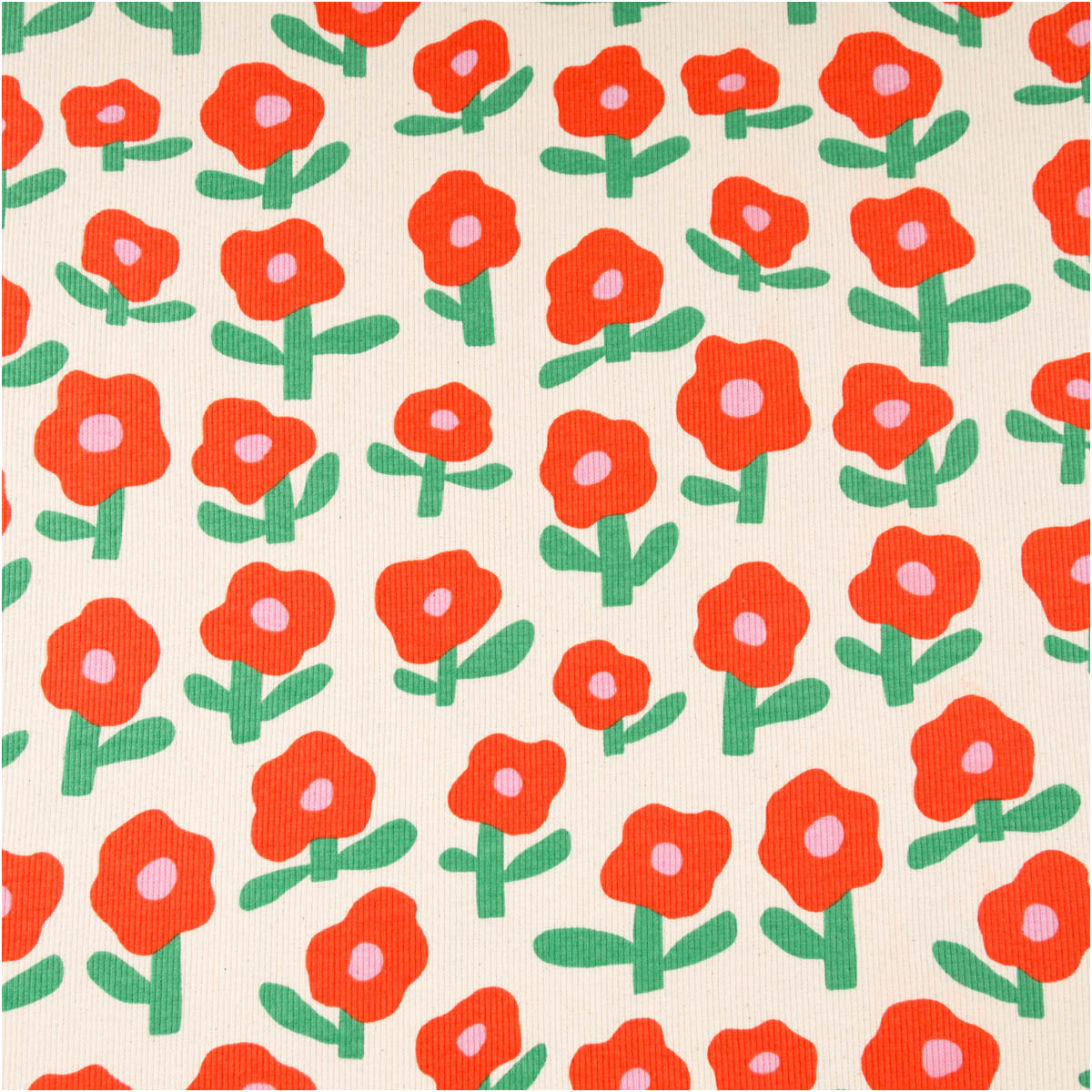Das florale Muster wirkt modern, freundlich und verspielt. Die stilisierten roten Blumen auf naturfarbenem Grund verleihen dem Stoff eine frische und besondere Ausstrahlung. Dadurch eignet sich dieser Bio Rippjersey mit Blumenmuster wunderbar für Kinderkleidung, Accessoires und bequeme Basics mit Charakter.
