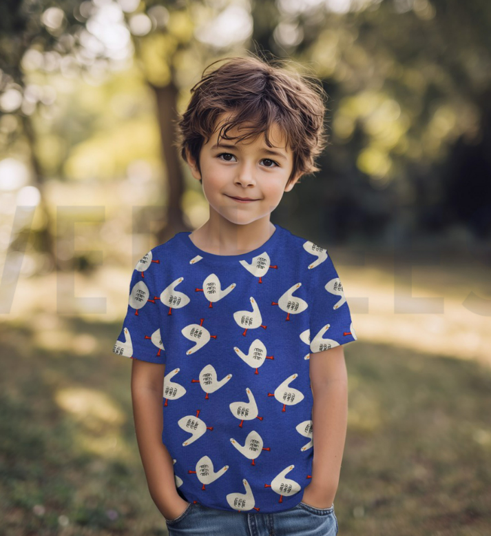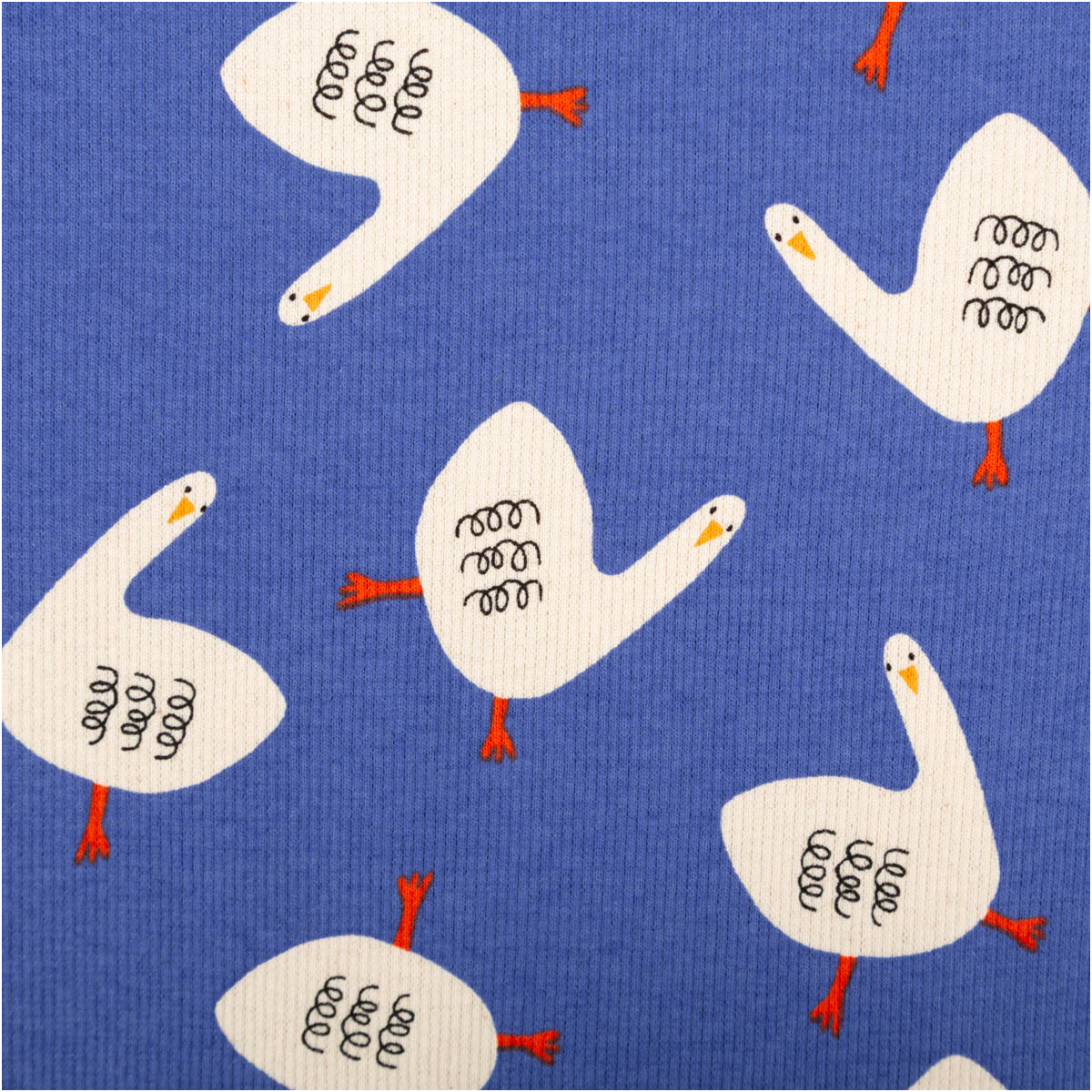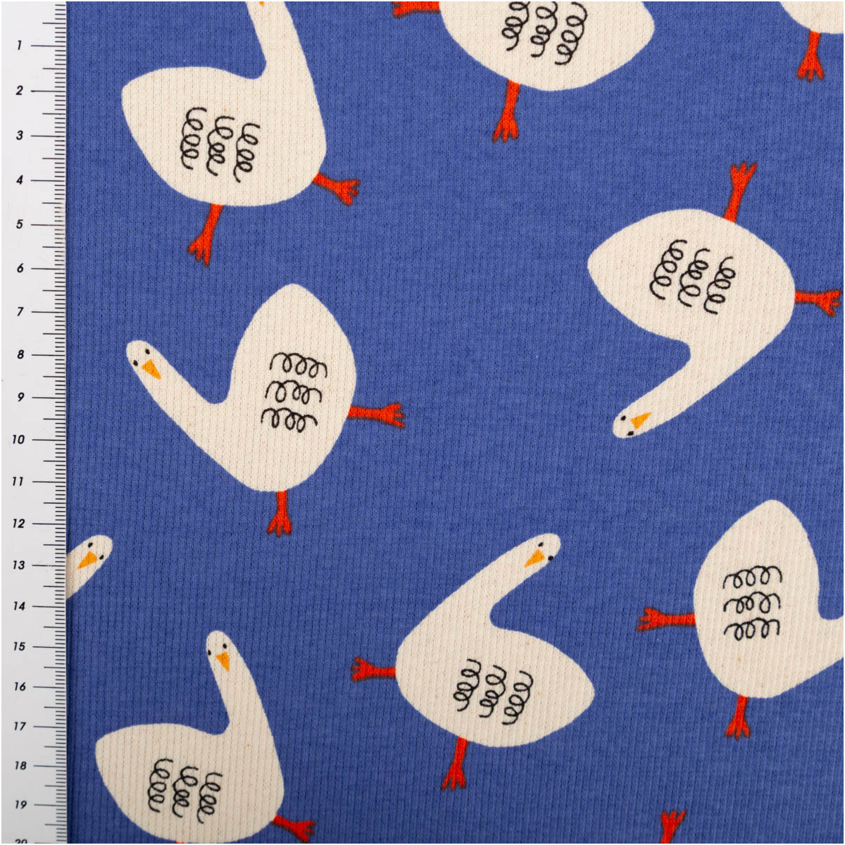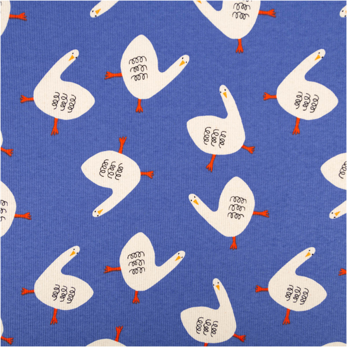 Bio Rippjersey aus Baumwolle mit charmantem Gänse-Muster von Jennifer Bouron auf blauem Hintergrund