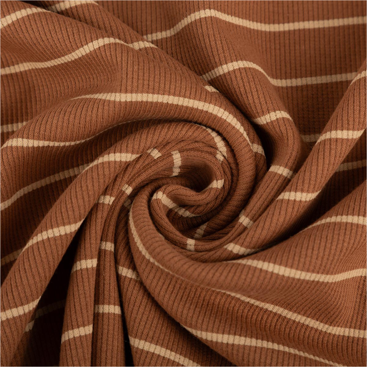 Entdecke den Rippjersey Stoff aus Baumwolle mit eleganten Streifen in Braun und Beige – ein Klassiker für zeitlose Nähprojekte. Seine feine Rippenstruktur sorgt für einen dezenten Look und gleichzeitig für angenehme Elastizität.