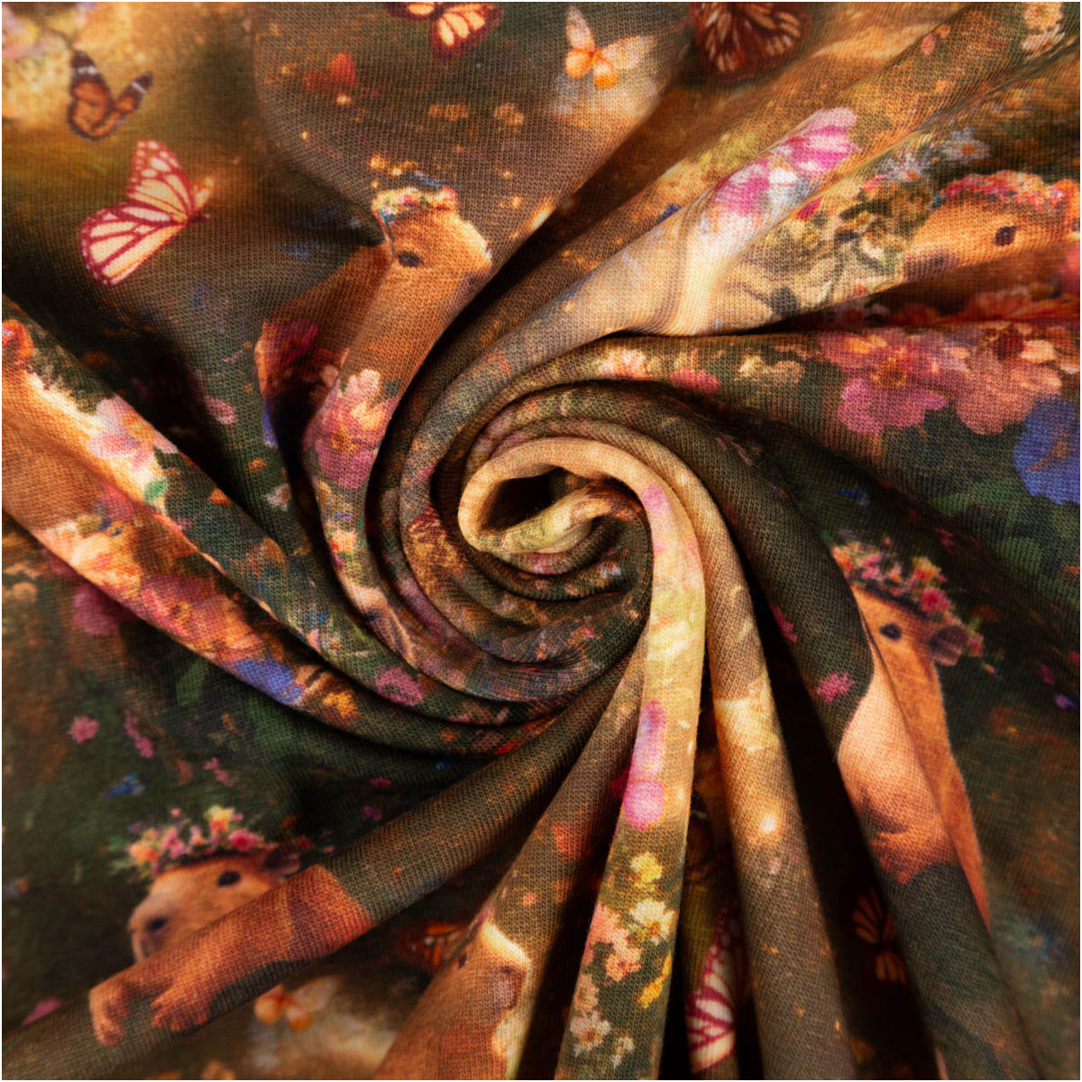Jersey Stoff Baumwolljersey Capybaras Blumen Digitaldruck ocker grün rosa 1,48 m Breite