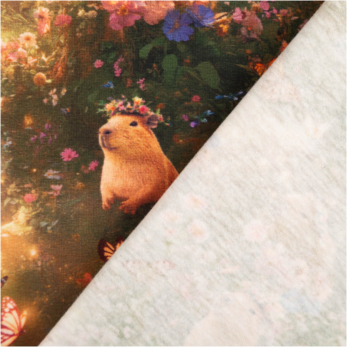 Fröhliches Capybara-Design: süße Capybaras mit Blüte und Blumenmotiv auf grüner Wiese, hochwertiger Digitaldruck aus der Poppy Fabrics Kollektion