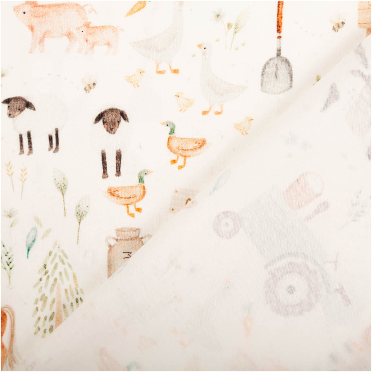 Liebevoller Baumwolljersey mit detailreichem Bauernhof-Digitaldruck auf weißem Grund mit Traktor, Kuh, Schaf, Schwein, Gans, Eiern und weiteren ländlichen Motiven