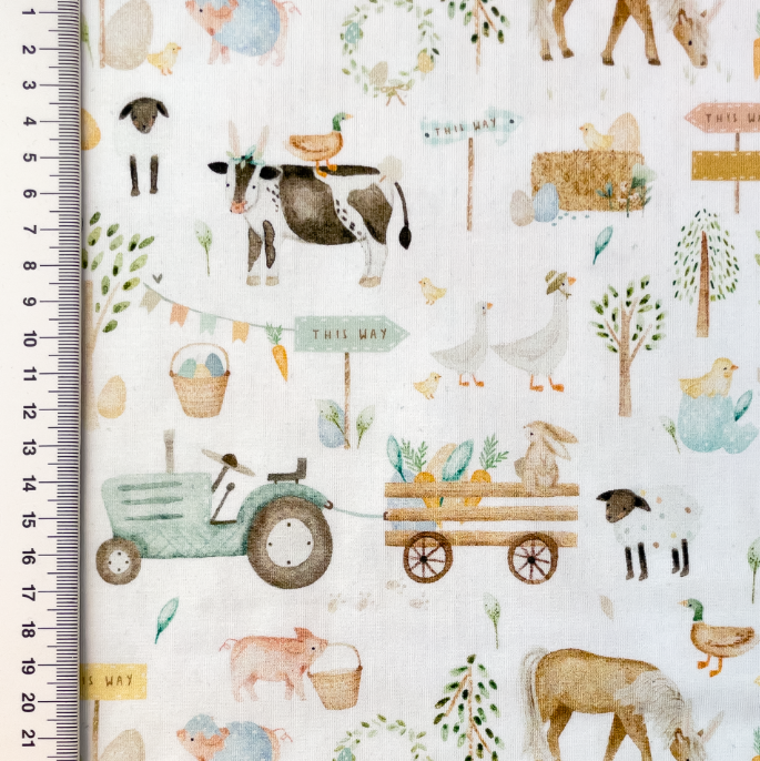 Dieser Jersey Stoff aus Baumwolljersey begeistert mit einem liebevollen Bauernhof-Digitaldruck auf weißem Grund. Zwischen Traktor, Kuh, Schaf, Schwein, Gans, Eiern, Heuballen und kleinen Wegweisern entsteht eine freundliche, verspielte Szene, die sofort an Landleben, Natur und unbeschwerte Kindheit erinnert.