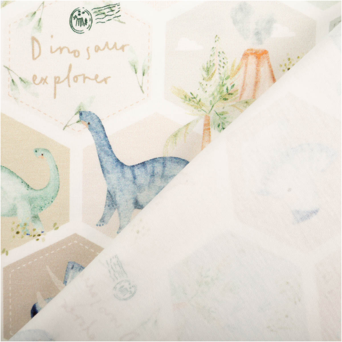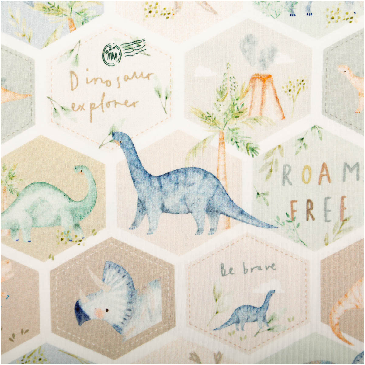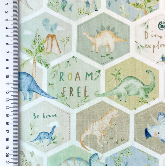 Das Hexagon-Muster verleiht dem Stoff einen modernen Look und setzt die Dinosaurier auf besondere Weise in Szene. Die Kombination aus sanften Farben und liebevollen Illustrationen macht den Stoff vielseitig einsetzbar. Er passt gut zu schlichten Schnitten, lässt sich aber auch hervorragend mit unifarbenen Stoffen in Grün, Beige, Blau oder Natur kombinieren.