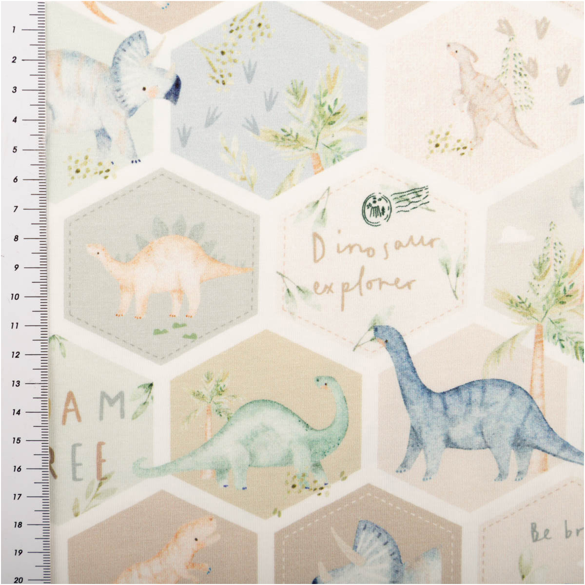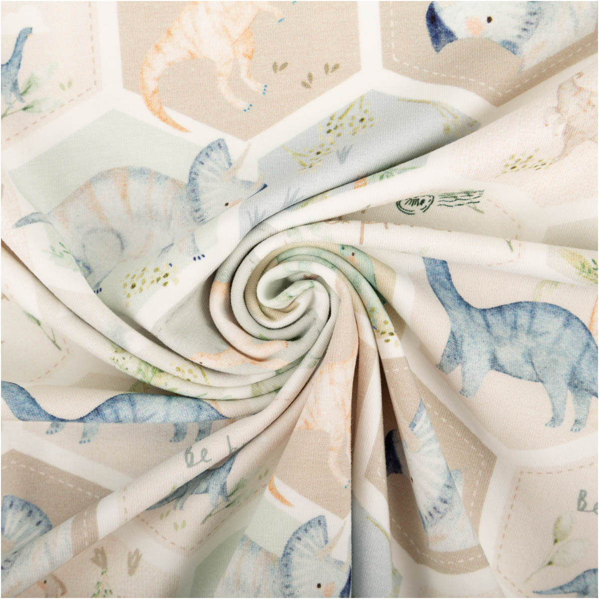 Dieser Jersey Stoff aus Baumwolljersey begeistert mit einem liebevoll gestalteten Dinosaurier-Design in moderner Hexagon-Optik. Auf hellem Grund zeigen sich verschiedene Dinosaurier, Pflanzen und kleine Naturmotive in harmonischen Farben wie Grün, Blau und Beige. Die sanfte Farbwelt wirkt freundlich, modern und kindgerecht und macht den Stoff zu einer tollen Wahl für viele kreative Nähideen.