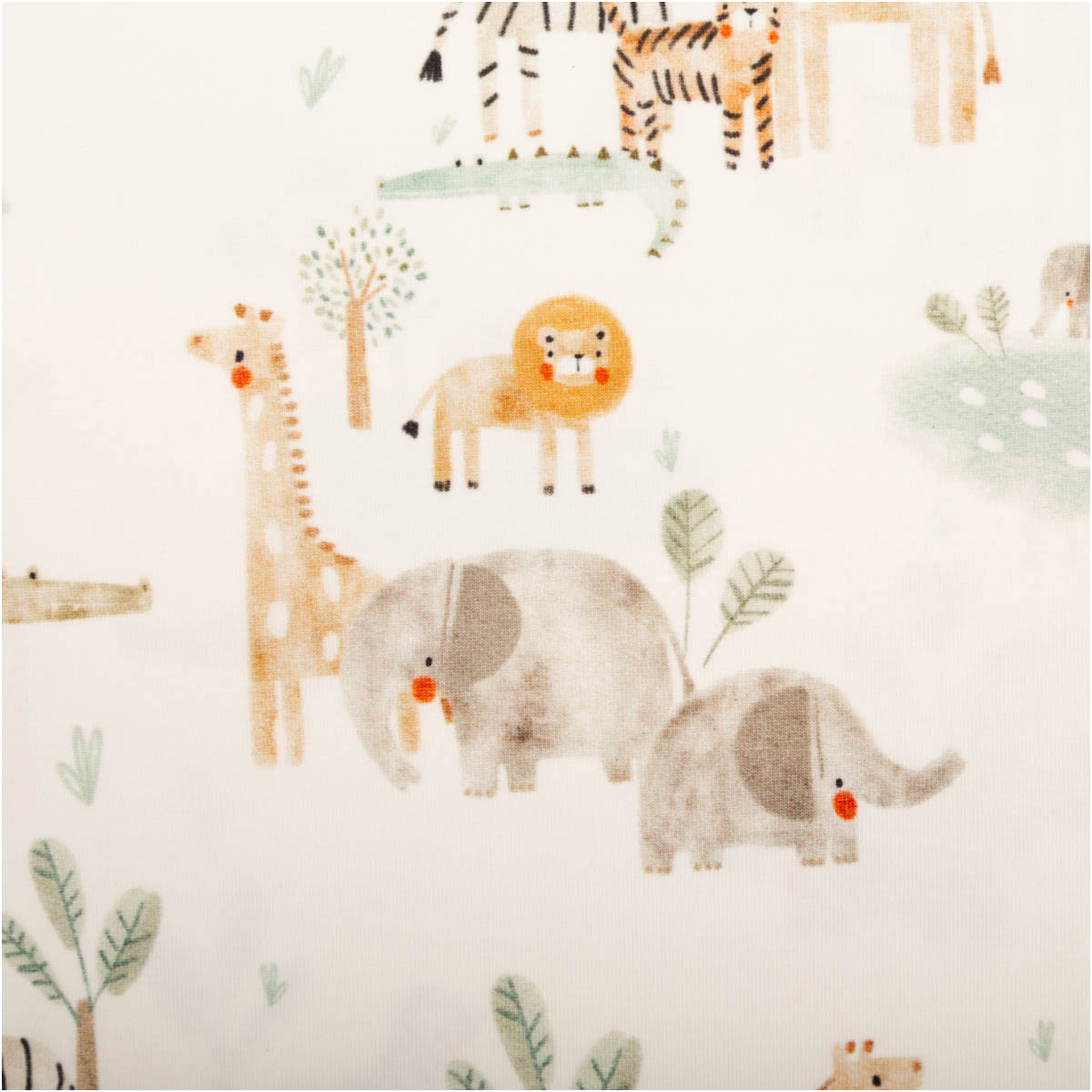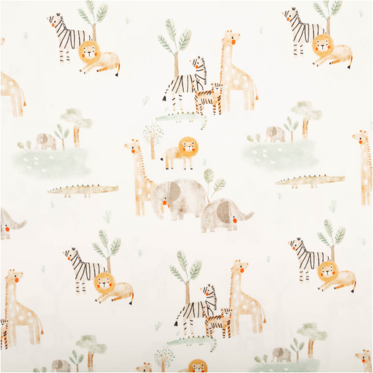 Dieser Jersey Stoff aus Baumwolljersey begeistert mit einem liebevoll gestalteten Safari-Design auf hellem gelblichen Grund. Zwischen zarten Blättern und kleinen Pflanzen tummeln sich niedliche Safaritiere wie Zebra, Elefant, Giraffe, Löwe und Krokodil. Das feine Digitaldruck-Motiv wirkt freundlich, weich und kindgerecht und macht den Stoff zu einer tollen Wahl für kleine und große Nähideen.