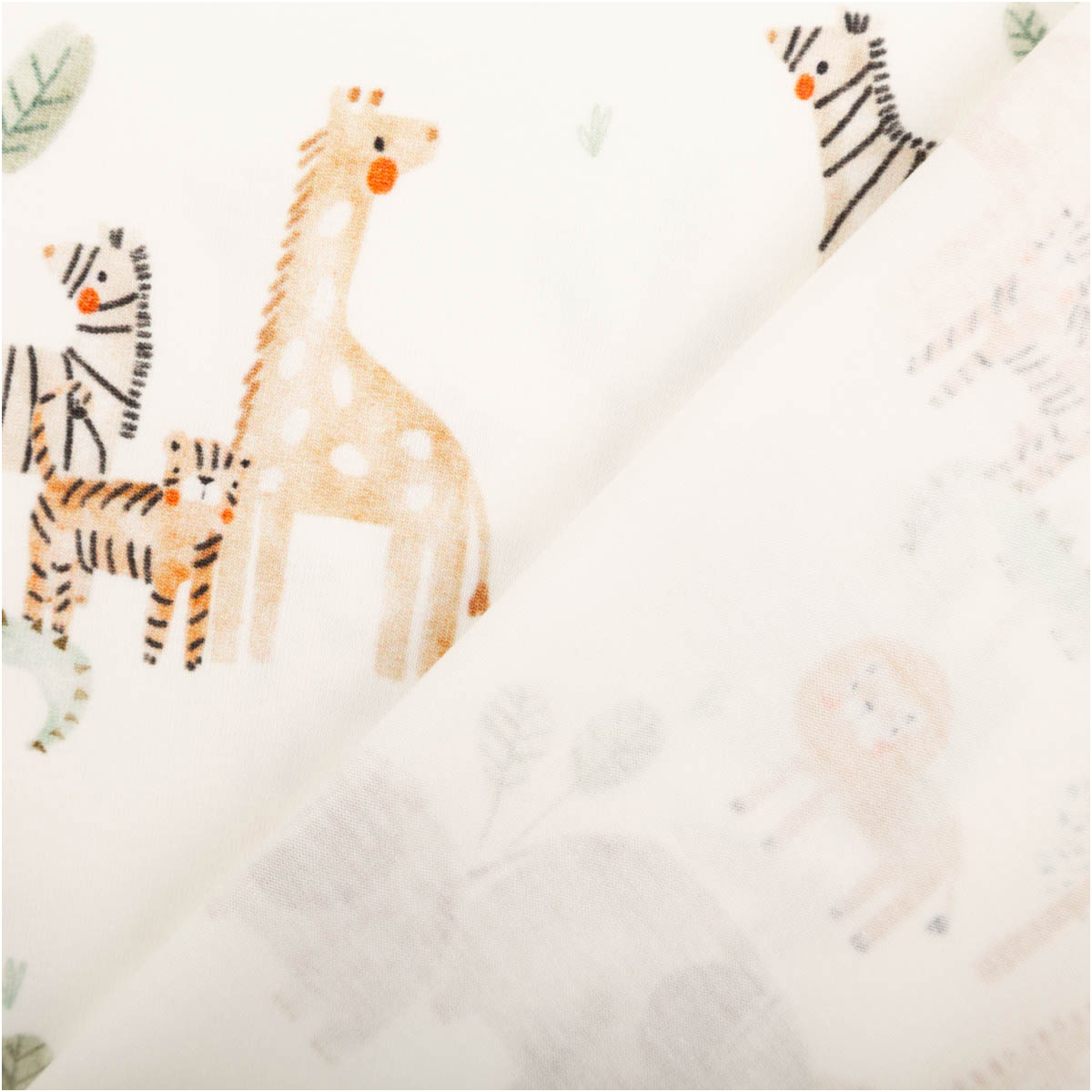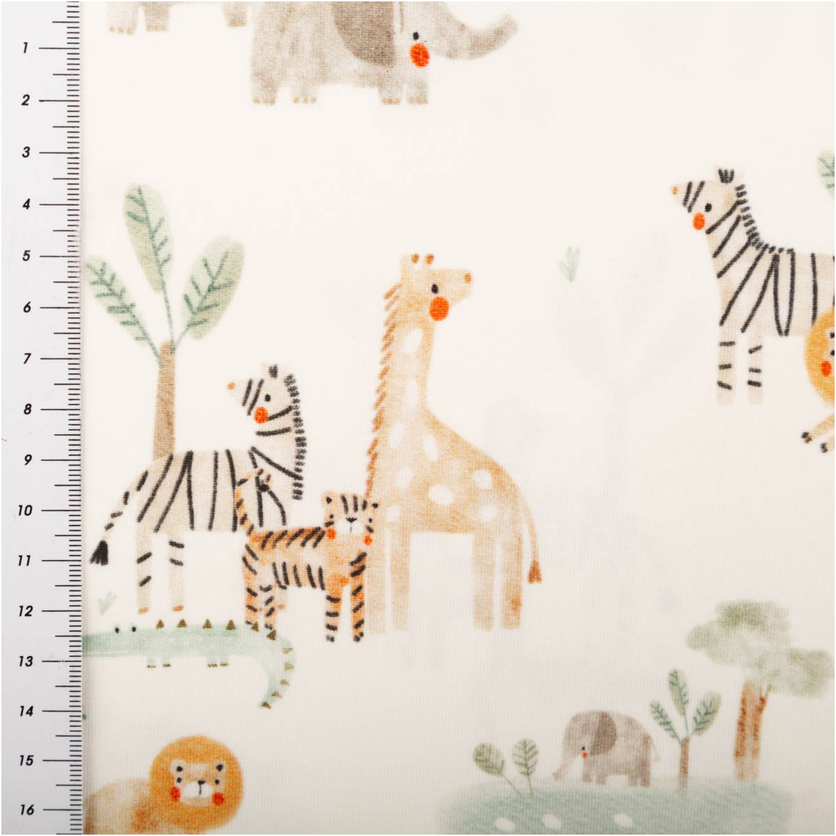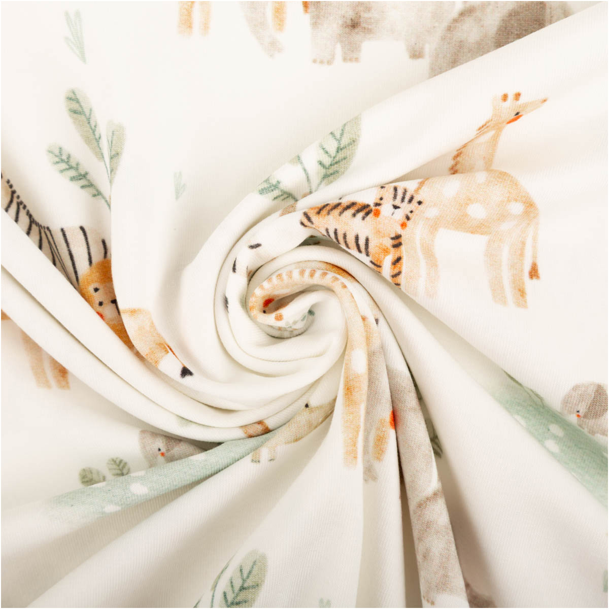 Das verspielte Safari-Muster eignet sich besonders gut für Nähprojekte rund um Babys und Kinder. Du kannst daraus zum Beispiel Shirts, Leggings, Pumphosen, Kleider, Schlafanzüge oder Bodys nähen. Auch für Mützen, Halstücher oder leichte Accessoires ist dieser Baumwolljersey sehr gut geeignet.