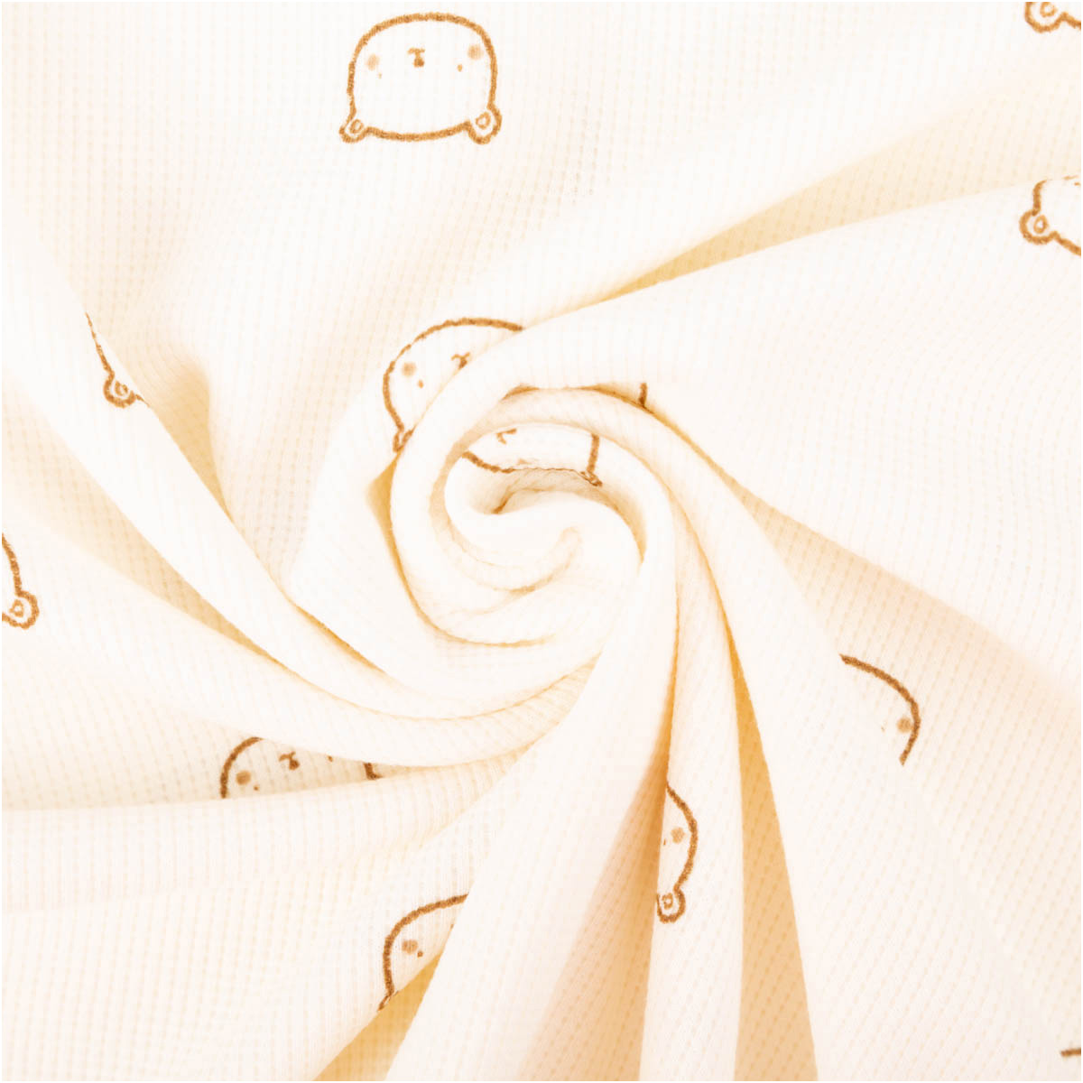 du willst kuschelig weiche Mode für empfindliche Haut nähen? Dieser Waffeljersey aus 95 % Baumwolle und 5 % Elasthan ist atmungsaktiv, elastisch und mit seinem Bärchenmotiv einfach perfekt für Babys und Kids – natürlich angenehm auf der Haut.