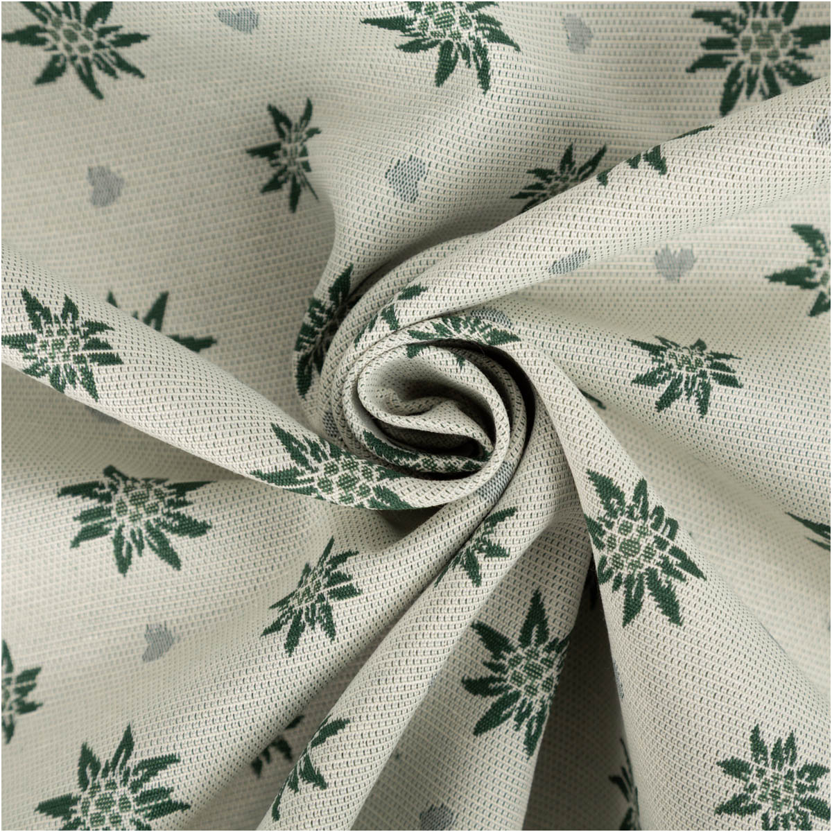 Du möchtest Landhausstil, der sofort hochwertig wirkt? Dieser Jacquard Dekostoff Doubleface mit Edelweiß-Dessin in Grün und Ecru ist dafür wie gemacht. Die Edelweißblüten sind nicht aufgedruckt, sondern eingewebt – das sorgt für einen edlen Look und macht den Stoff beidseitig verwendbar: vorn grüne Edelweißblüten auf hellem Ecru, hinten helle Blüten auf Grün. Und das Beste: Der Stoff ist blickdicht – ideal als Sichtschutz am Fenster.