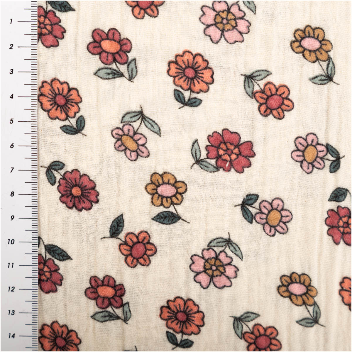 Dieser Musselin Stoff aus 100 % Baumwolle begeistert mit einem liebevoll gestalteten Blümchen-Dessin in Rosa, Rot und zarten Naturtönen auf ecrufarbenem Hintergrund. Die harmonische Farbgestaltung wirkt warm, freundlich und zeitlos – perfekt für Nähprojekte mit natürlichem Charme. Als Meterware bietet dir dieser Double Gauze Stoff viel Freiheit für deine kreativen Ideen.