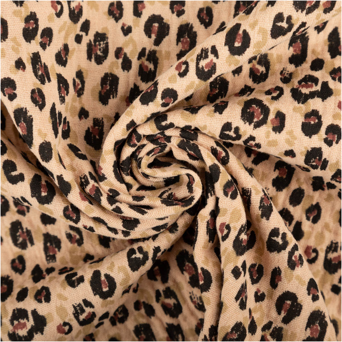 Angenehm weicher Musselin Stoff aus 100% Baumwolle mit modernem Leo-Print in Camel und Schwarz. Dank seines zweilagigen Aufbaus (Double Gauze) ist er fluffig, saugfähig und atmungsaktiv. Der Stoff ist OEKO-TEX® Standard 100 zertifiziert und damit schadstoffgeprüft sowie hautfreundlich.