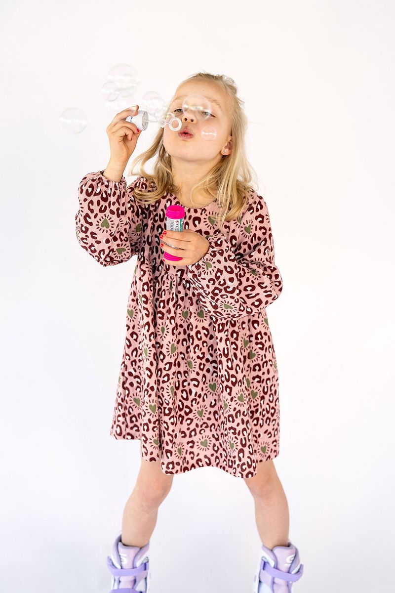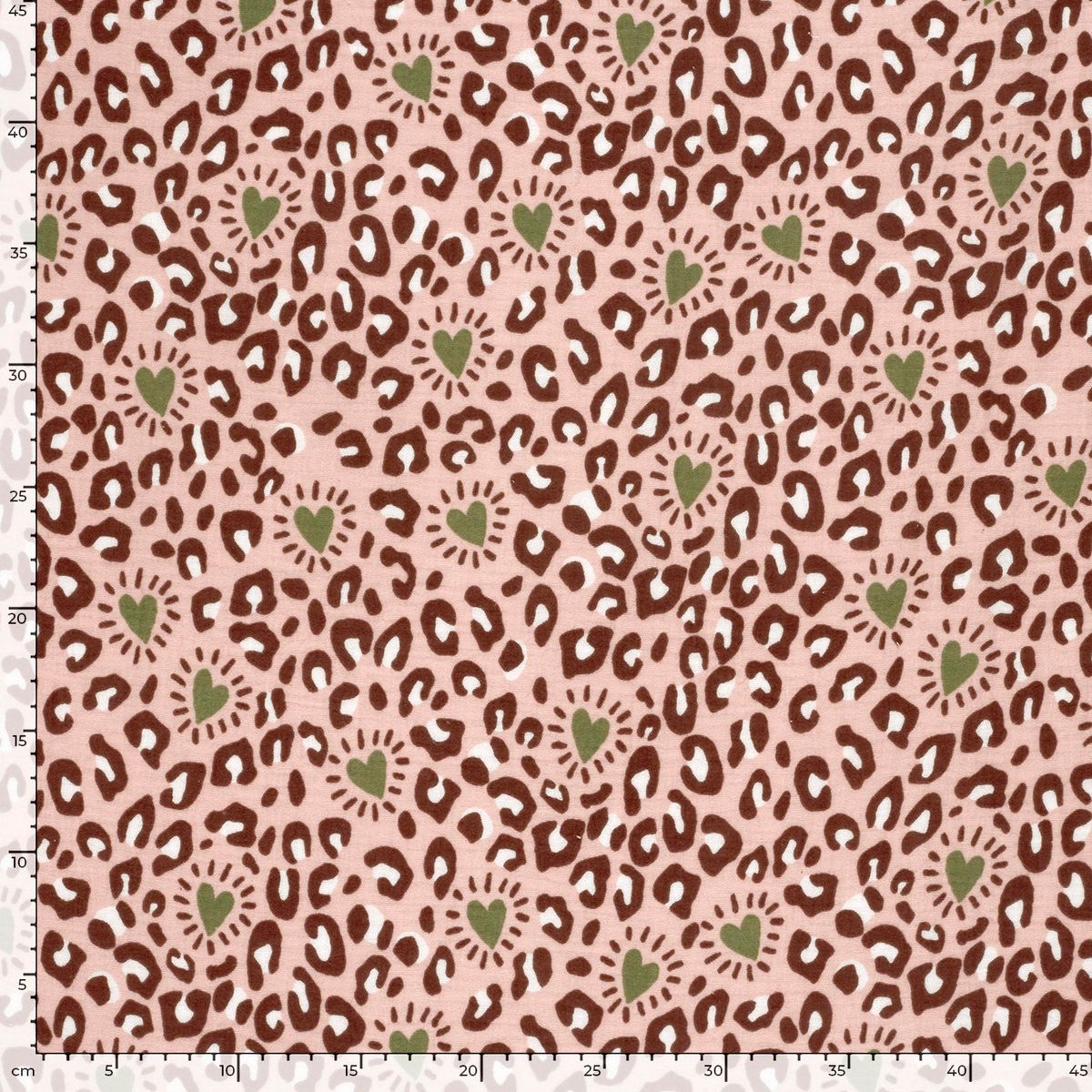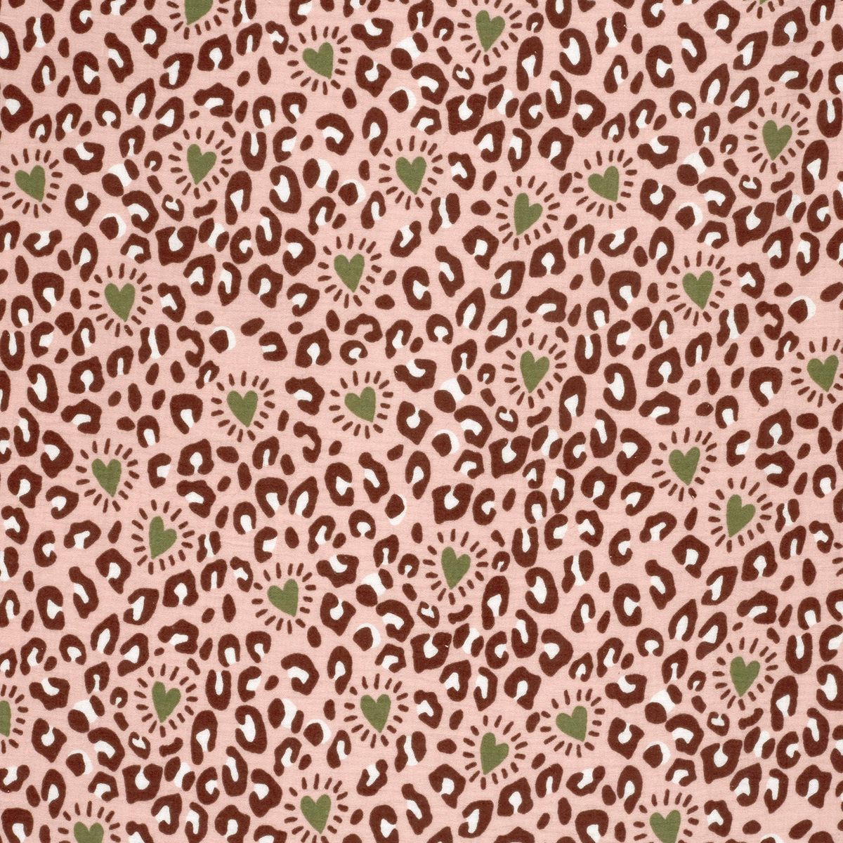 MODERNES DESIGN: Der Stoff besticht durch seine rosa Grundfarbe und das verspielte Muster mit Herzen im Leo-Look für eine modische und zugleich süße Optik.
