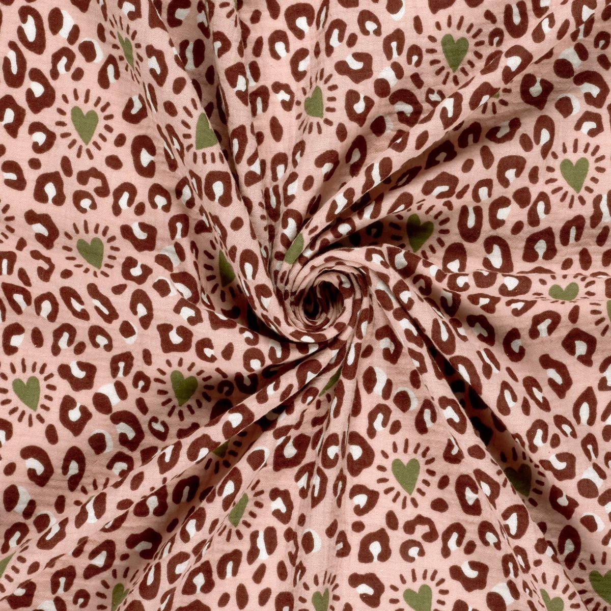 Du suchst nach einem Stoff, der durch seine zarte Farbe besticht und gleichzeitig ein modisches Statement setzt? Dieser hochwertige zweilagige Musselin (Double Gauze) aus reiner Baumwolle ist in einem wunderschönen Rosa-Grundton gehalten. Das verspielte Muster aus kleinen Herzen im Leo-Look verleiht dem Stoff eine moderne und zugleich liebevolle Note – die perfekte Wahl für deine nächsten Nähprojekte.