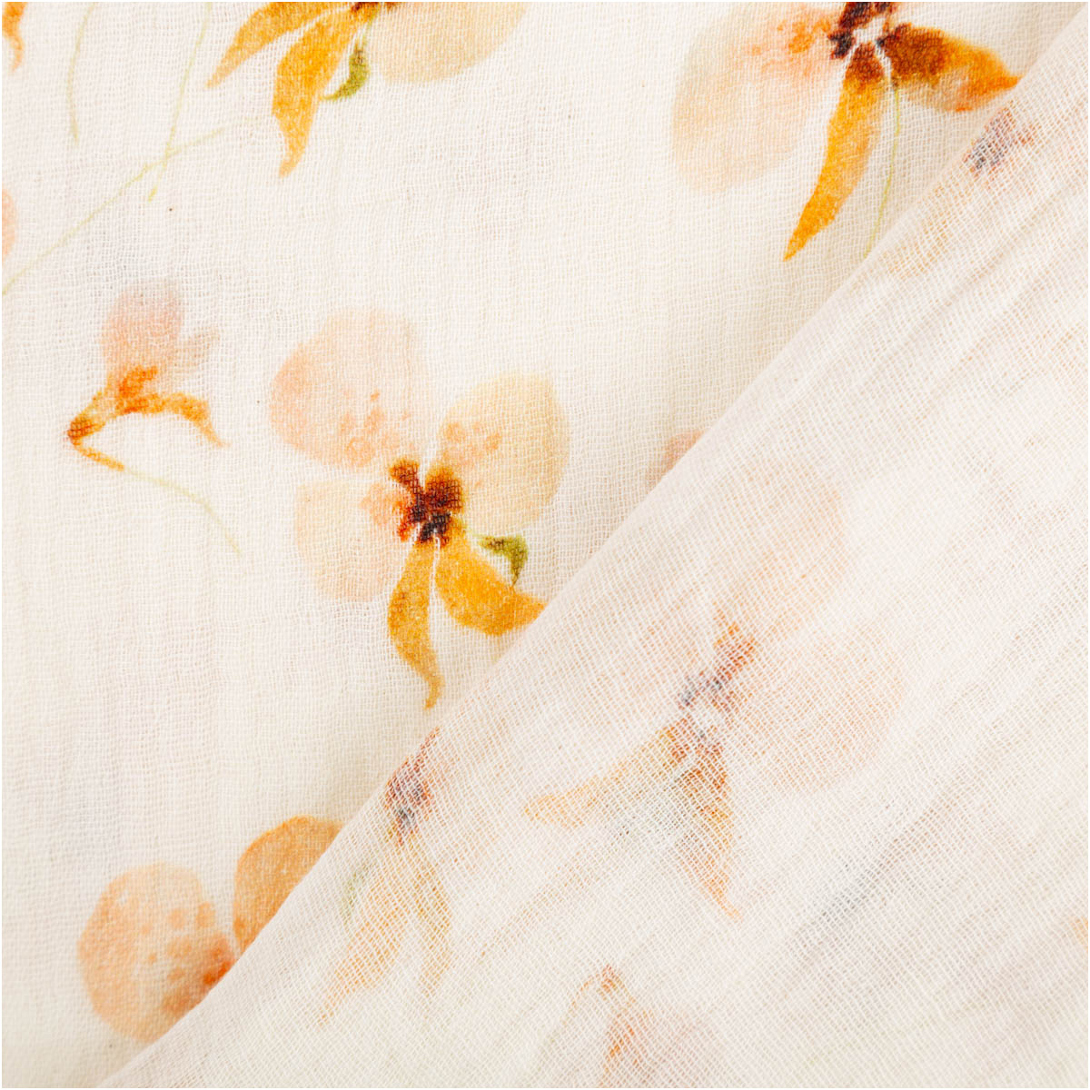 Weicher & luftiger Musselin Stoff: Der zweilagige Bio Baumwollstoff mit Blumen-Digitaldruck ist besonders weich, saugfähig und atmungsaktiv – ideal für Kleidung, Babyausstattung und Heimtextilien.