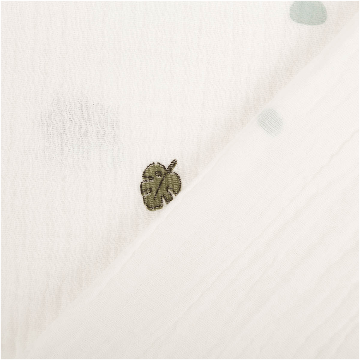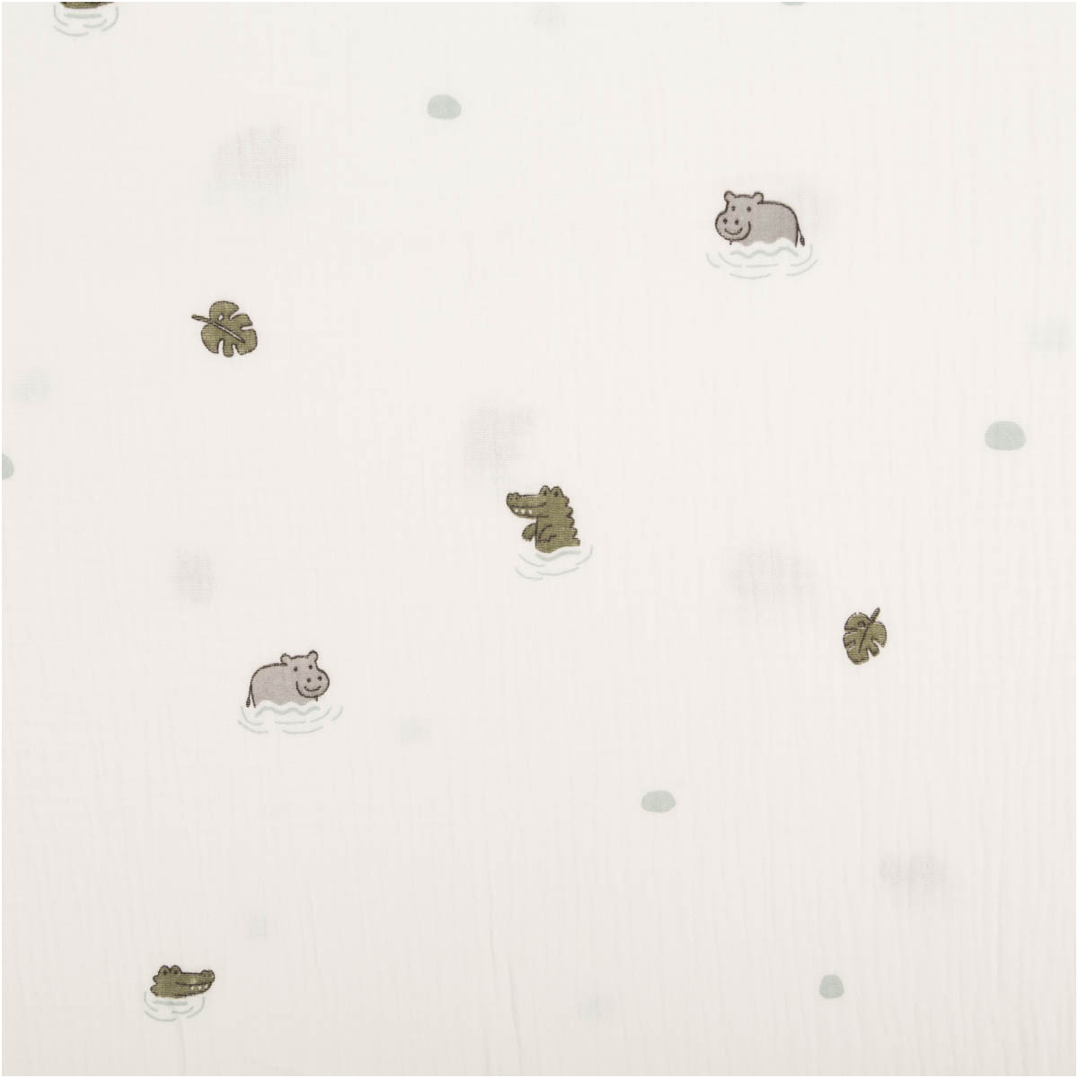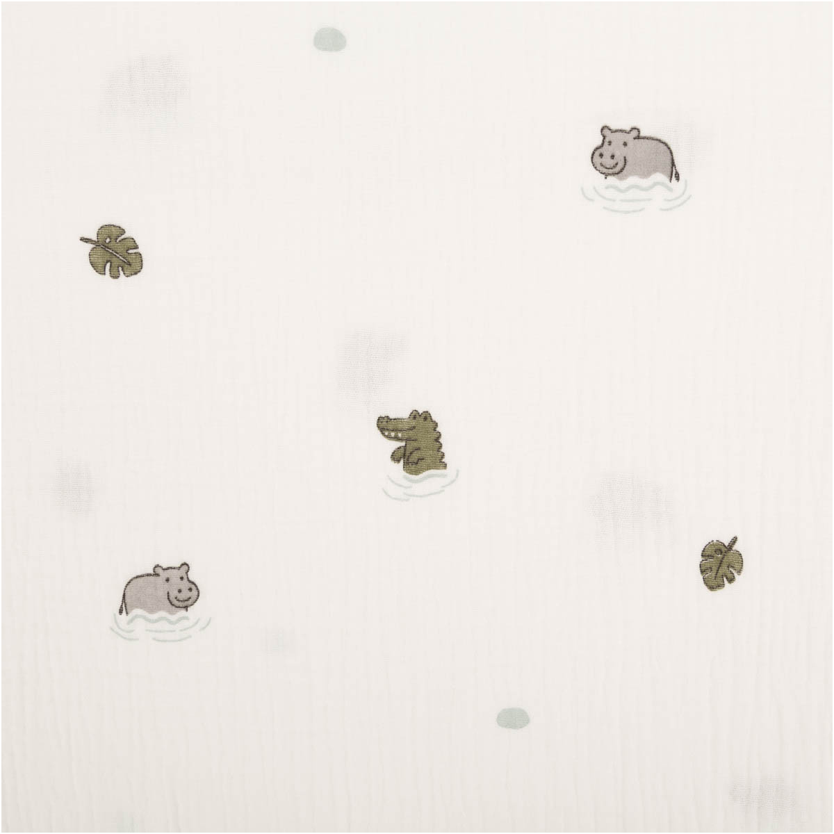 Weicher zweilagiger Musselin aus 100 % Baumwolle mit kleinen Nilpferden, Krokodilen, Blättern und Punkten auf wollweißem Hintergrund