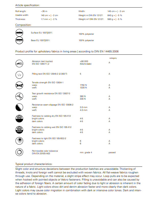Nutzbreite ca. 1,40 m, Gewicht ca. 580 g/m² und Stärke ca. 1,7 mm, dadurch robust, formstabil und sehr gut geeignet für Möbelbezüge und Auflagen