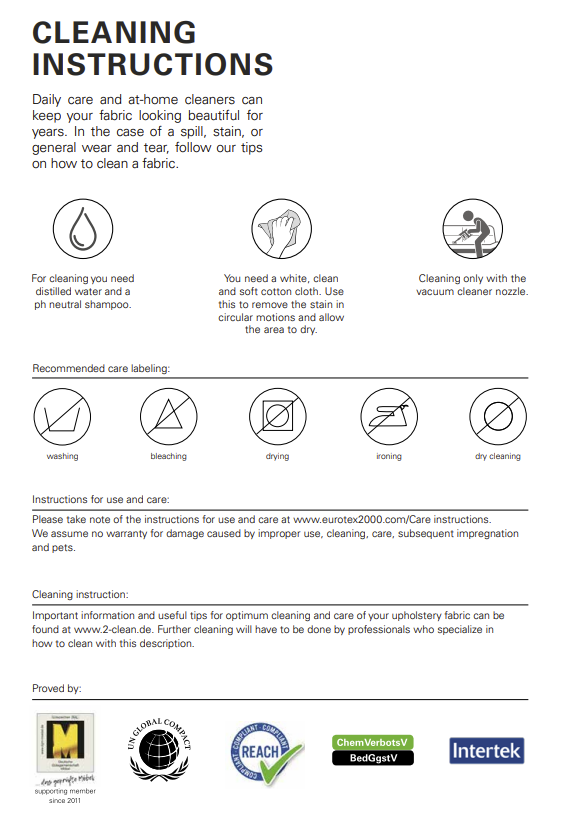 Oberfläche und Rückseite aus 100 % Polyester, mit Rückenkaschierung für zusätzliche Stabilität, Pflege durch punktuelle Fleckbehandlung