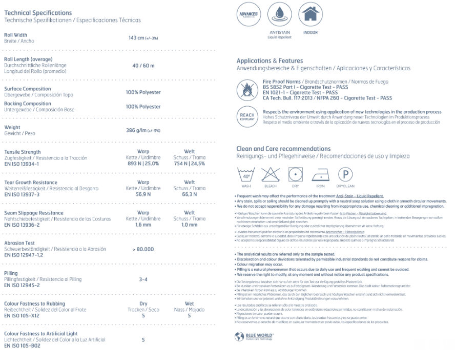 Pflege: bei 40°C waschbar, Flüssigkeiten direkt abtupfen, Flecken mit destilliertem Wasser und weißem Baumwolltuch bearbeiten