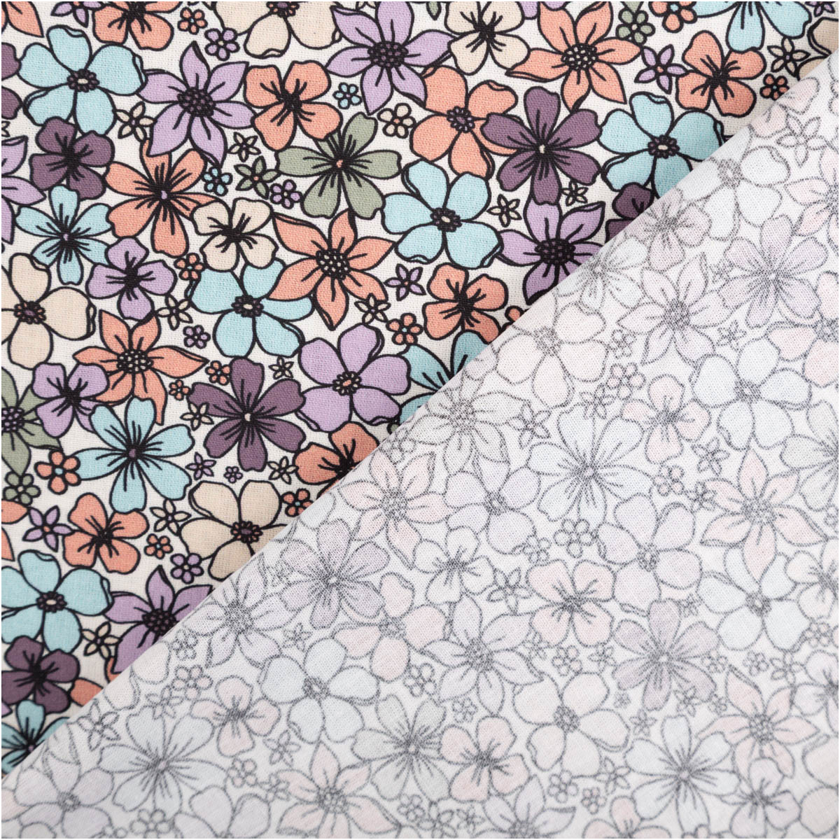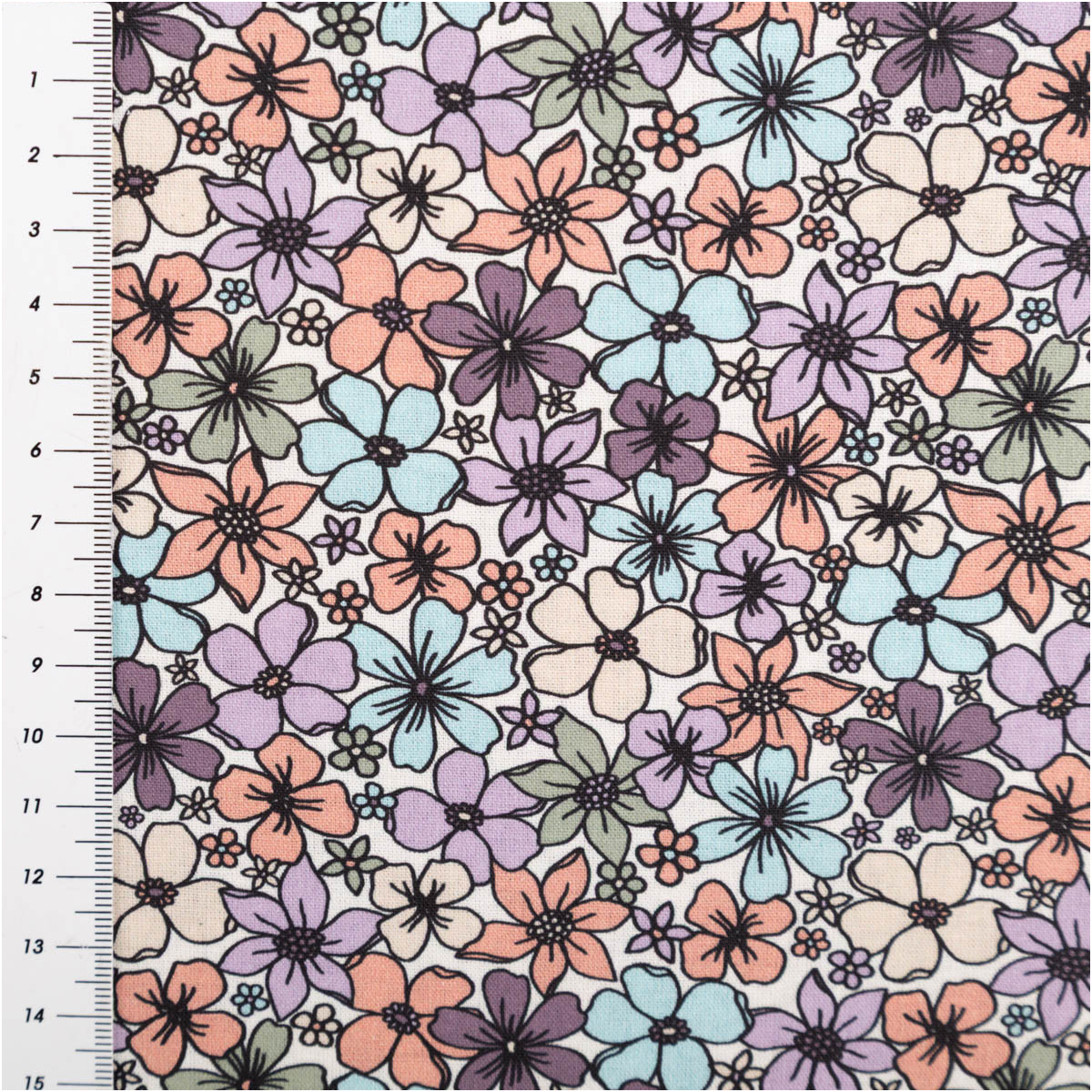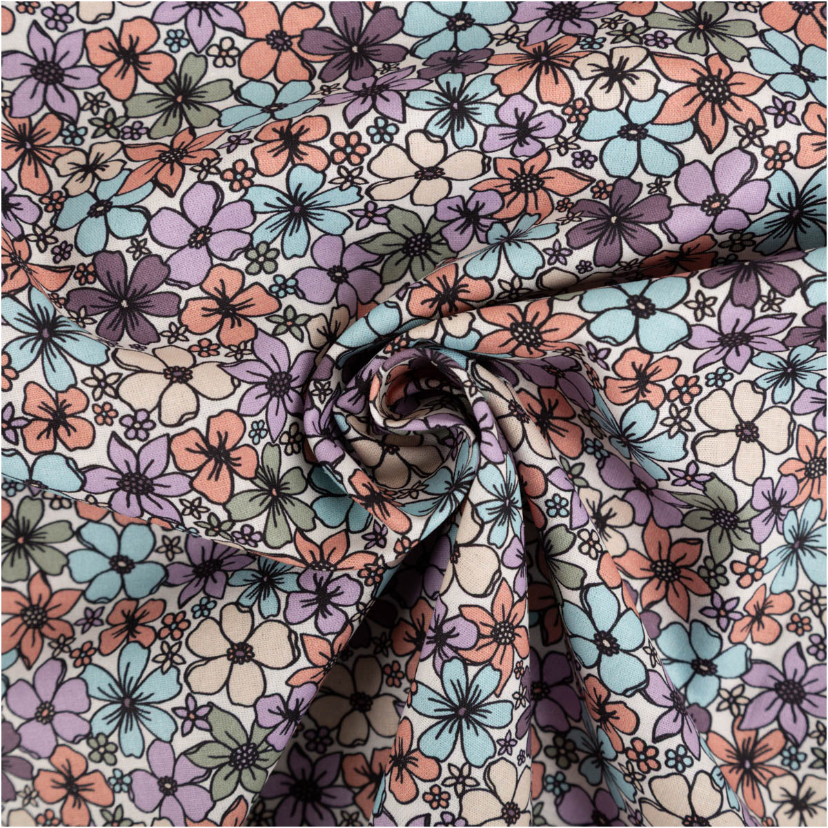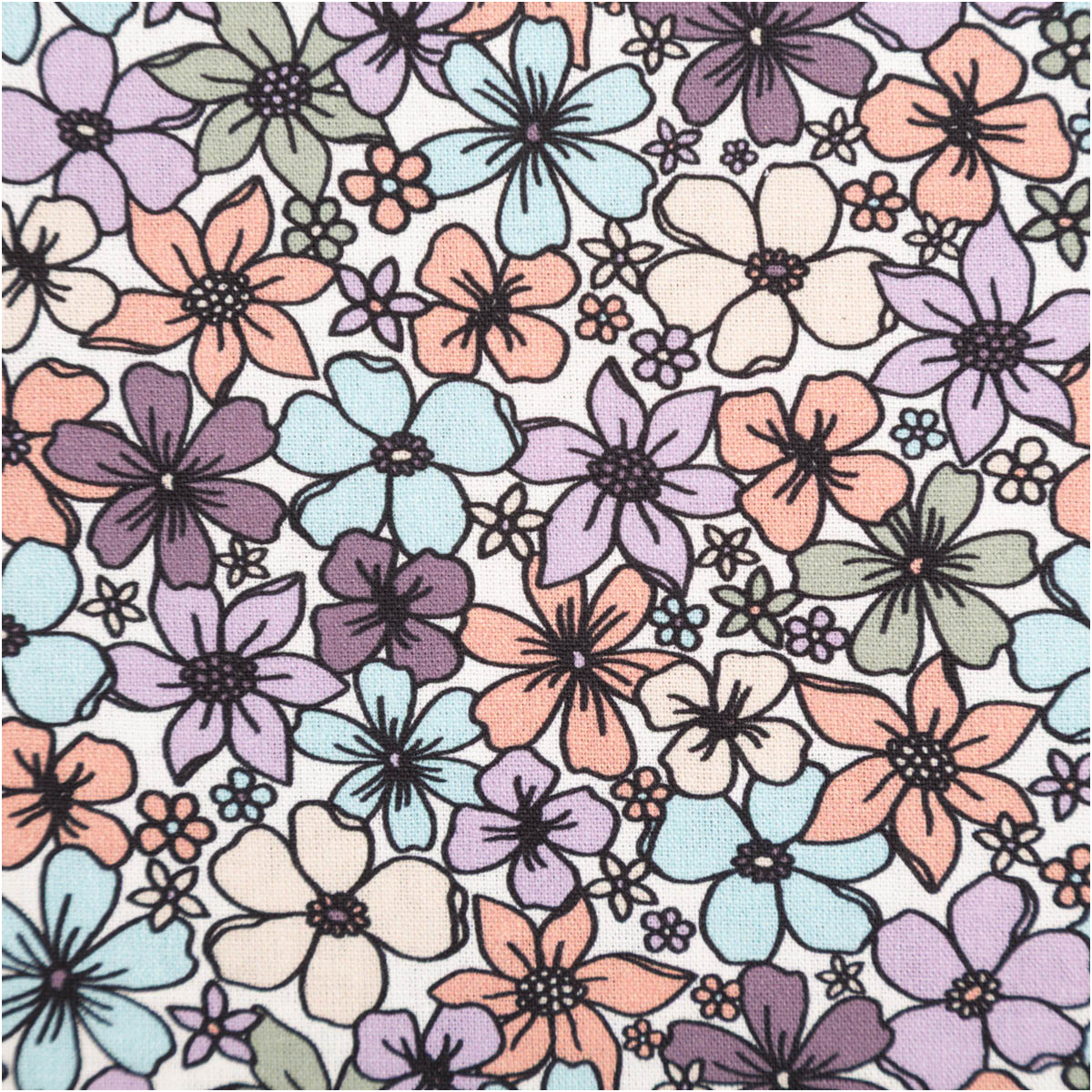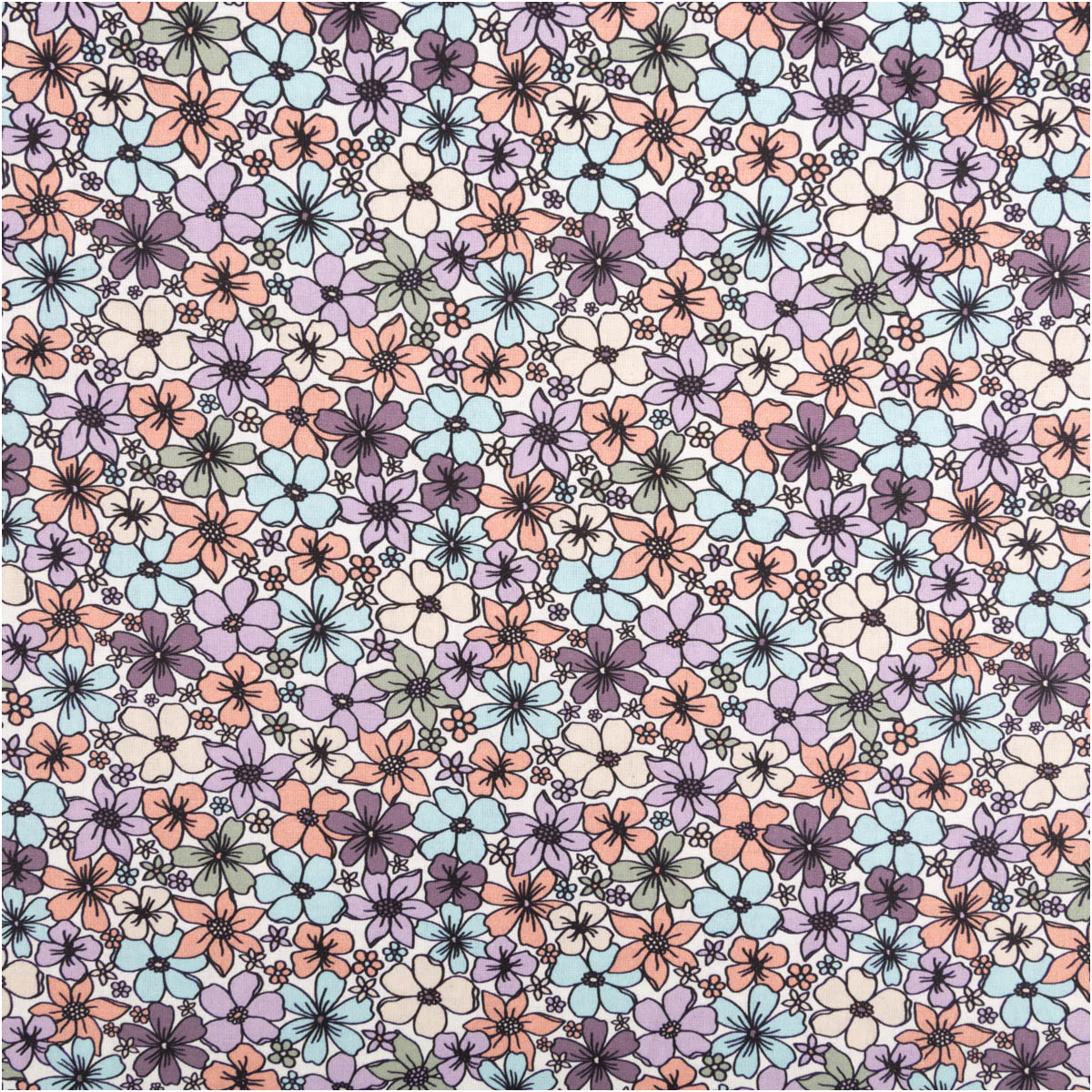 Dieser Baumwollstoff begeistert mit einem dichten Blütenmuster in vielen harmonischen Farben. Auf dem wollweißen Hintergrund entfalten sich kleine Blumen in Rosa, Lila, Blau, Grün und Apricot und sorgen für eine lebendige, freundliche Ausstrahlung.