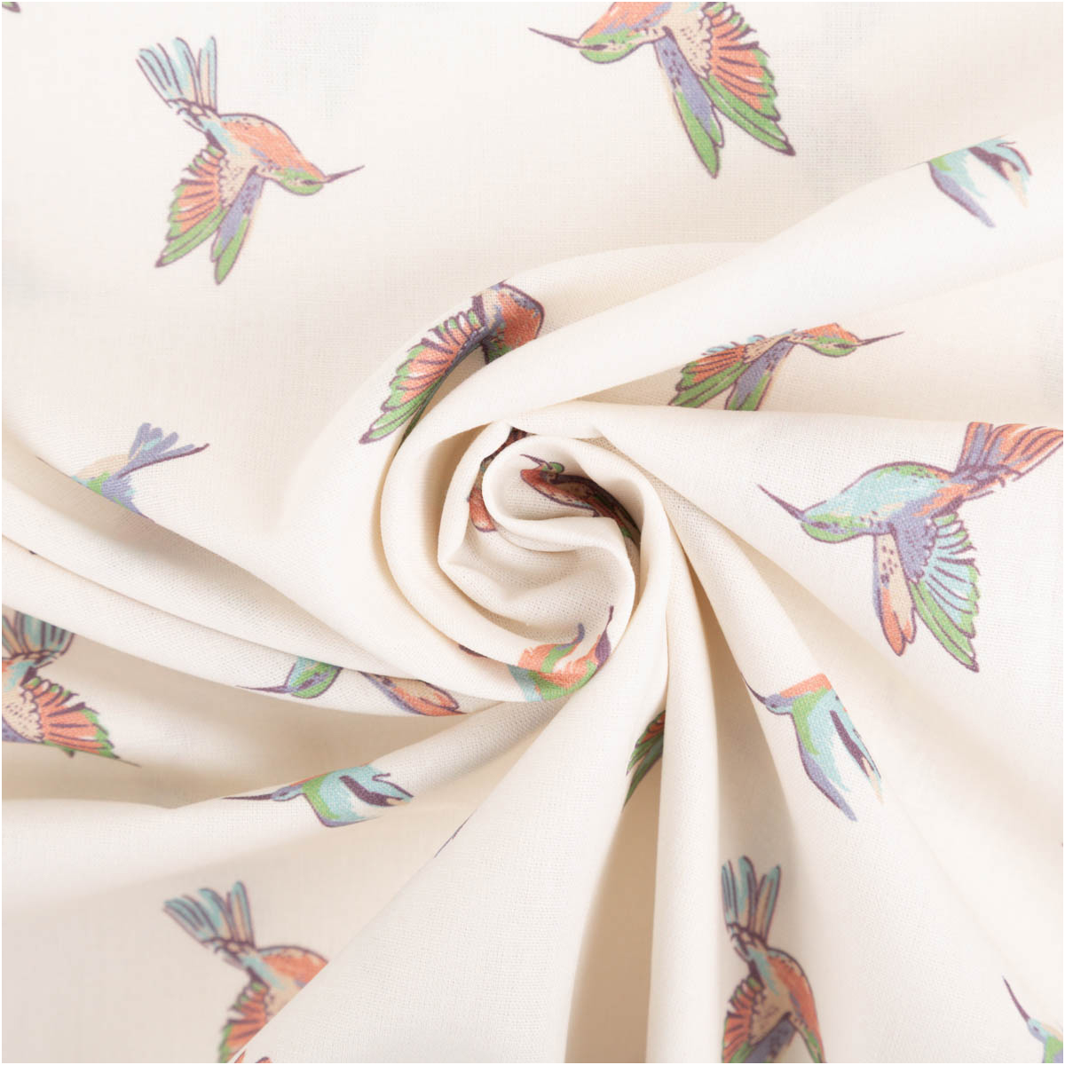 Leichter Baumwollstoff Popeline mit farbenfrohem Kolibri Motiv auf wollweißem Hintergrund