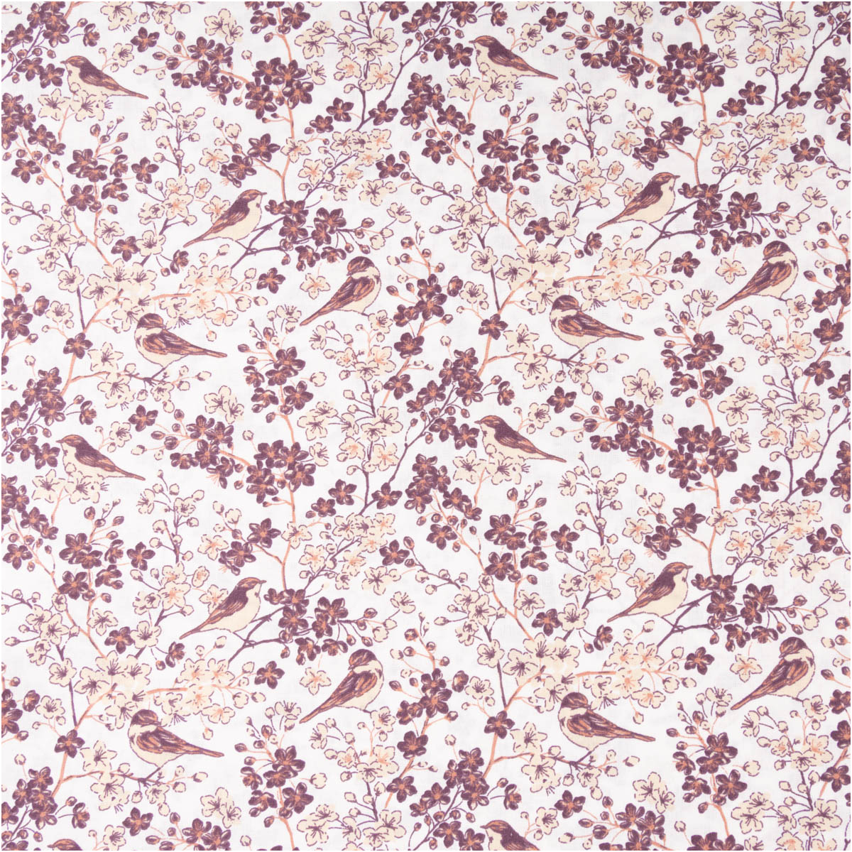 Dieser Baumwollstoff in feiner Popeline-Qualität überzeugt mit einem liebevoll gestalteten Muster aus kleinen Vögeln und filigranen Blüten. Die harmonische Farbkombination aus Wollweiß, Beige und Weinrot verleiht dem Stoff eine ruhige, natürliche Ausstrahlung.