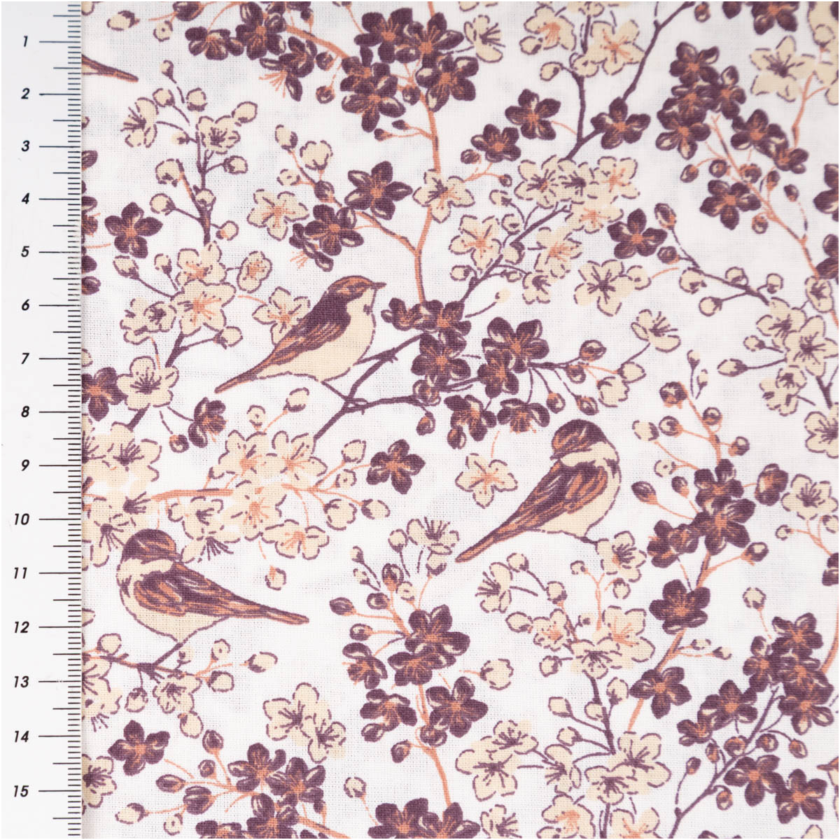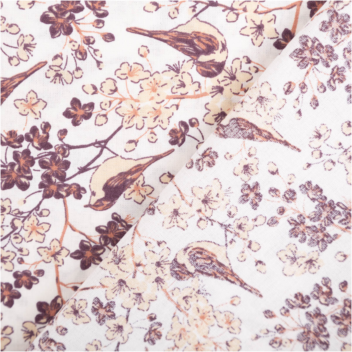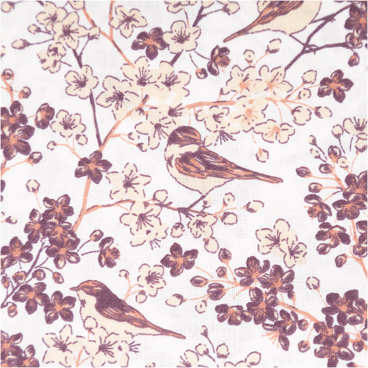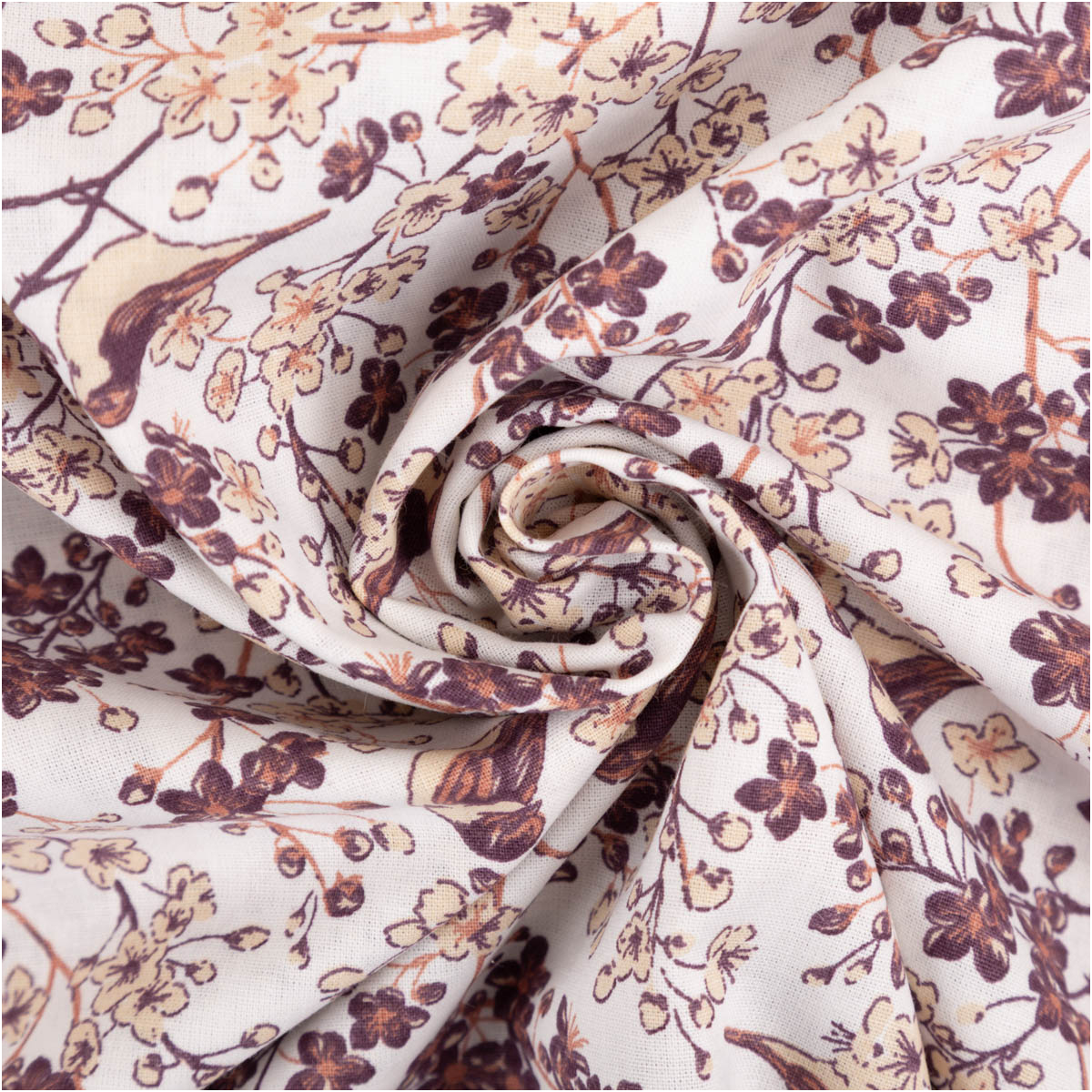 Floraler Baumwollstoff mit Vögeln – natürlich und detailreich