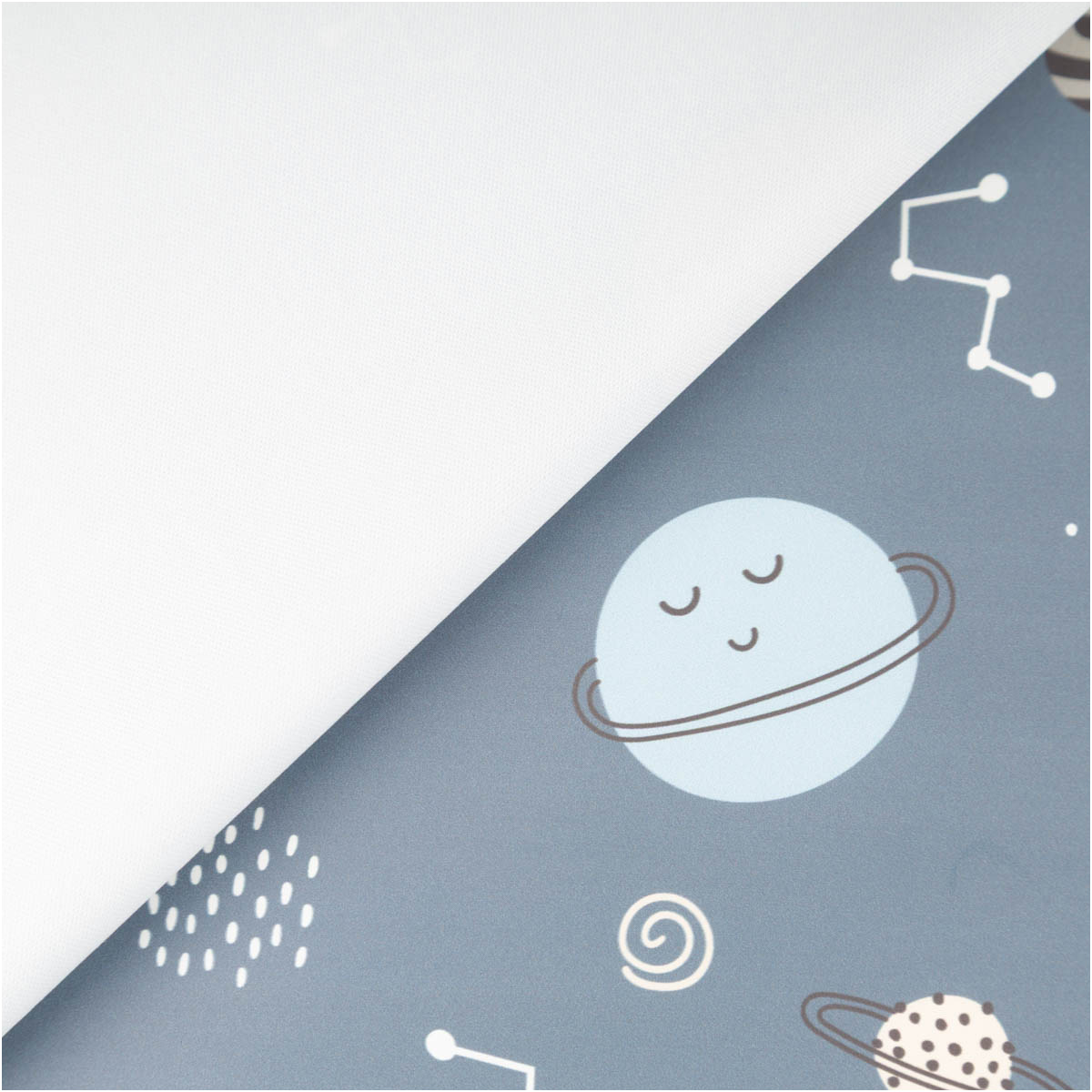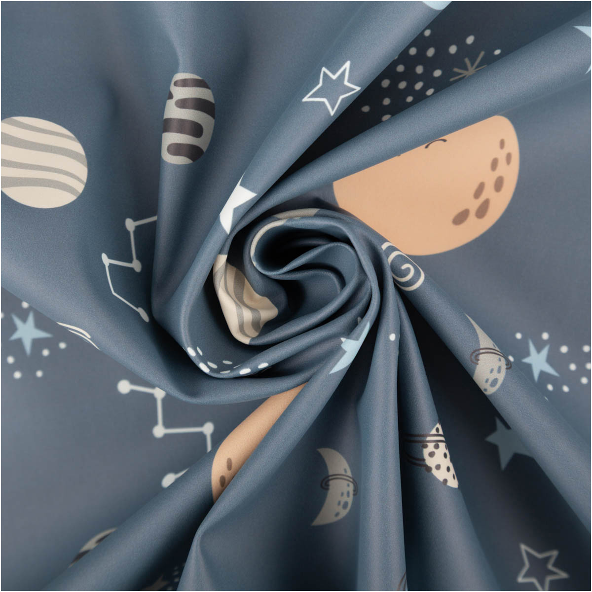 Space-Look trifft Wetterschutz: Der Aqua-Protect-Regenjackenstoff in Blau mit Planeten und Sternen ist wasserdicht, weich und 145 cm breit – perfekt für wetterfeste Lieblingsstücke.