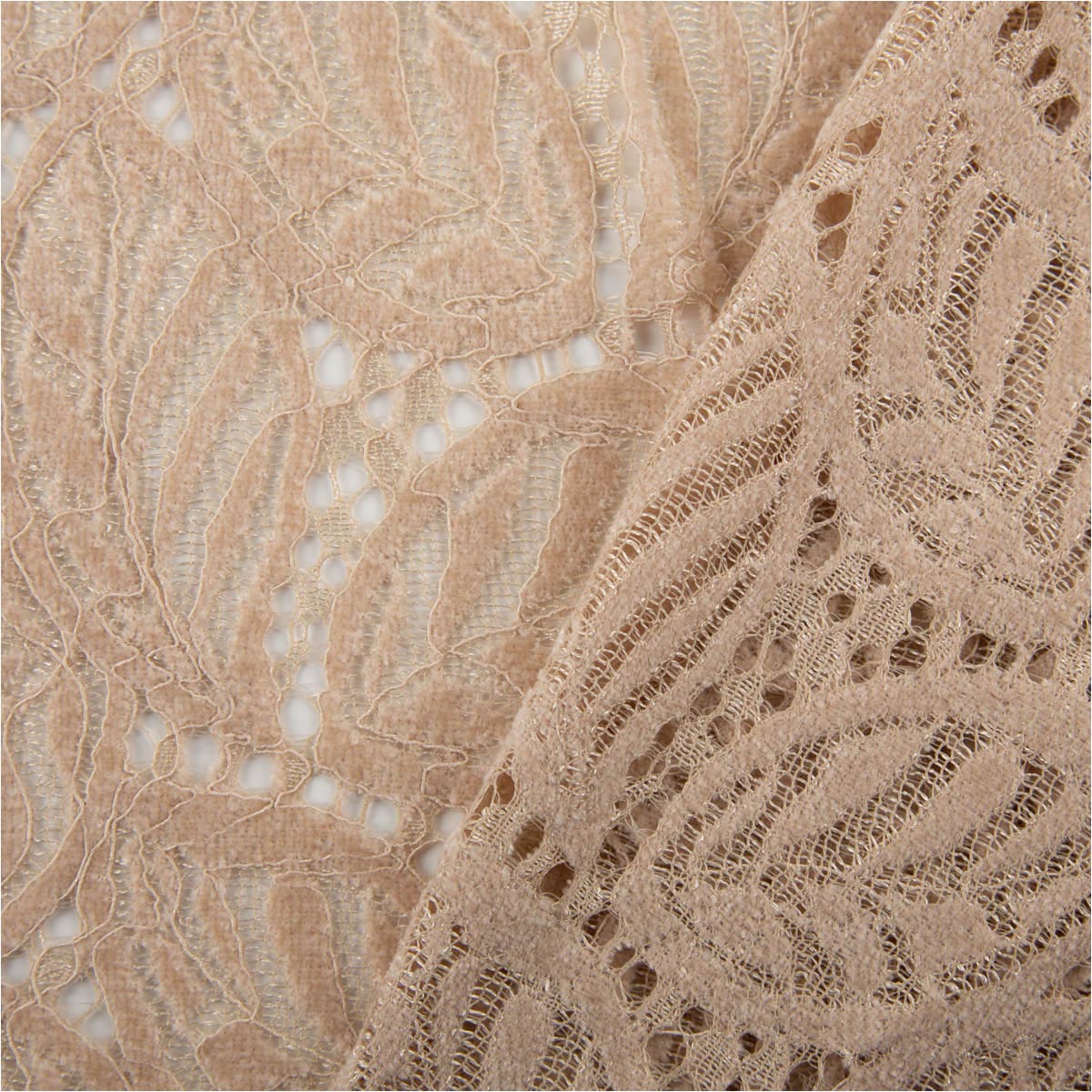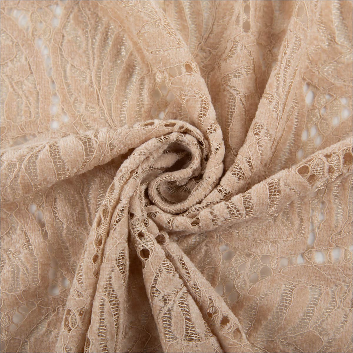 Zarte Chenille-Spitze in Beige: halbtransparent, weich im Griff und schadstoffgeprüft. Perfekt für Trachten- und Festtagsmode, Braut-Accessoires sowie dekorative Projekte von Tischläufern bis festlichen Drapierungen