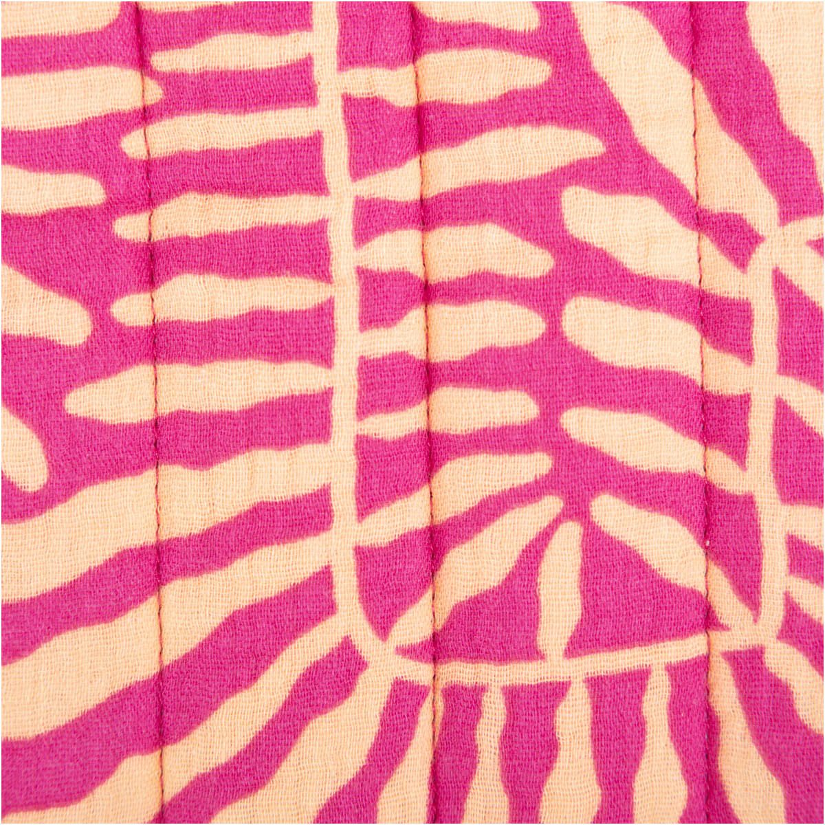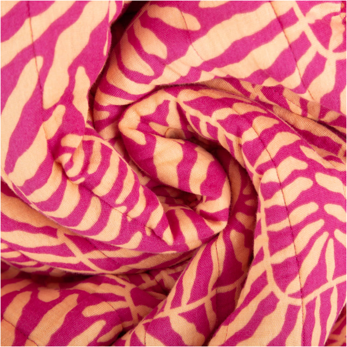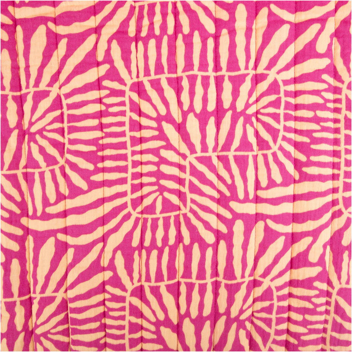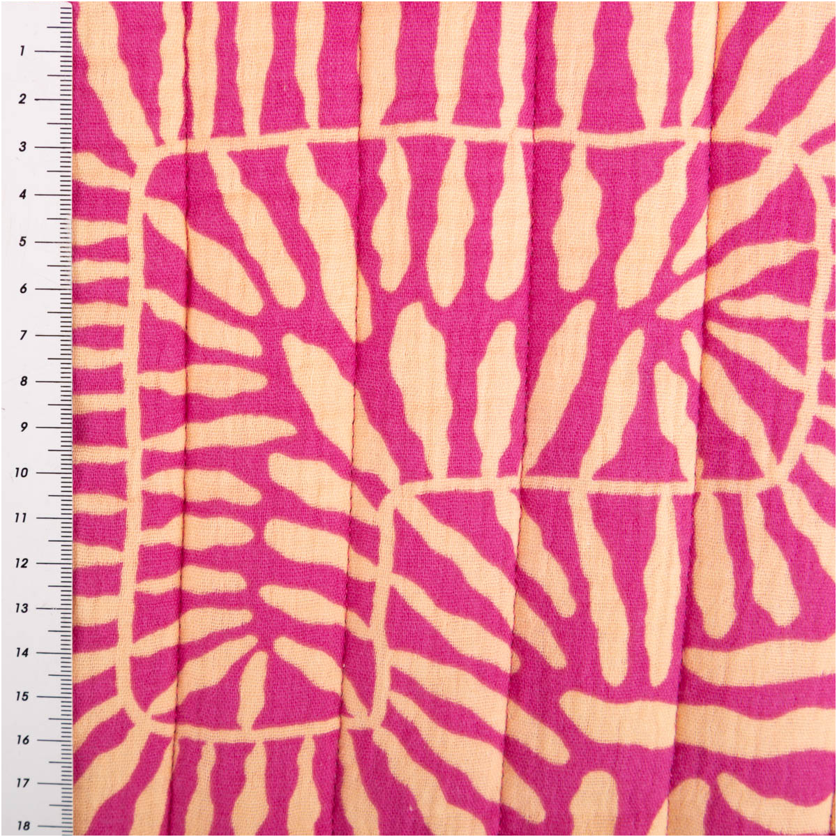 Dieser Steppstoff aus Musselin verbindet eine moderne Optik mit angenehmem Komfort. Die Kombination aus kräftigem Fuchsia und warmem Beige sorgt für einen lebendigen Look, während das abstrakt-florale Muster dem Stoff eine besondere Ausstrahlung verleiht.