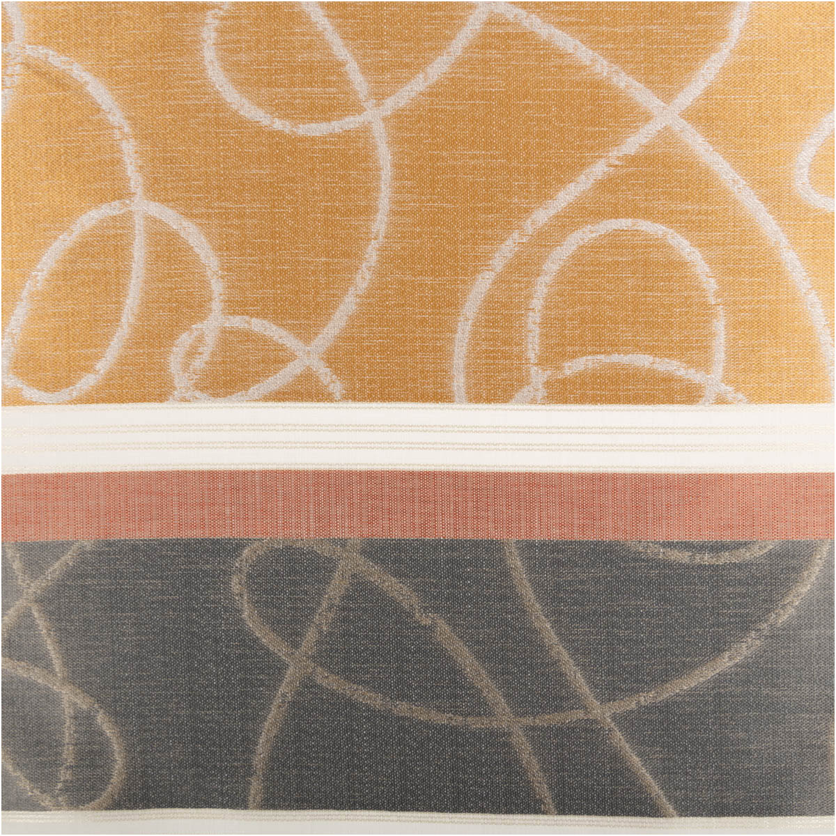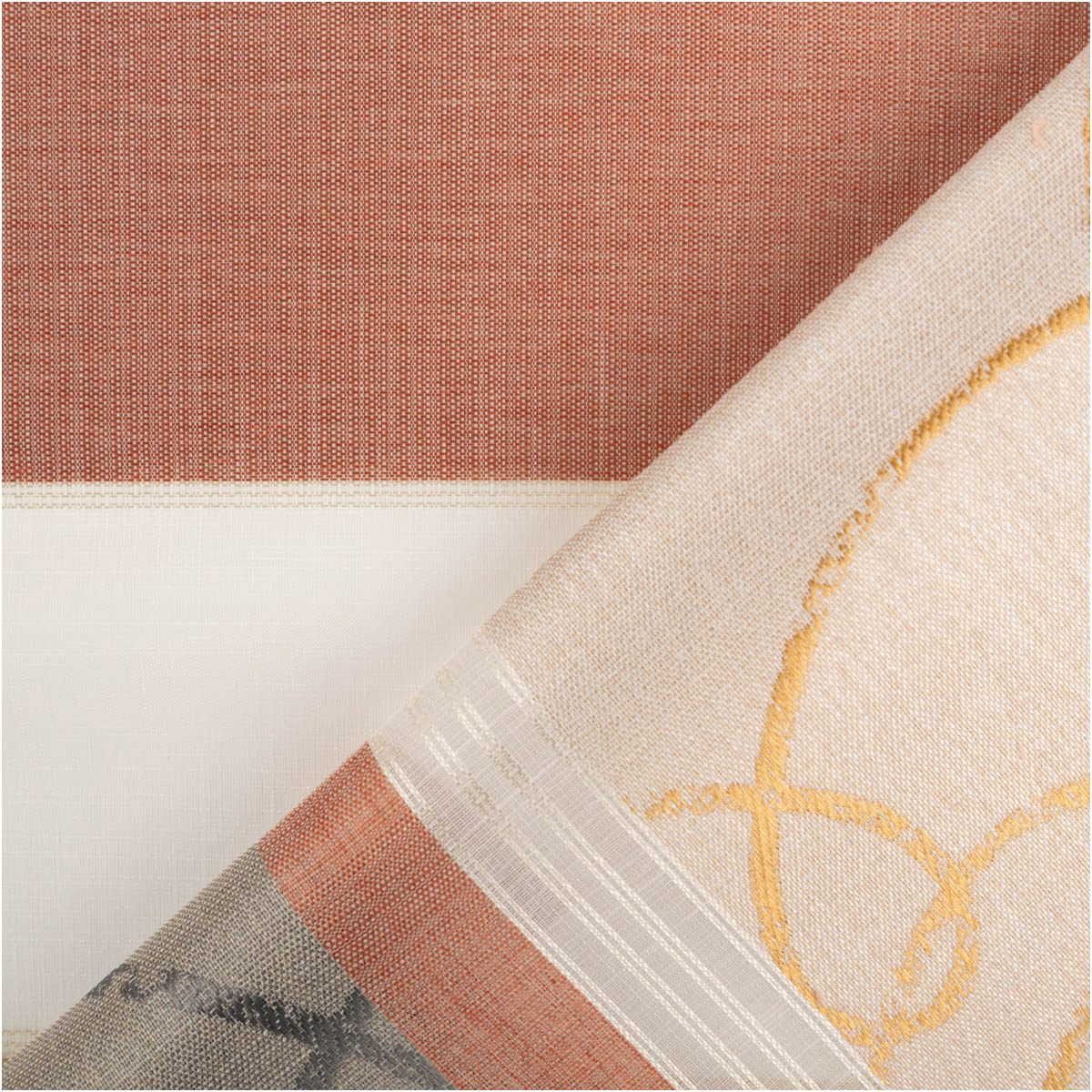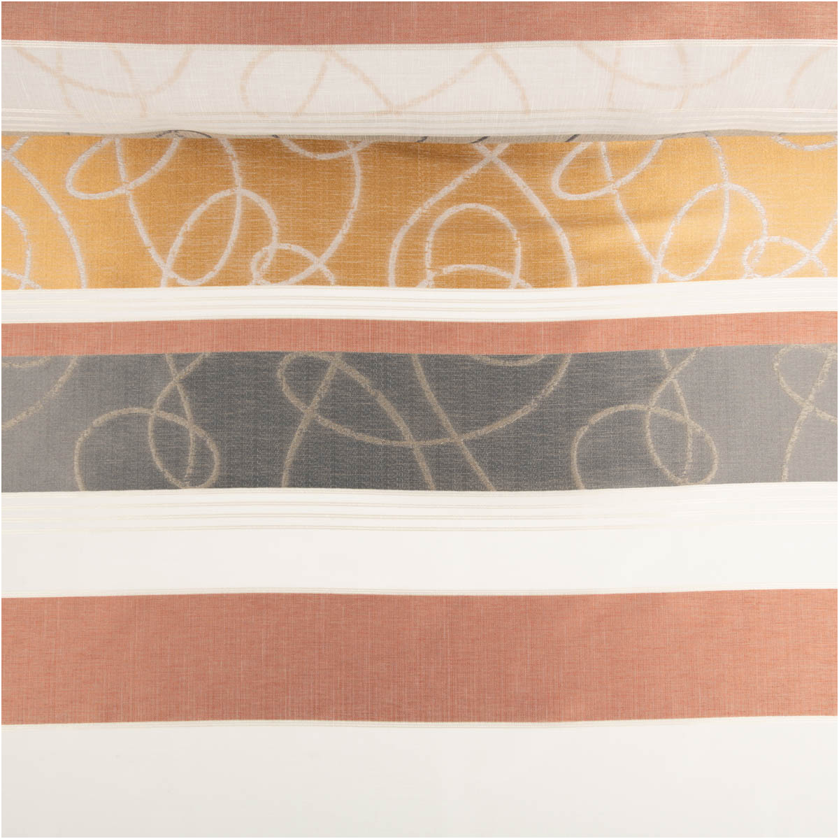 HOCHWERTIGER VOILE MIT JACQUARD – Halbtransparenter Gardinenstoff mit eingewebten Querstreifen und elegantem Dessin in Kupfer, Gold und Grau für eine moderne Fensterdekoration