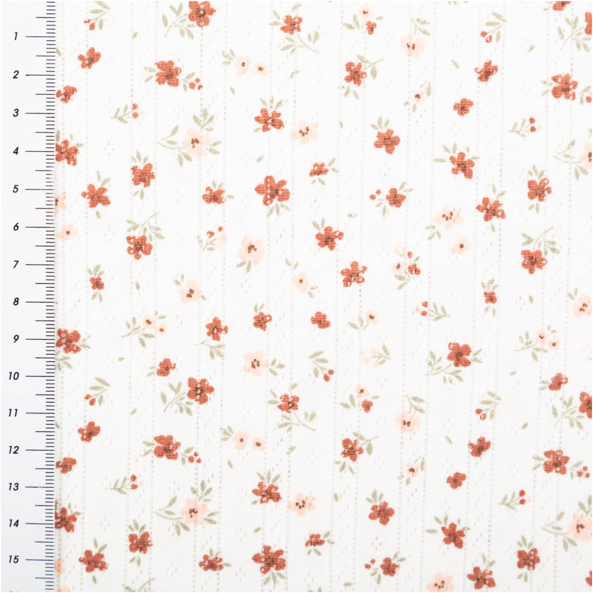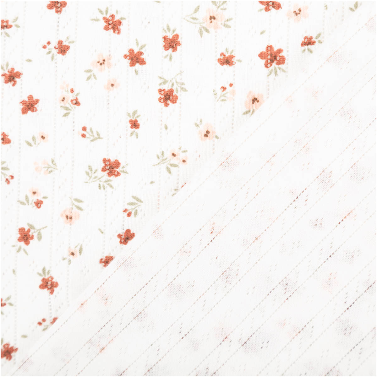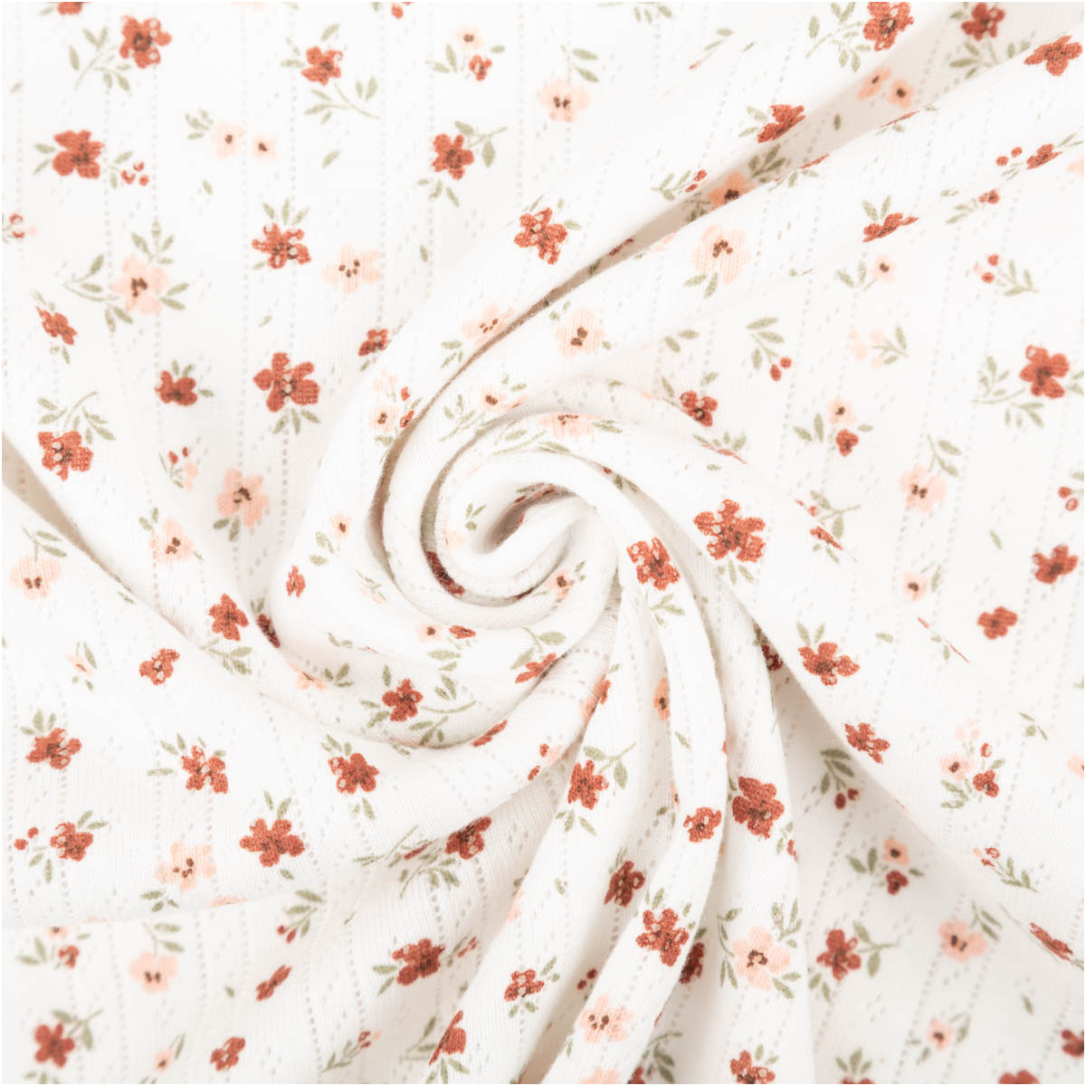 Qualität: Ajour/Pointelle-Strick • Material: 100 % Baumwolle • Breite: ca. 145 cm • Farbe: Wollweiß • Dessin: kleine Streublümchen • Eigenschaften: weich, atmungsaktiv, leicht elastisch, schadstofffrei