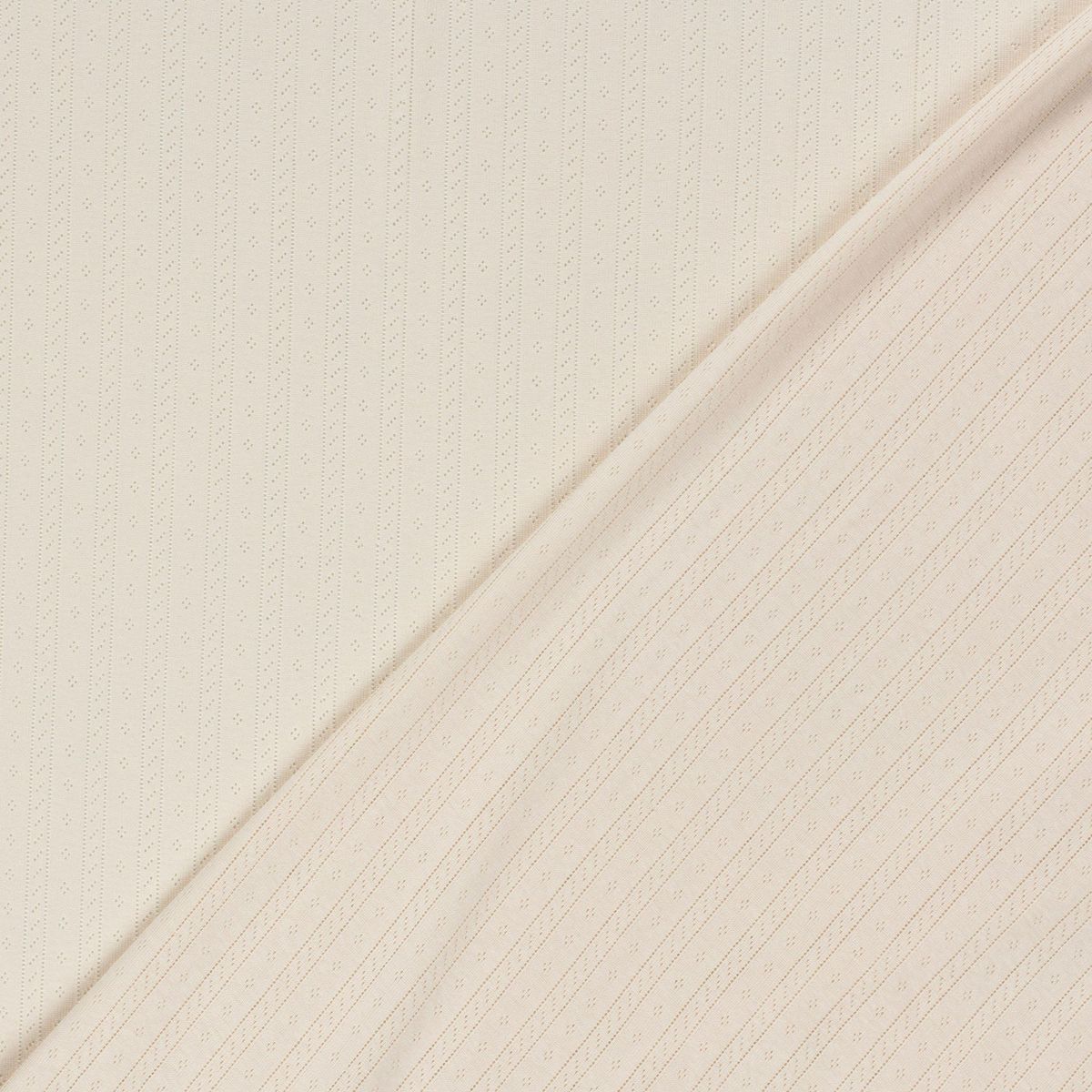 Die feine Lochmuster-Struktur mit schmalen Streifen verleiht dem Stoff eine elegante, natürliche Optik und sorgt gleichzeitig für eine angenehme Luftdurchlässigkeit. Durch die Strickbindung ist der Stoff leicht elastisch und fällt wunderbar weich – ideal für Projekte, die direkt auf der Haut getragen werden.