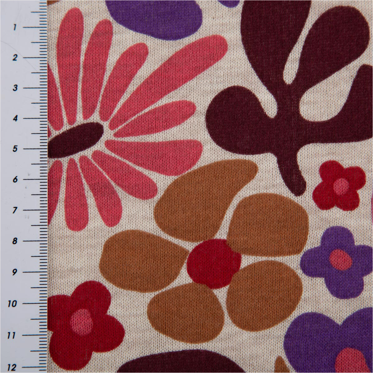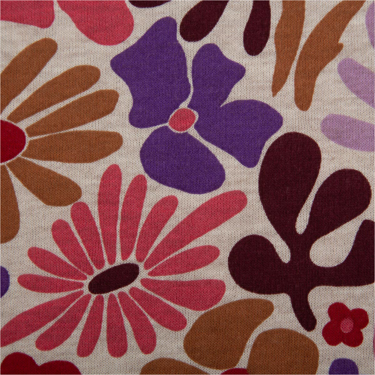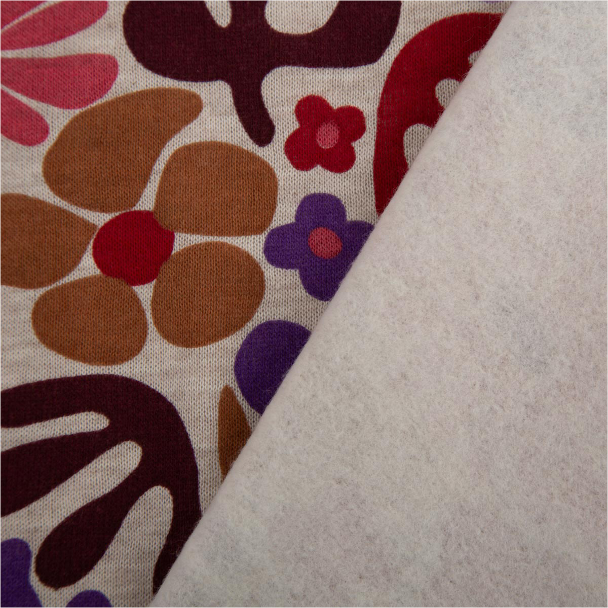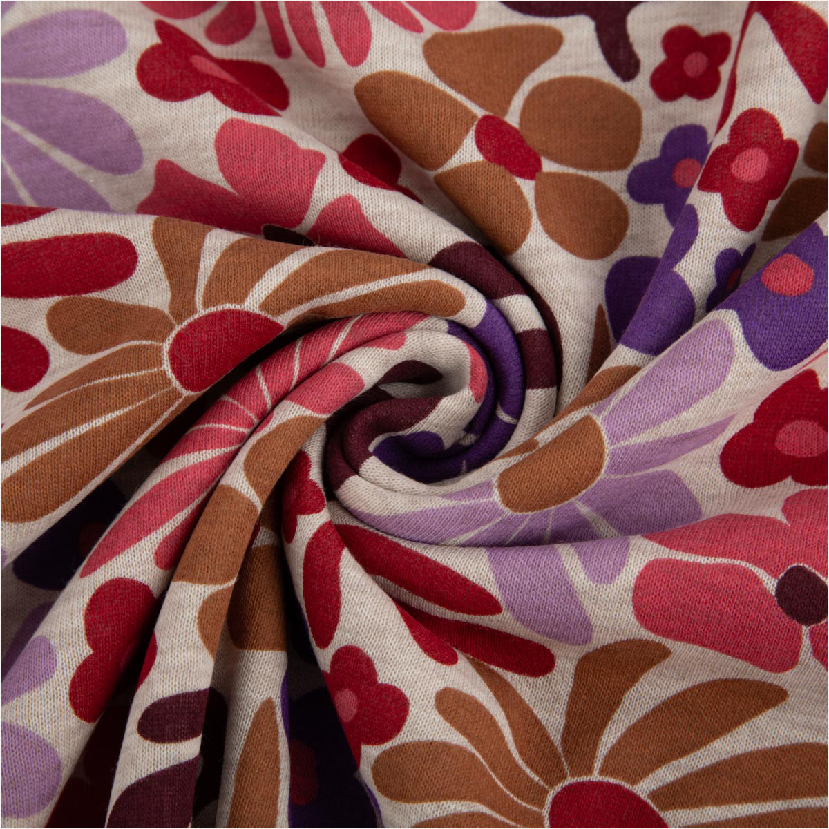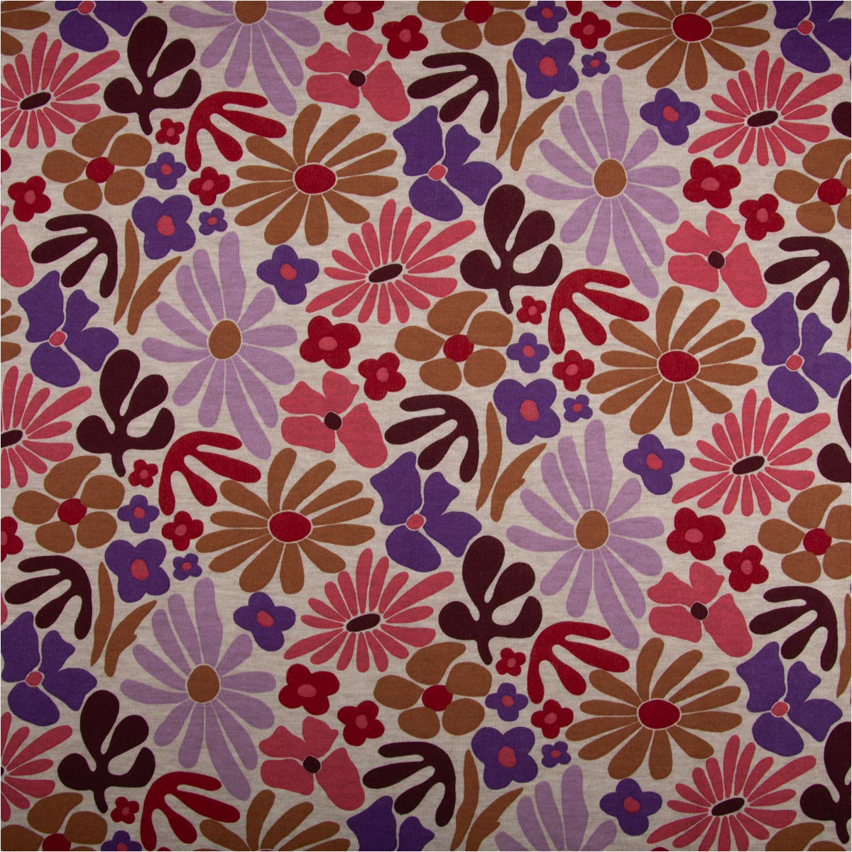 Du suchst einen weichen, gemütlichen Stoff mit besonderem Design? Dieser Sweatstoff mit abstraktem Blumen- und Blütenmuster aus der Poppy Fabrics Kollektion vereint Komfort und moderne Optik. Der naturfarbig melierte Grundton wird durch florale Formen in Rosa, Lila und Rot ergänzt und macht jedes Nähprojekt zu einem echten Hingucker.