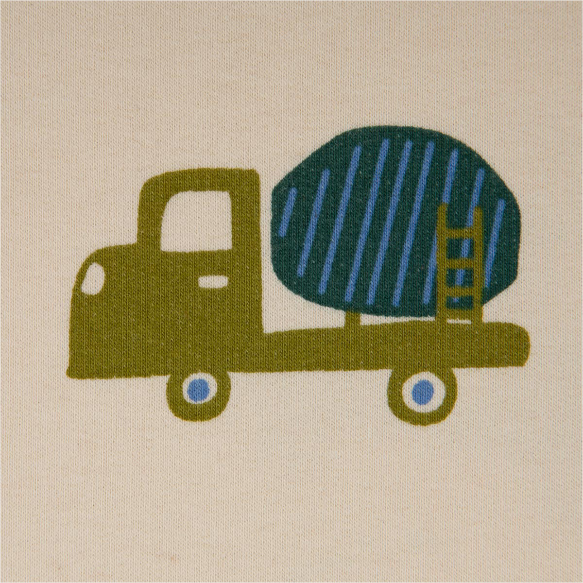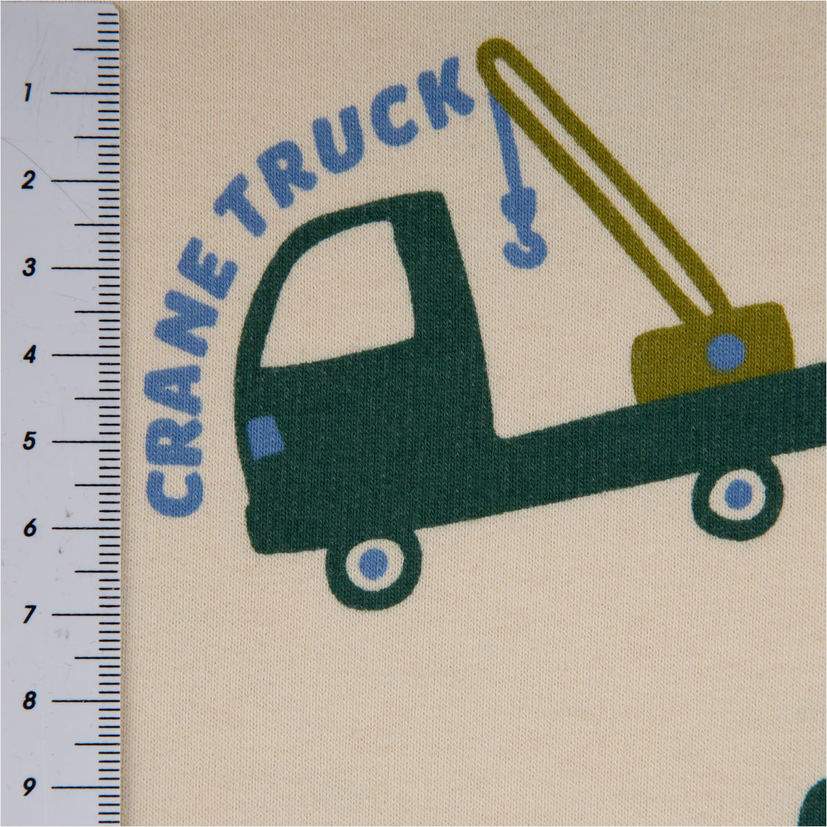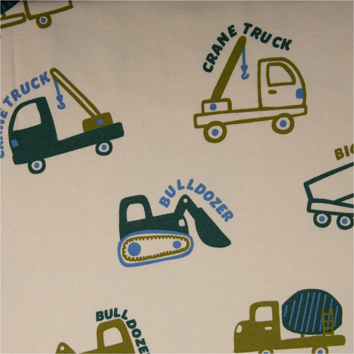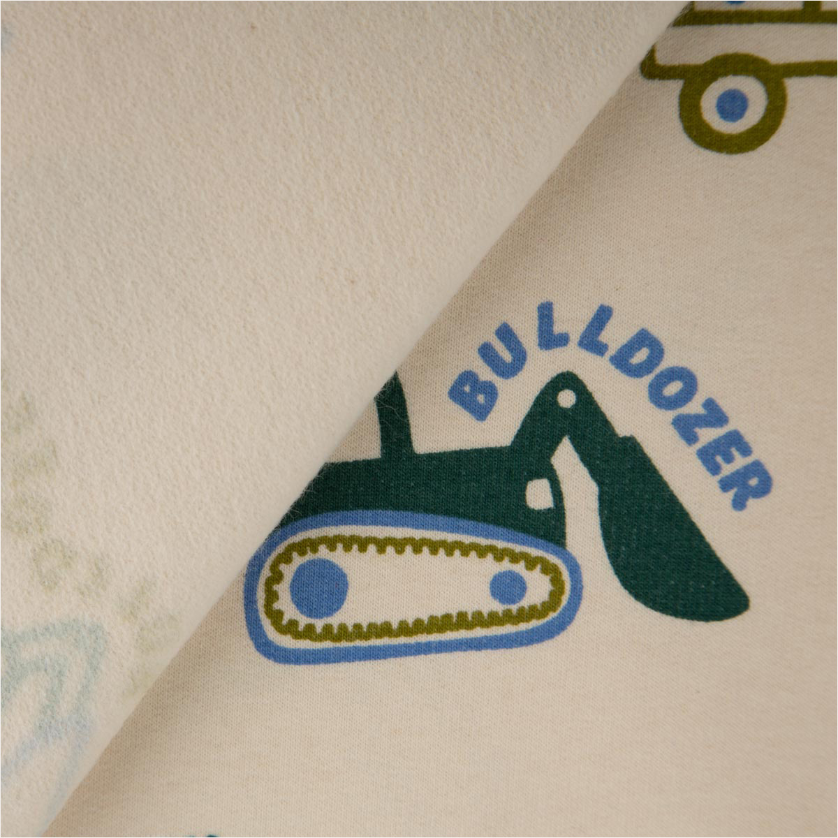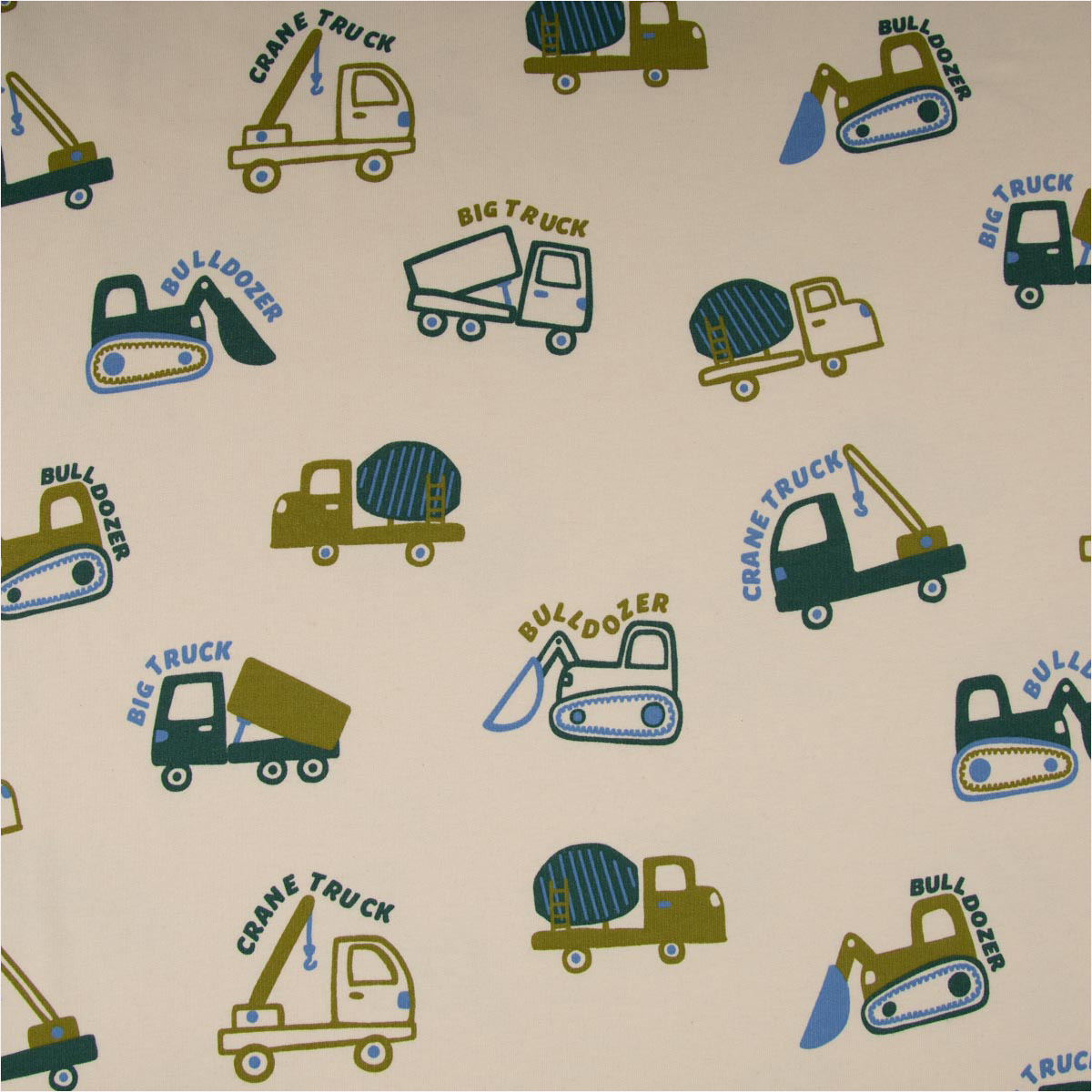 Sweatstoff Soft Sweat Baumwolle Baufahrzeuge ecru grün blau – 1,48 m breit